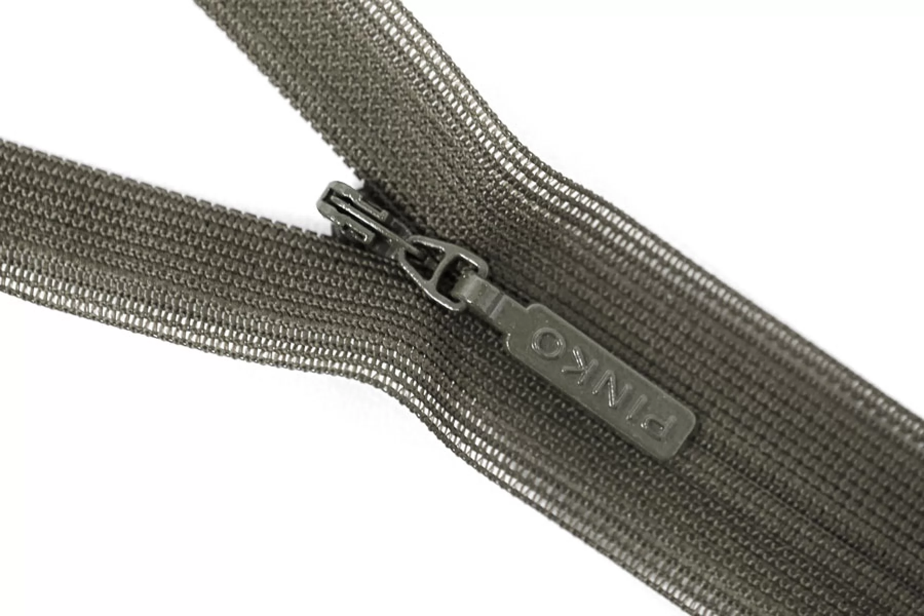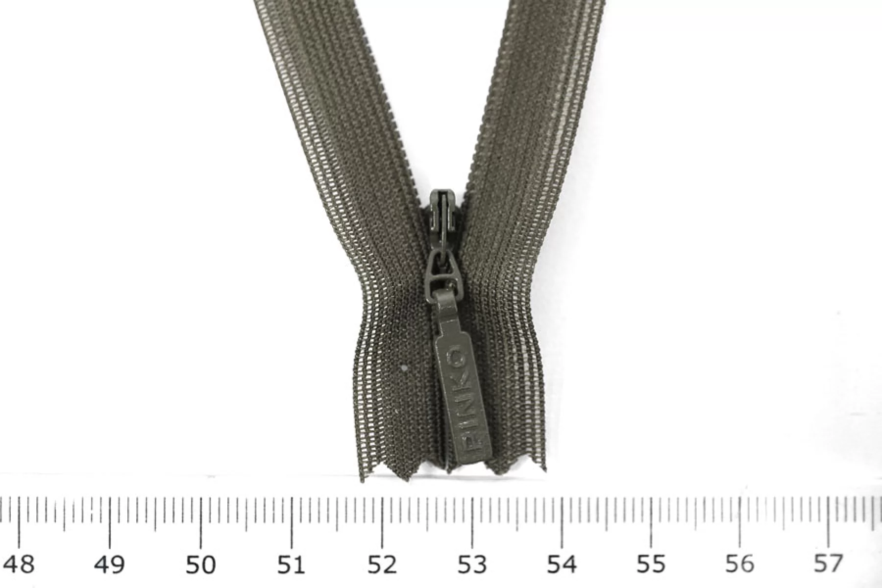 Потайная молния цвета хаки PINKO , длина 20 см. Слайдер и пуллер - метал. в цвет молнии. Ширина молнии 2.2 см , ширина зубцов 4мм.