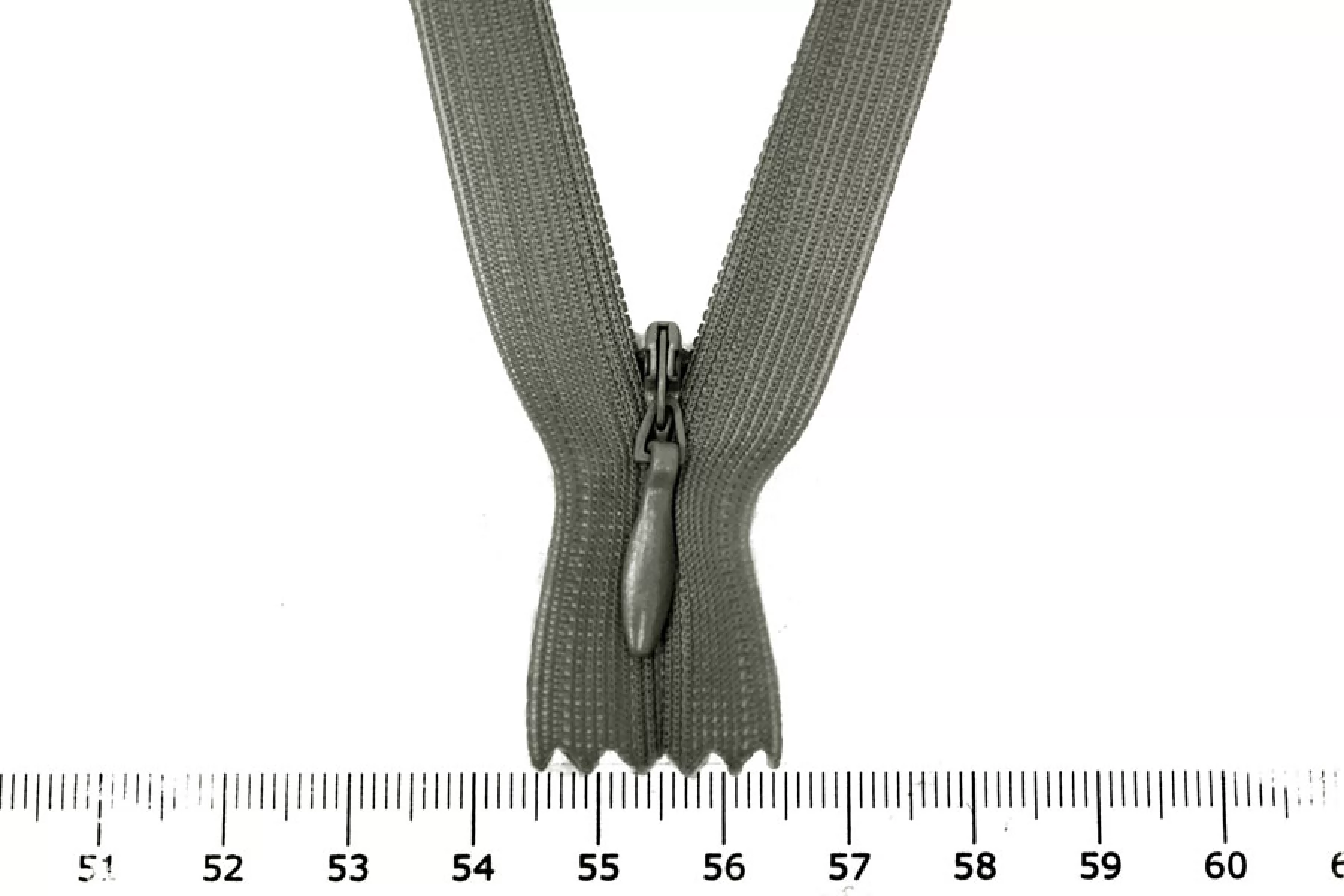 Потайная молния цвета хаки , длина 26 см. Слайдер и пуллер - метал. в цвет молнии. Ширина молнии 2.2 см , ширина зубцов 4мм.