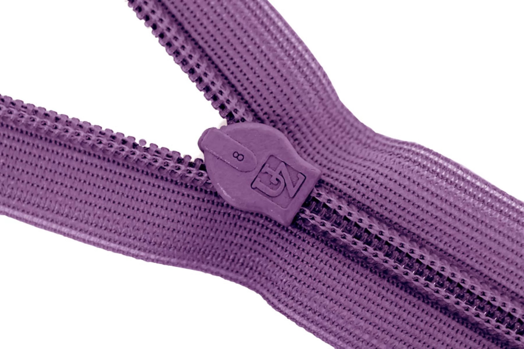 Потайная молния фиолетового цвета , длина 20 см. Неразъемная. Зубцы пластиковые, слайдер и пуллер - металл. Ширина молнии 2 см. Ширина зубцов 4 мм.