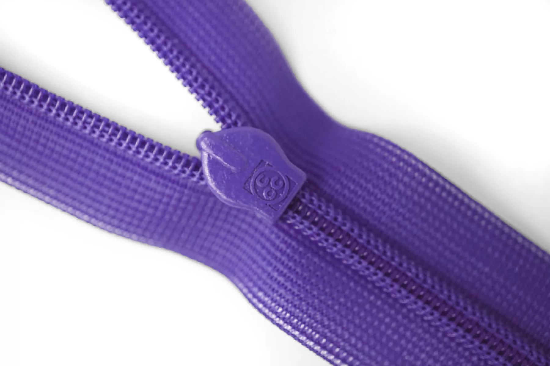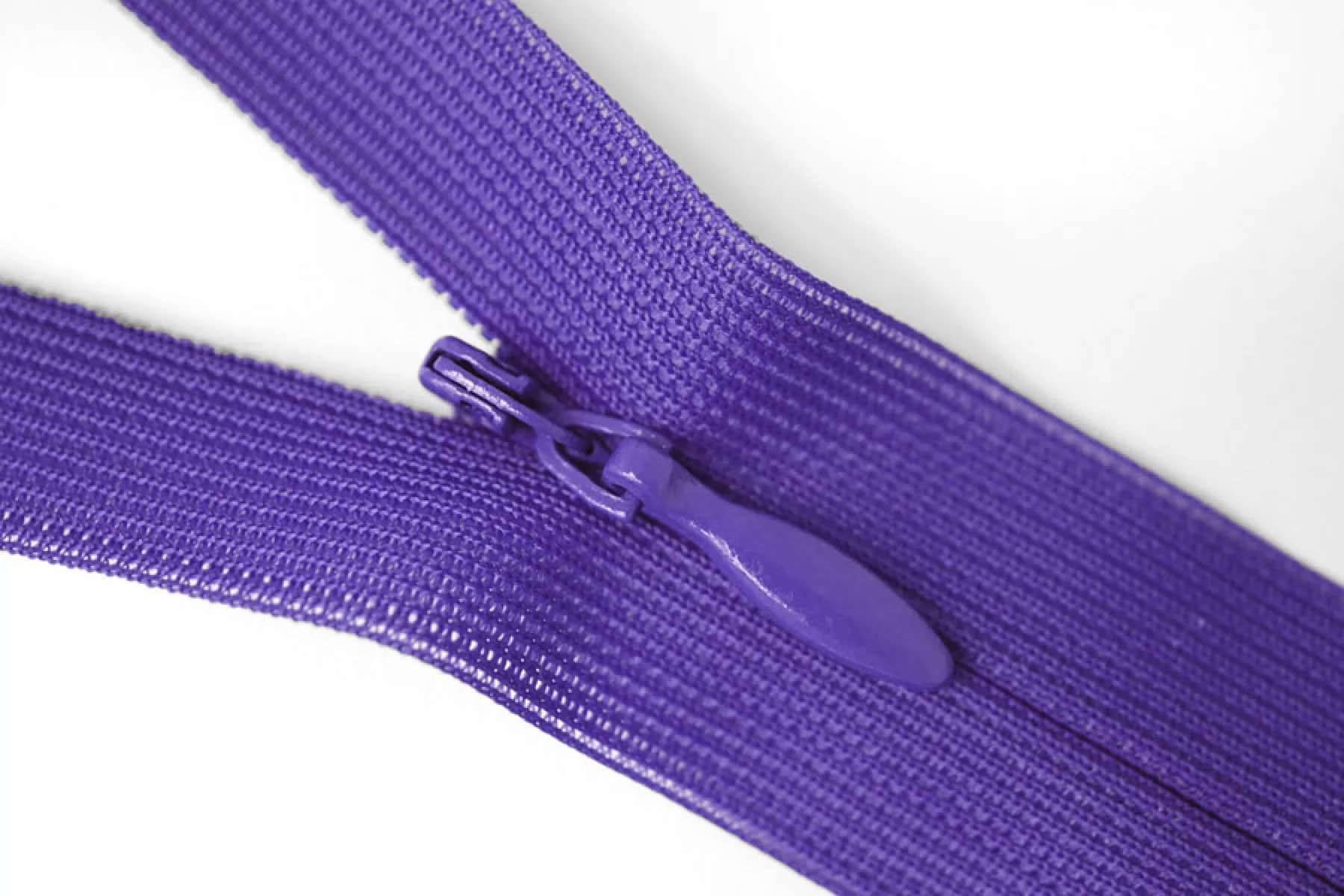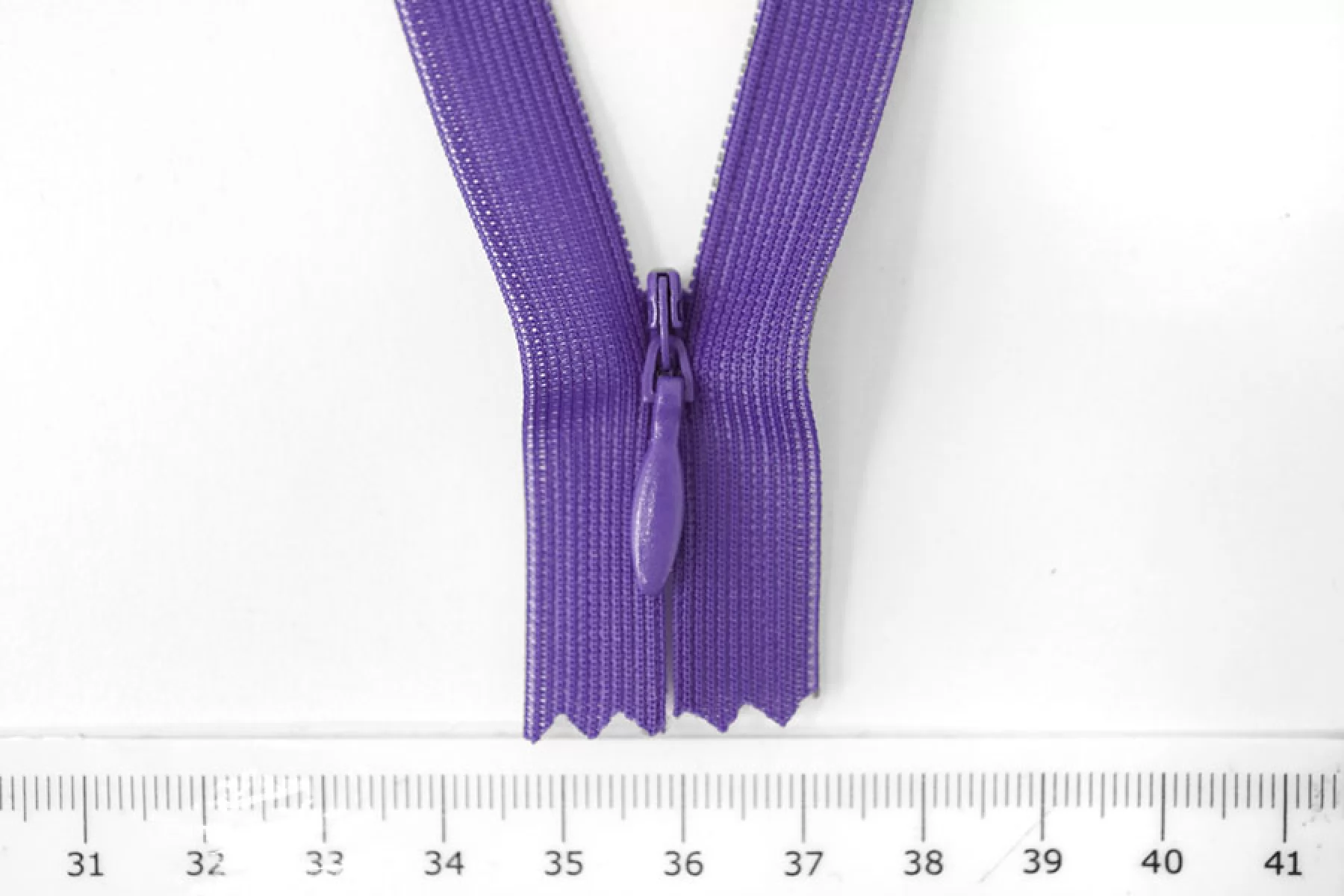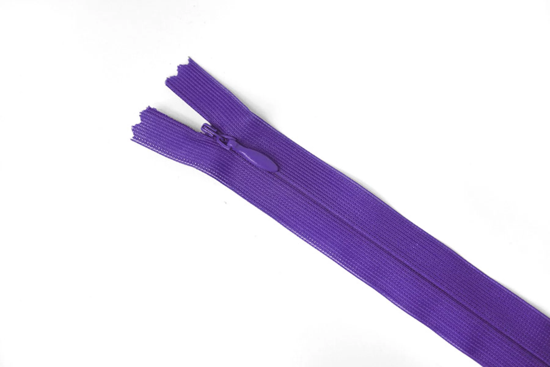 Потайная молния в фиолетовом цвете, длина 22 см. Неразъемная. Зубцы пластиковые, слайдер и пуллер - металл. Ширина молнии 2,3 см. Ширина зубцов 4 мм.