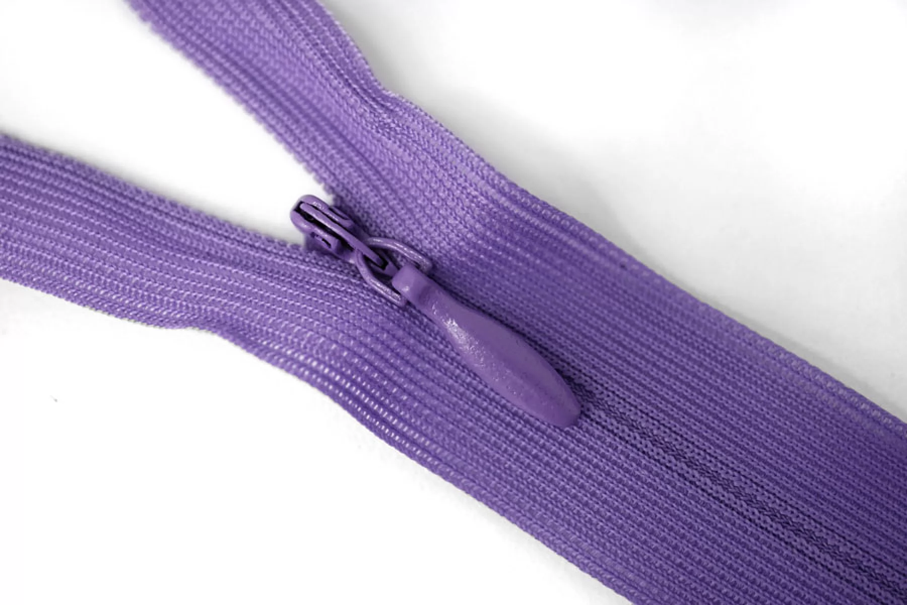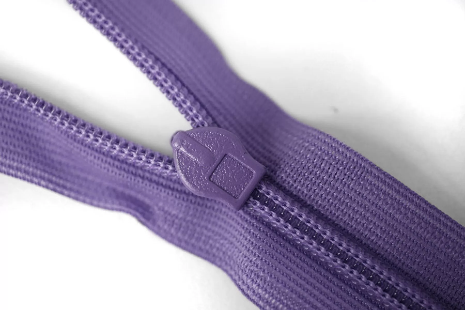 Потайная молния в фиолетовом цвете, длина 60 см. Неразъемная. Зубцы пластиковые, слайдер и пуллер - металл. Ширина молнии 2,3 см. Ширина зубцов 4 мм.