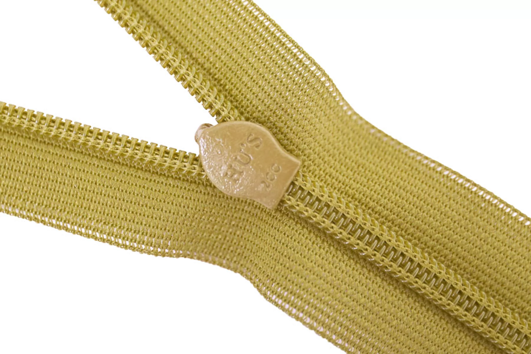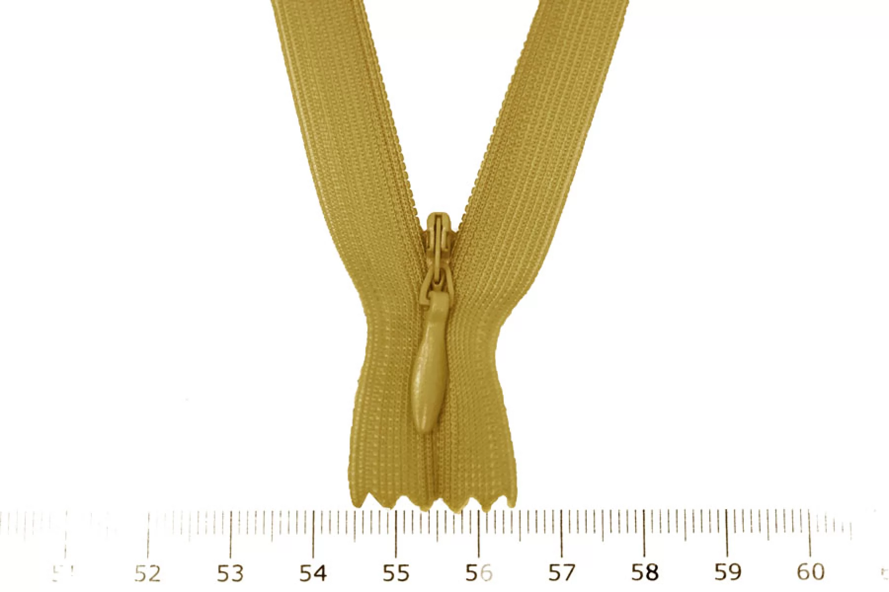 Потайная молния горчичного цвета от YKK, длина 22 см. Слайдер и пулер -металл. в цвет молнии. Ширина молнии 2,2 см, ширина зубцов 4мм.