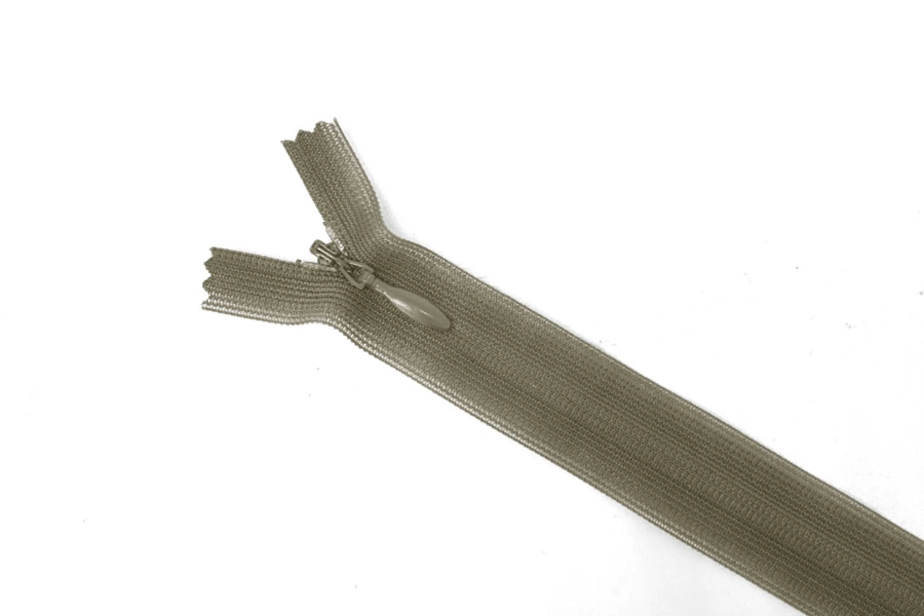 Потайная молния цвета хаки , длина 20 см. Слайдер и пуллер - метал. в цвет молнии. Ширина молнии 2.2 см , ширина зубцов 4мм.