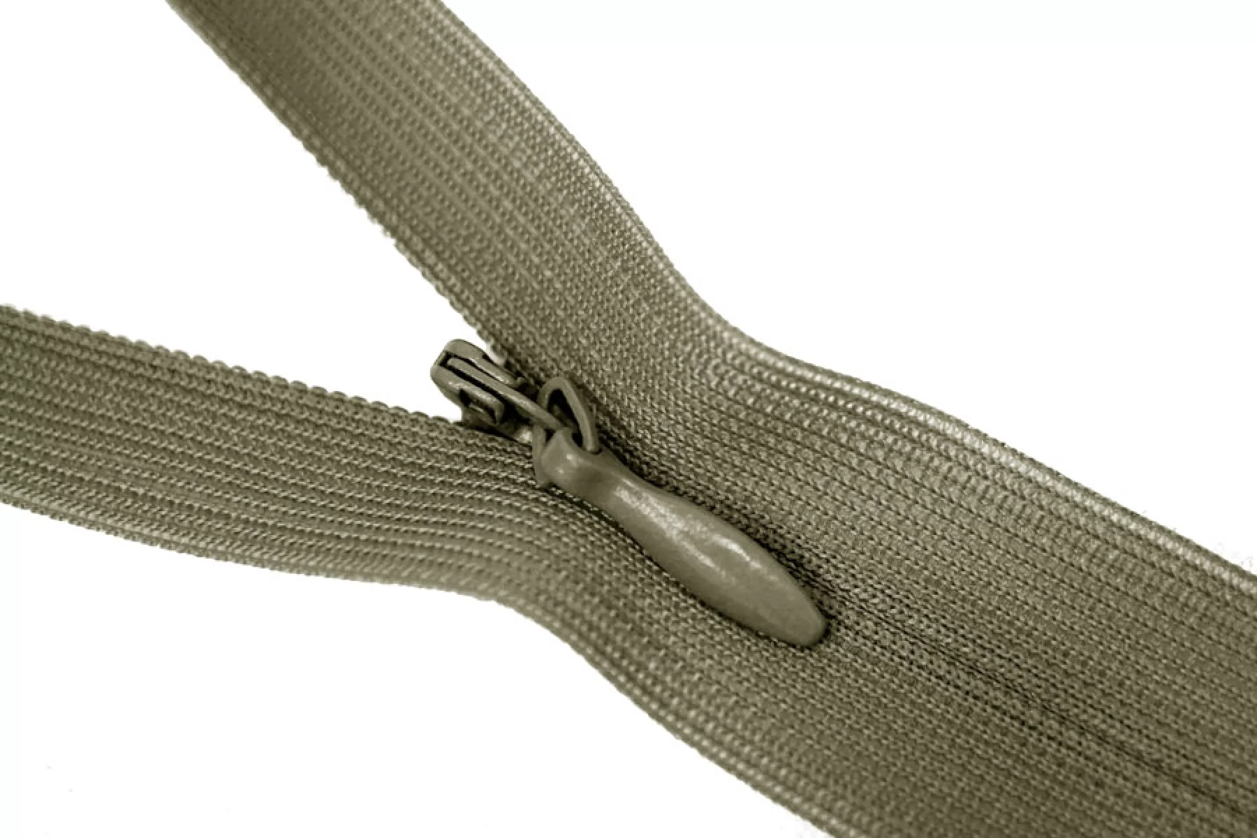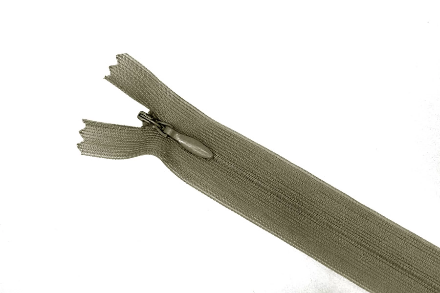 Потайная молния цвета хаки , длина 22 см. Слайдер и пуллер - метал. в цвет молнии. Ширина молнии 2.2 см , ширина зубцов 4мм.