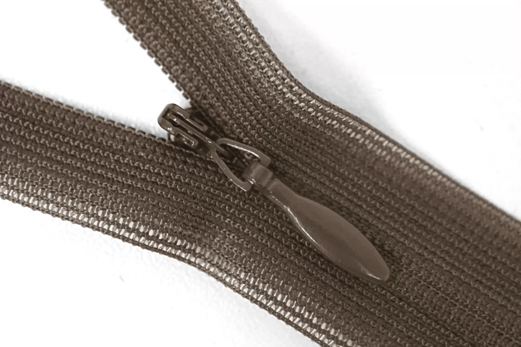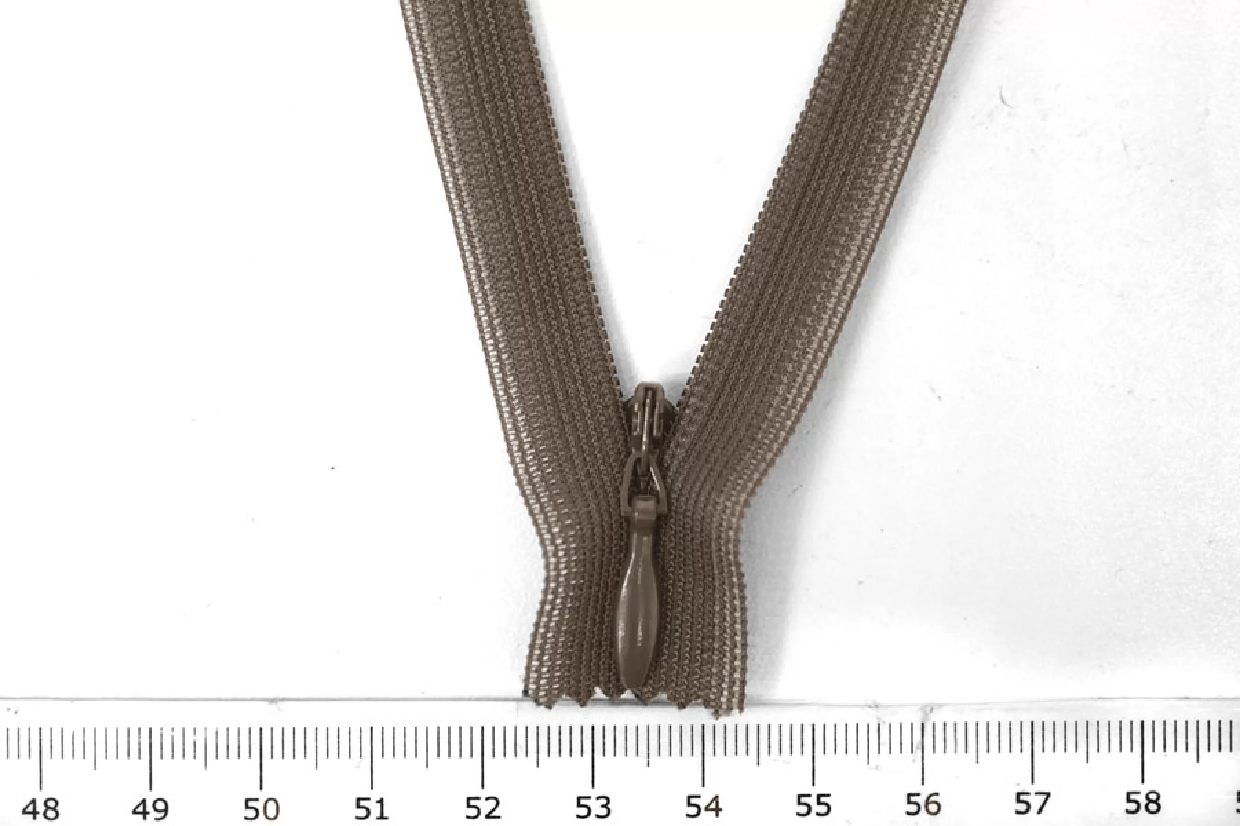 Потайная молния цвета хаки , длина 28 см. Слайдер и пуллер - метал. в цвет молнии. Ширина молнии 2.2 см , ширина зубцов 4мм.