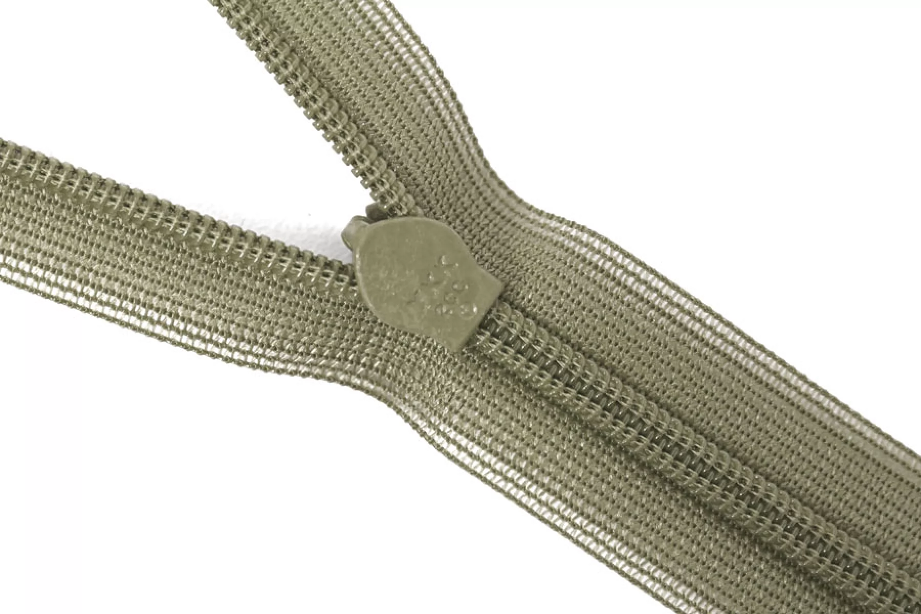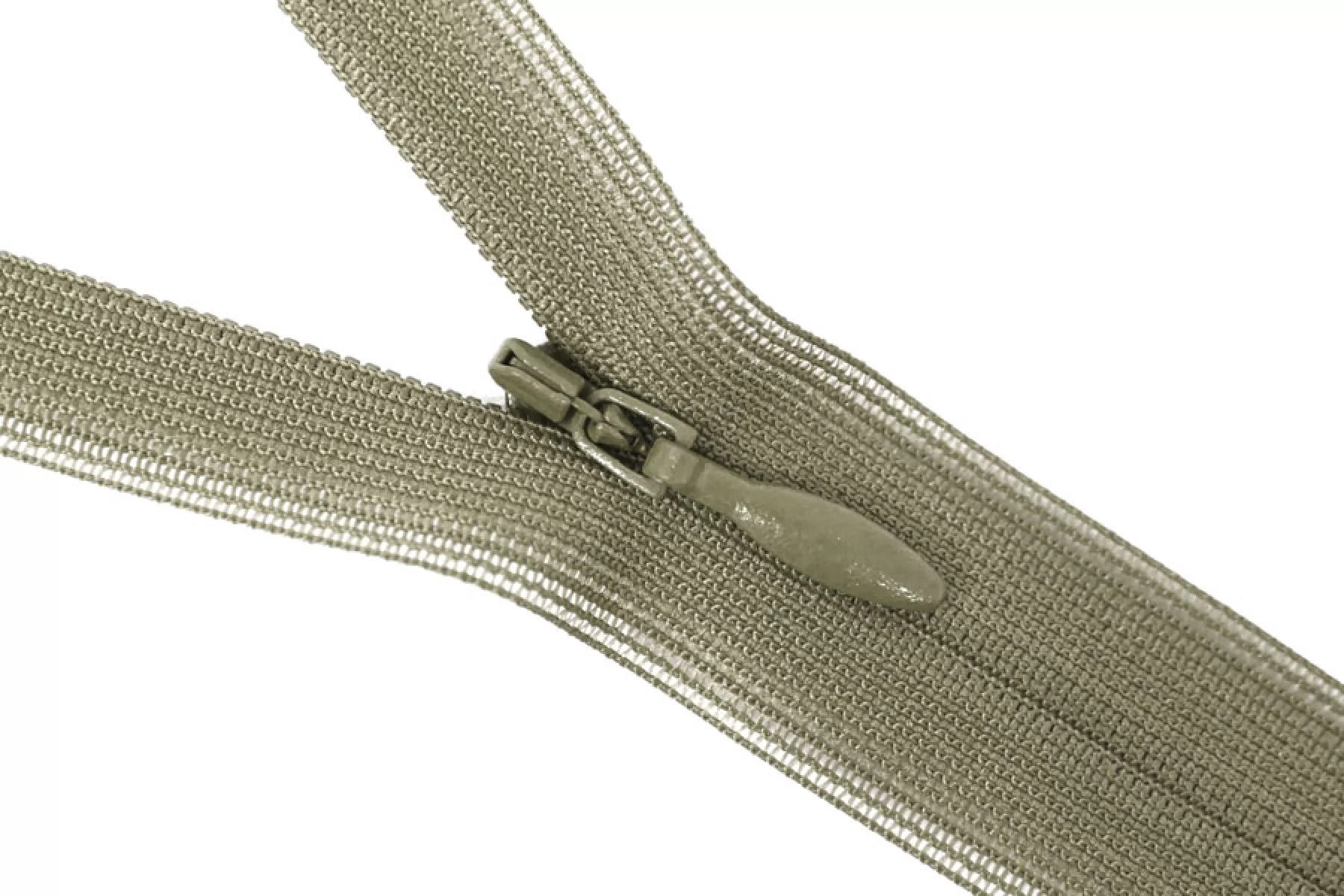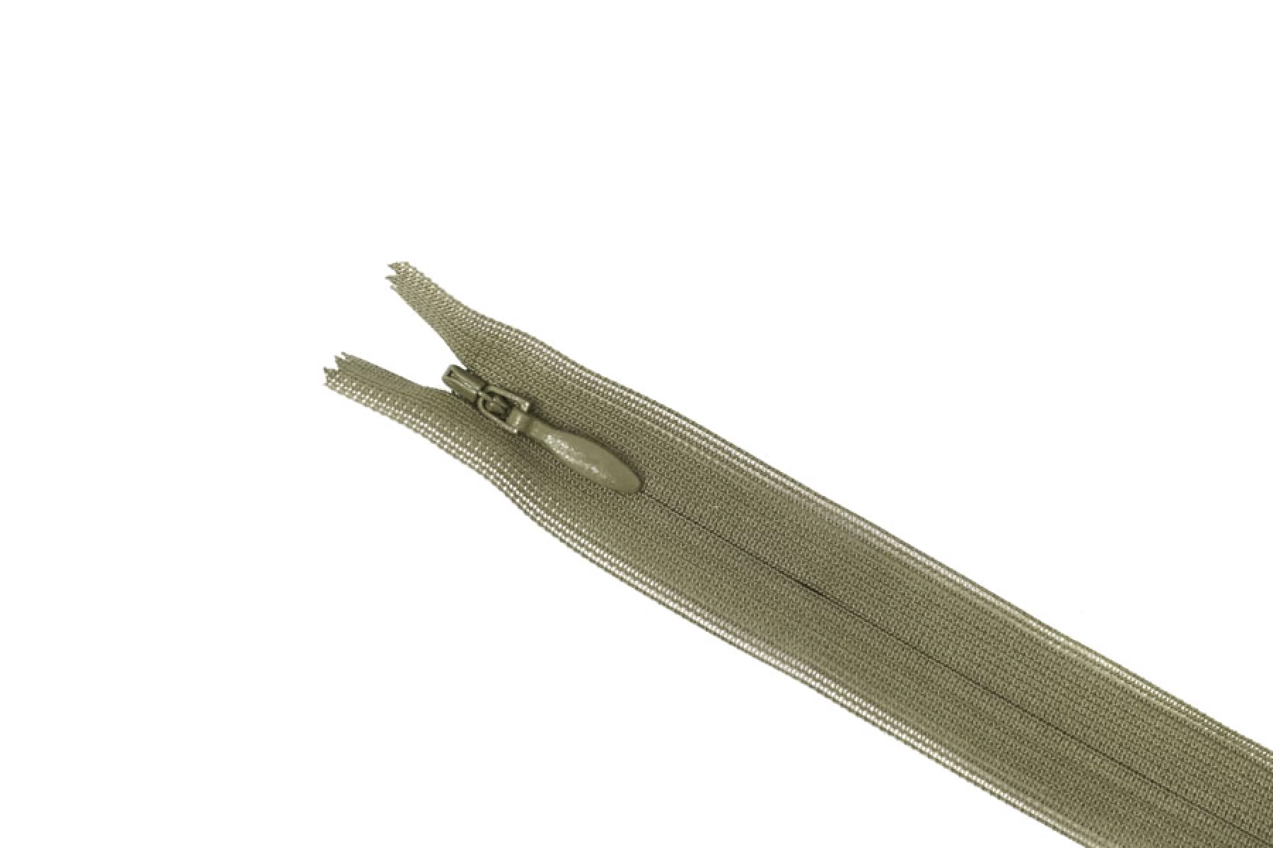 Потайная молния цвета хаки , длина 30 см. Слайдер и пуллер - метал. в цвет молнии. Ширина молнии 2.2 см , ширина зубцов 4мм.