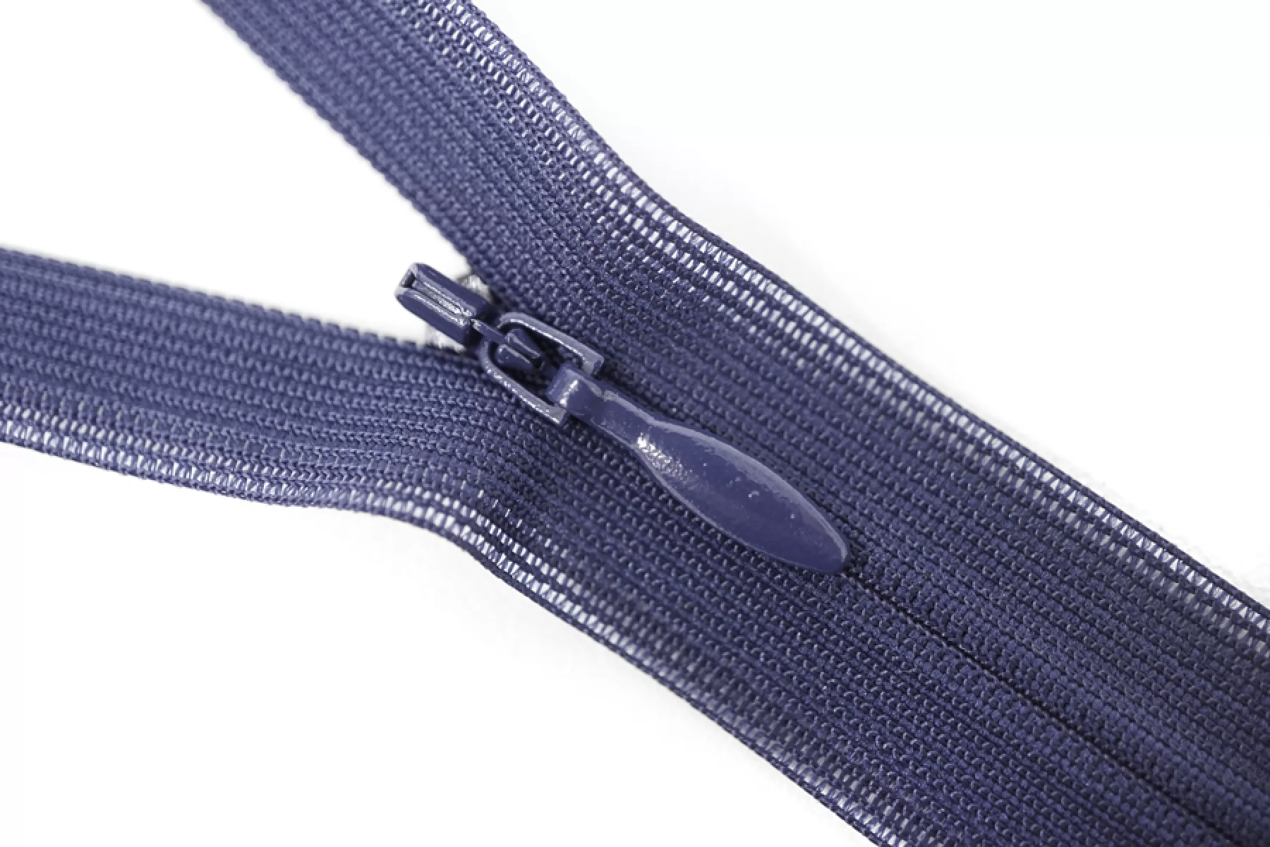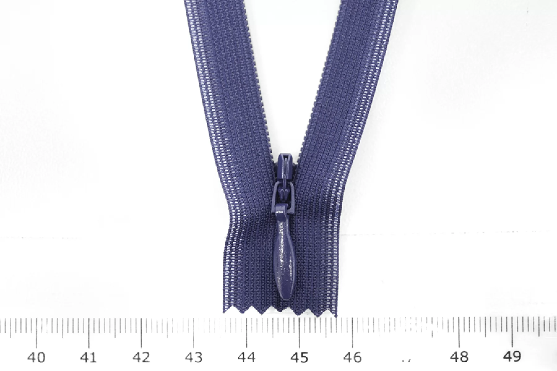 Потайная молния припыленного оттенка индиго от бренда YKK, длина 39 см. Неразъемная. Зубцы пластиковые, слайдер и пуллер - металл, оттенка индиго. Ширина молнии 1,8 см. Ширина зубцов 4 мм.