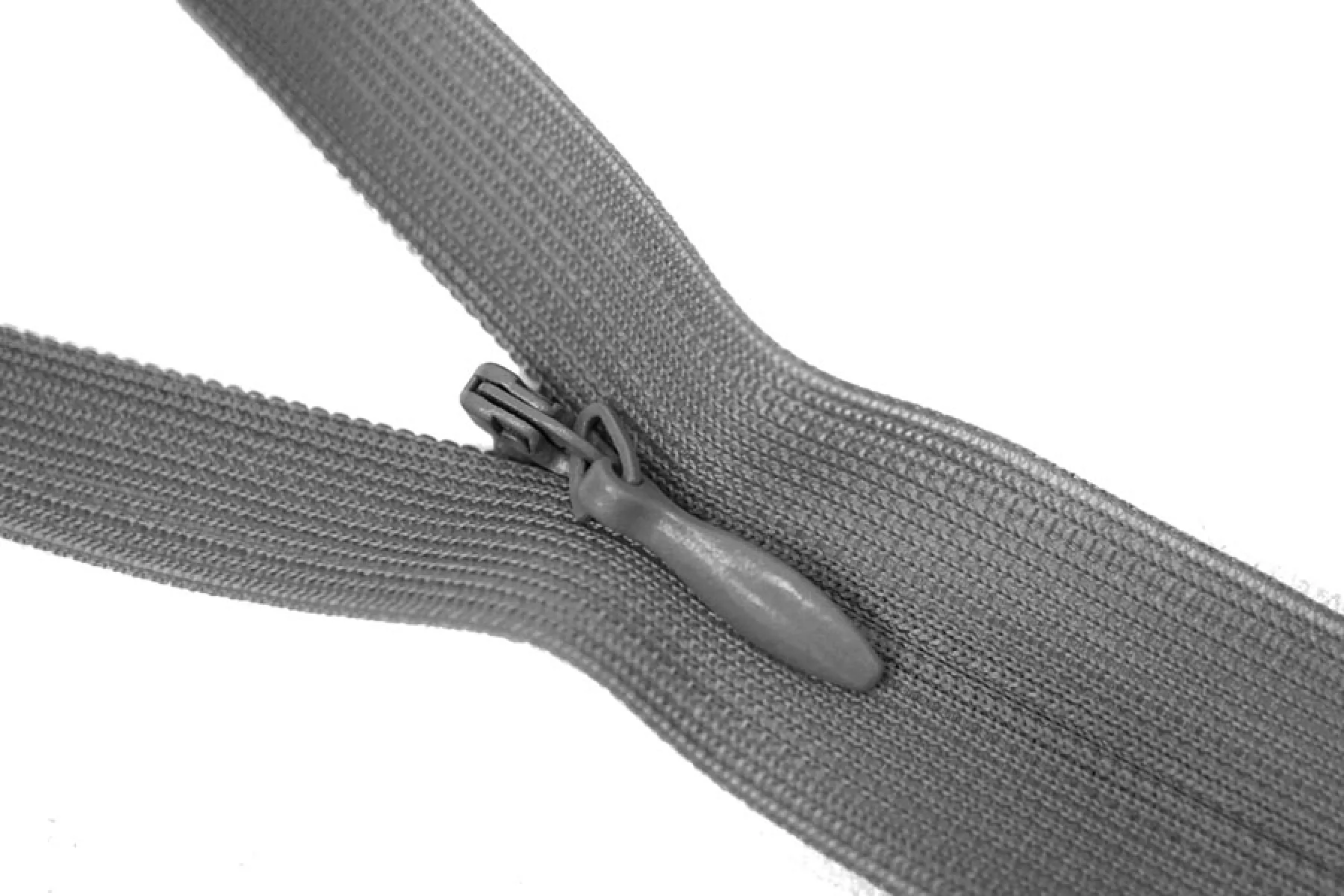 Потайная молния в цвете графит (темно-серый) , длина 20 см. Неразъемная. Зубцы пластиковые, слайдер и пулер - металл в цвет молнии. Ширина молнии 2 см. Ширина зубцов 4 мм.
