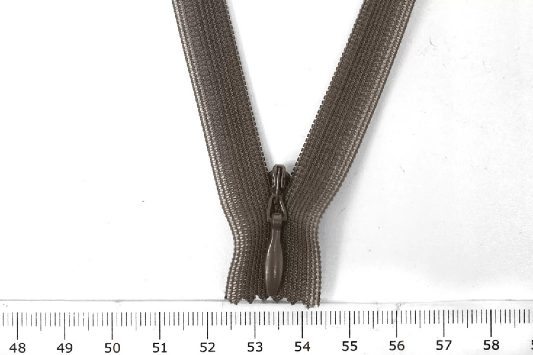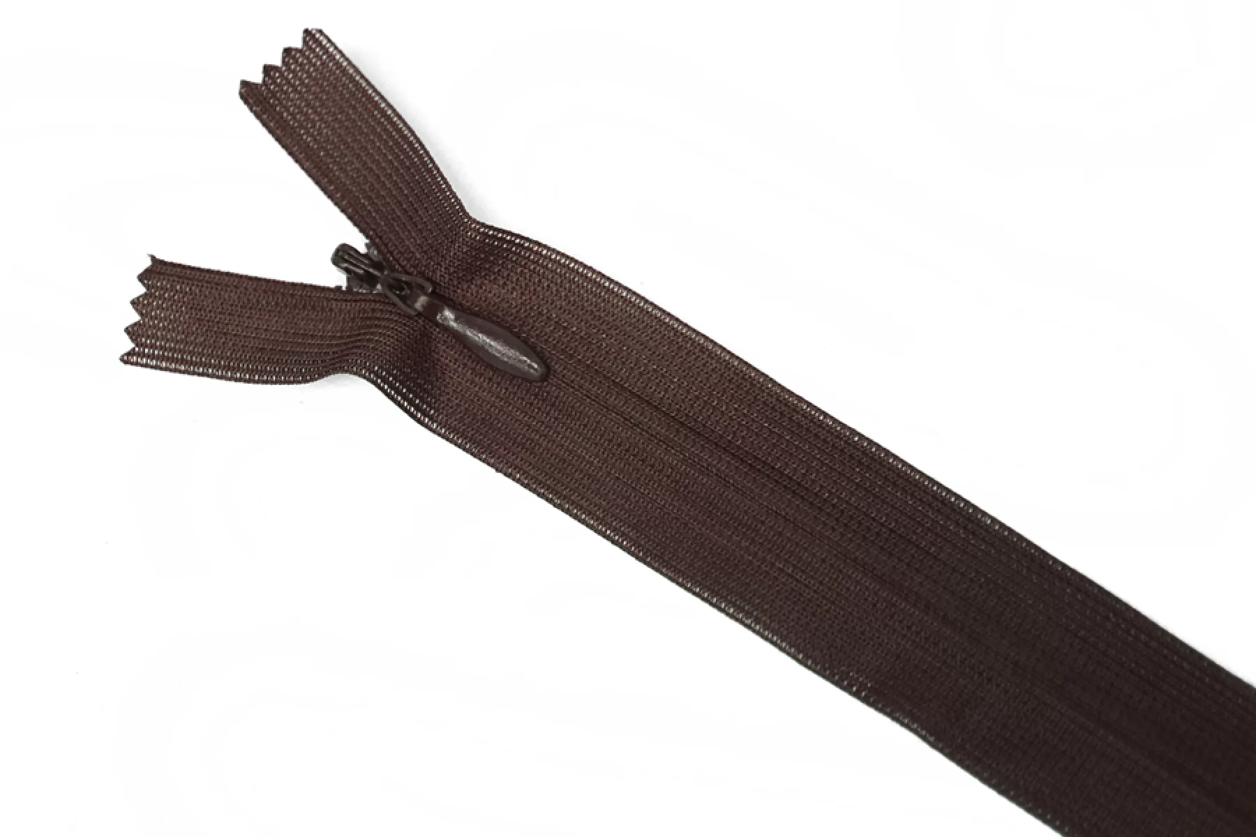 Молния потайная Коричневая , длина 18 см. Неразъемная. Зубцы пластиковые, слайдер и пуллер - металл вцвет молнии. Ширина молнии 2,2 см. Ширина зубцов 4 мм.