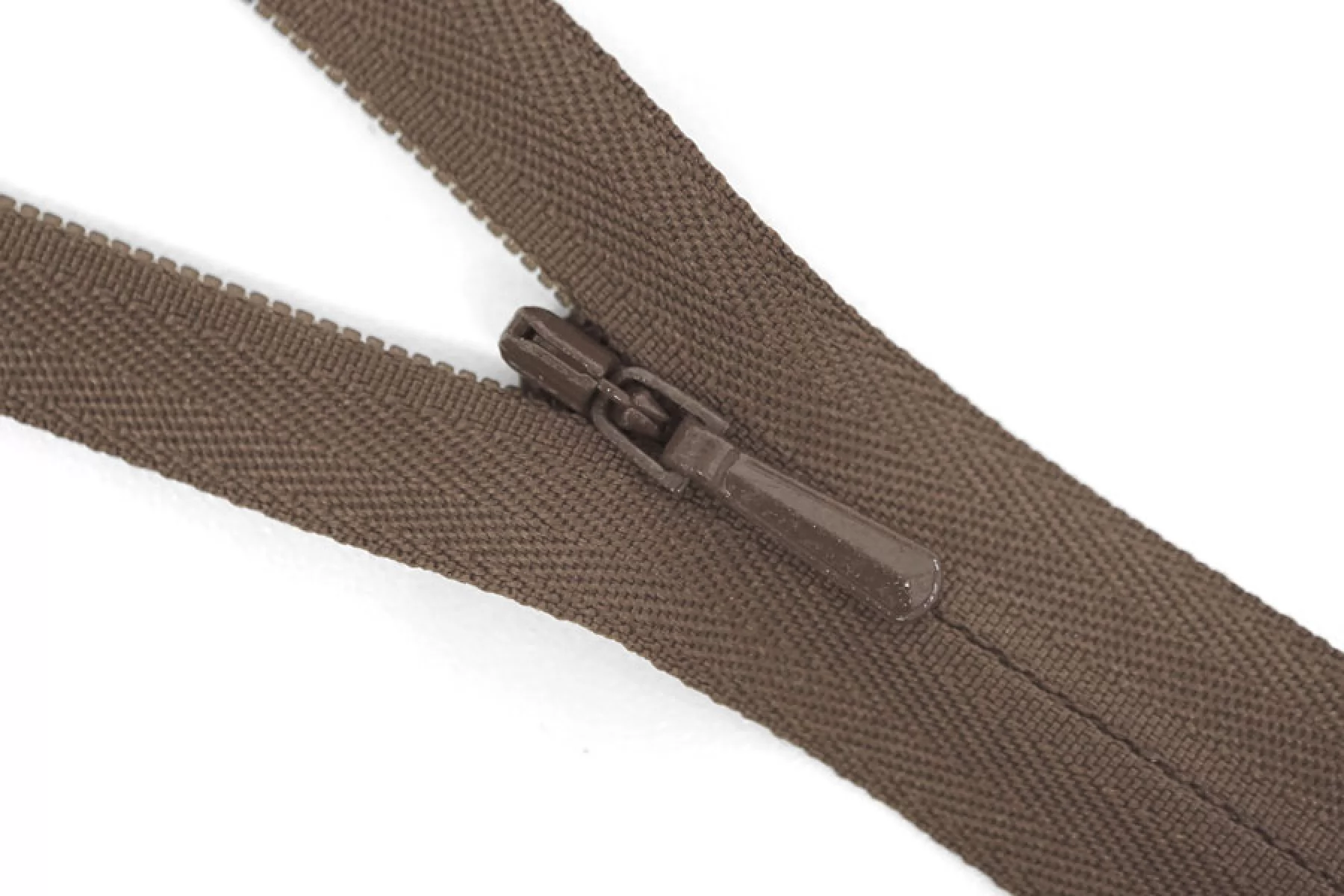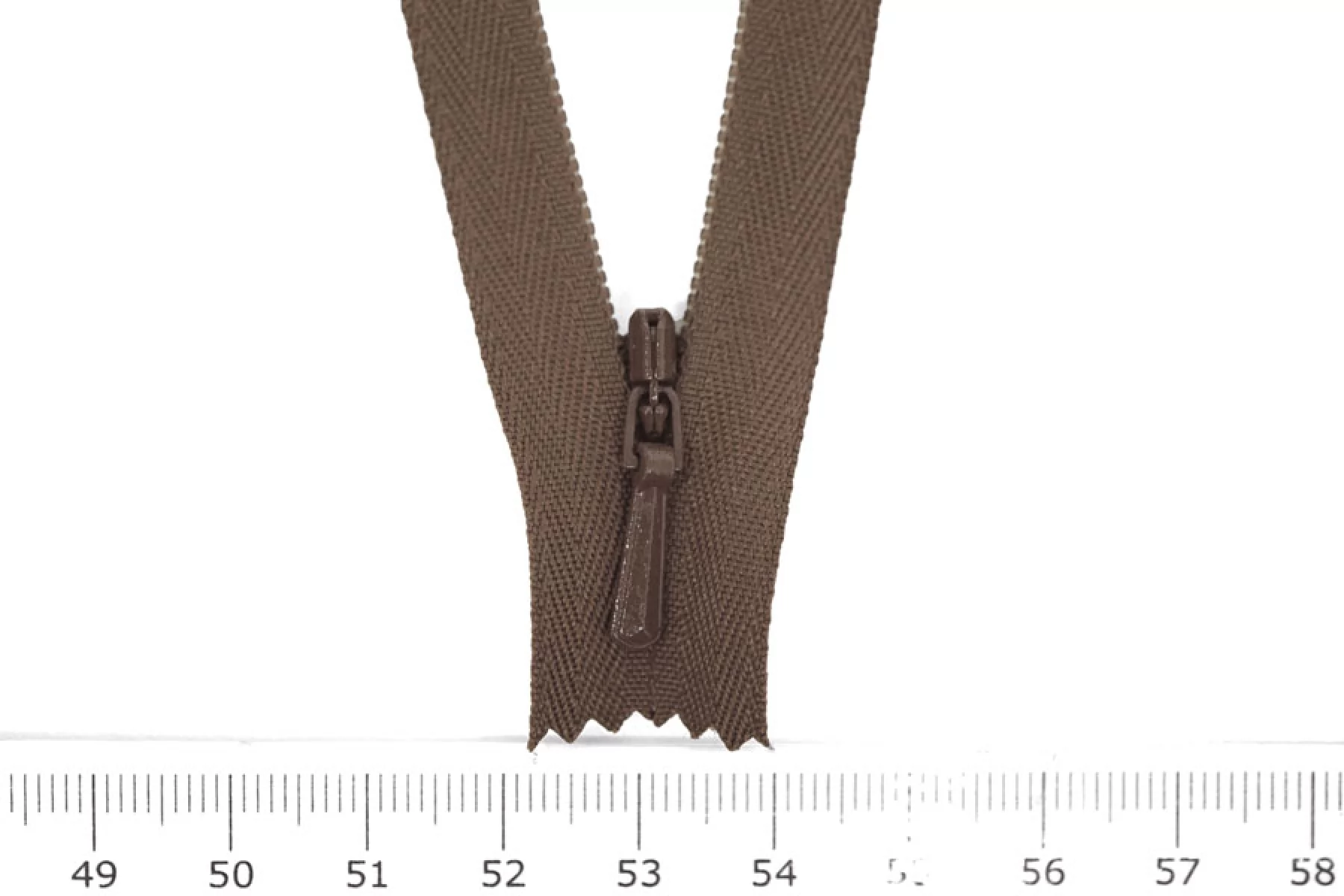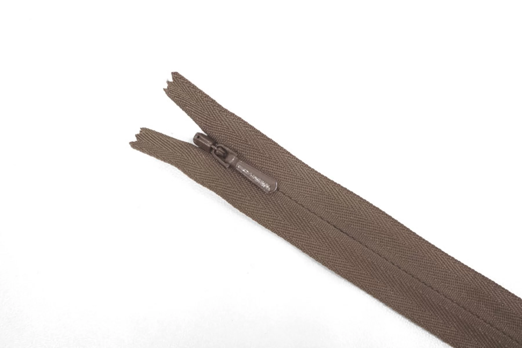 Молния потайная Коричневая , длина 22 см. Неразъемная. Зубцы пластиковые, слайдер и пуллер - металл вцвет молнии. Ширина молнии 2,2 см. Ширина зубцов 4 мм.