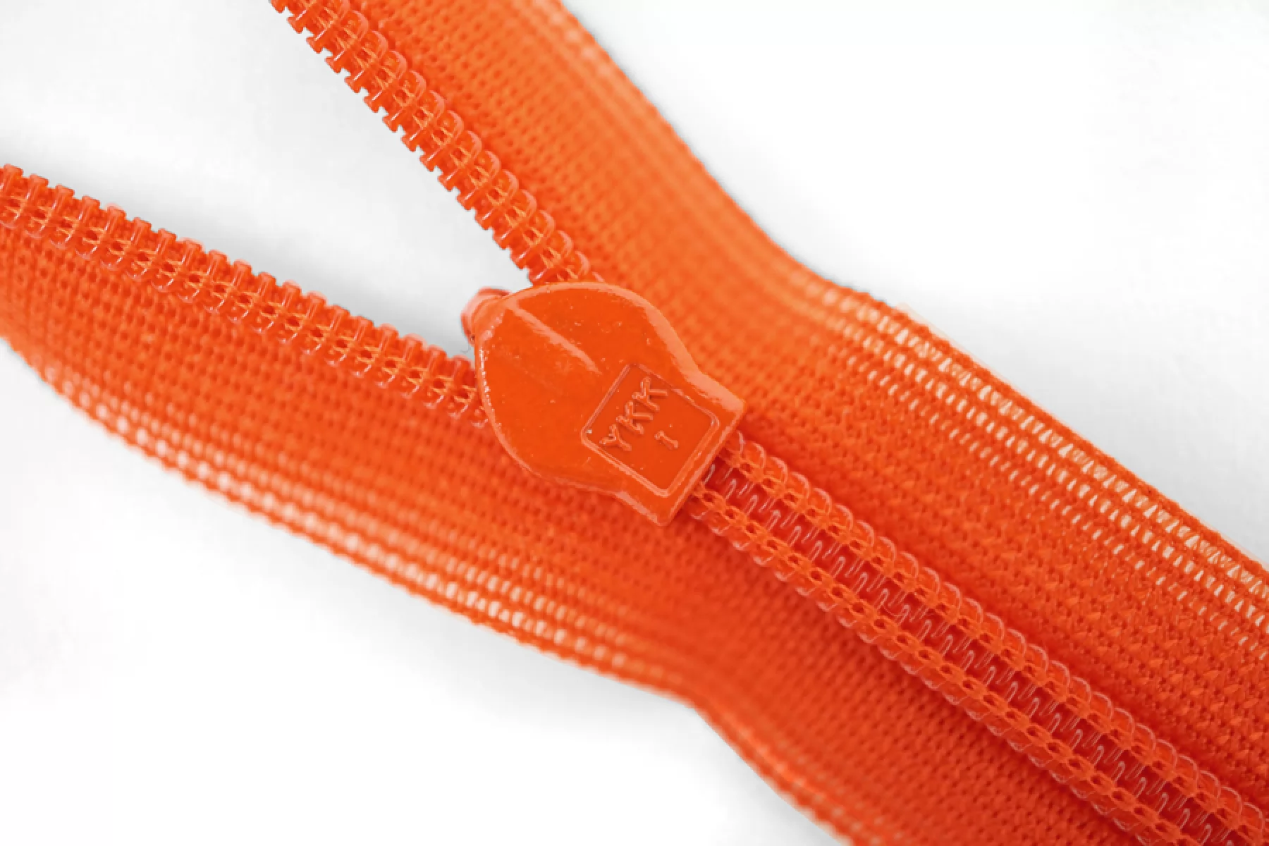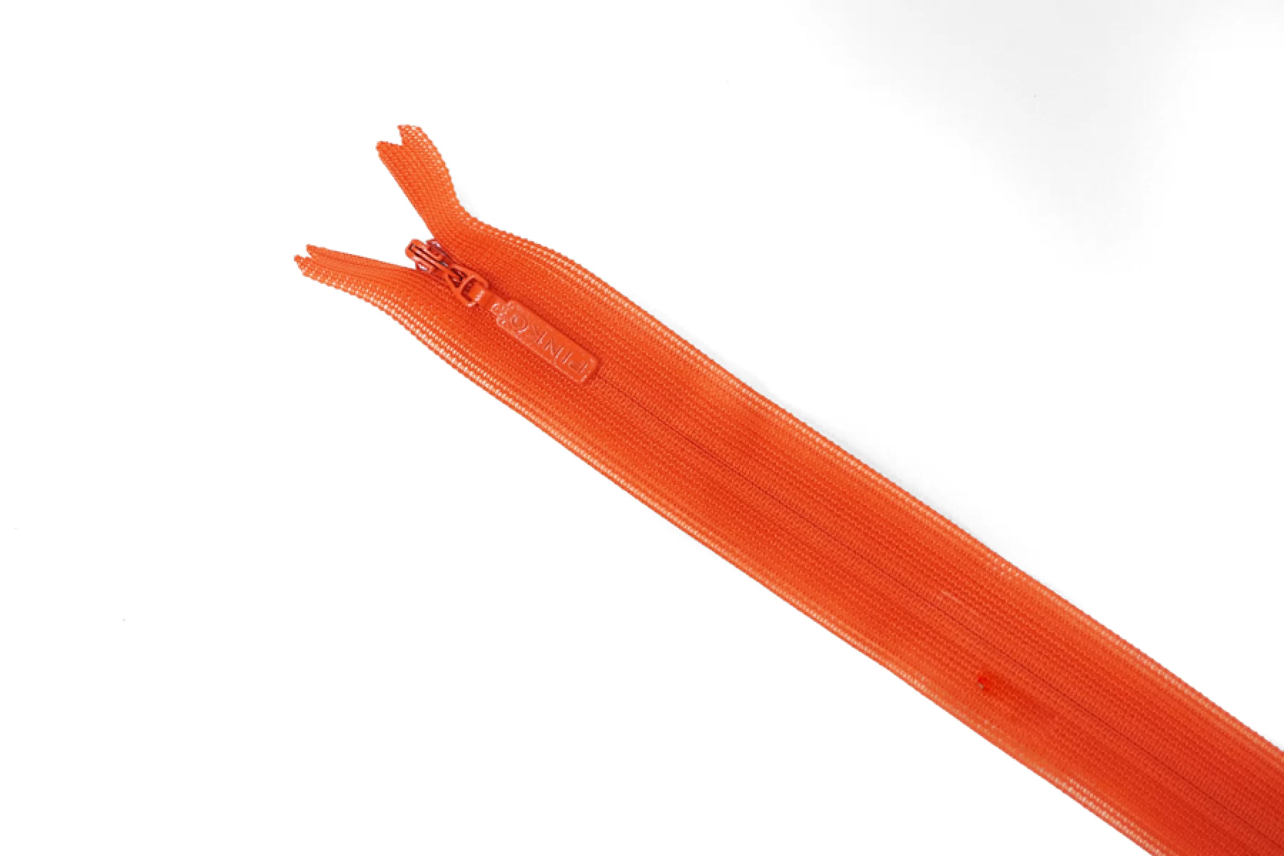 Потайная молния красного оттенка от бренда YKK , длина 20 см. Неразъемная. Зубцы пластиковые, слайдер и пуллер - металл. Ширина молнии 2 см. Ширина зубцов 4 мм.