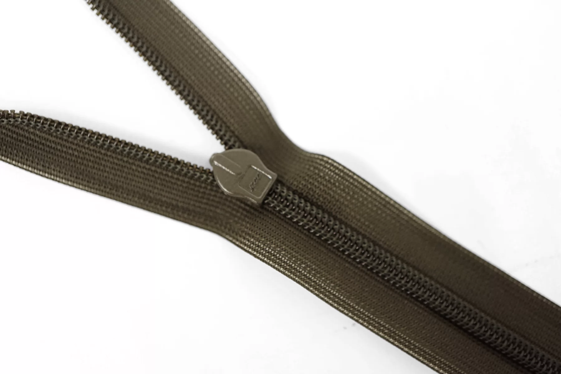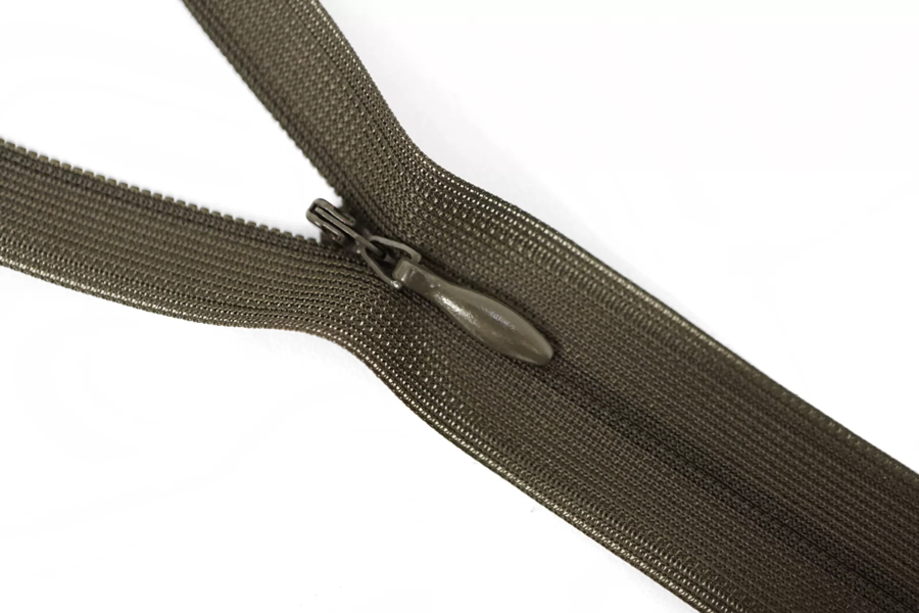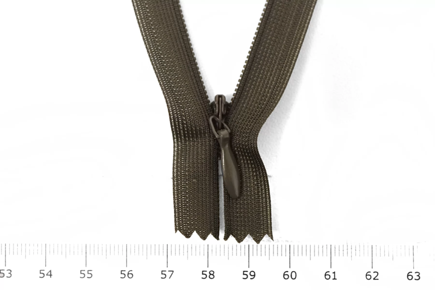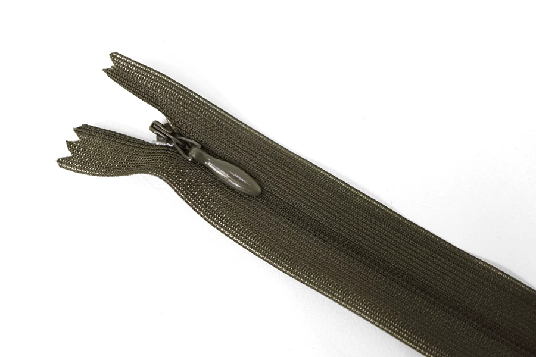 Потайная молния в оттенке хаки от бренда КСС , длина 20 см. Неразъемная. Зубцы пластиковые, слайдер и пуллер - металл. в цвет молнии. Ширина молнии 2 см. Ширина зубцов 4 мм.