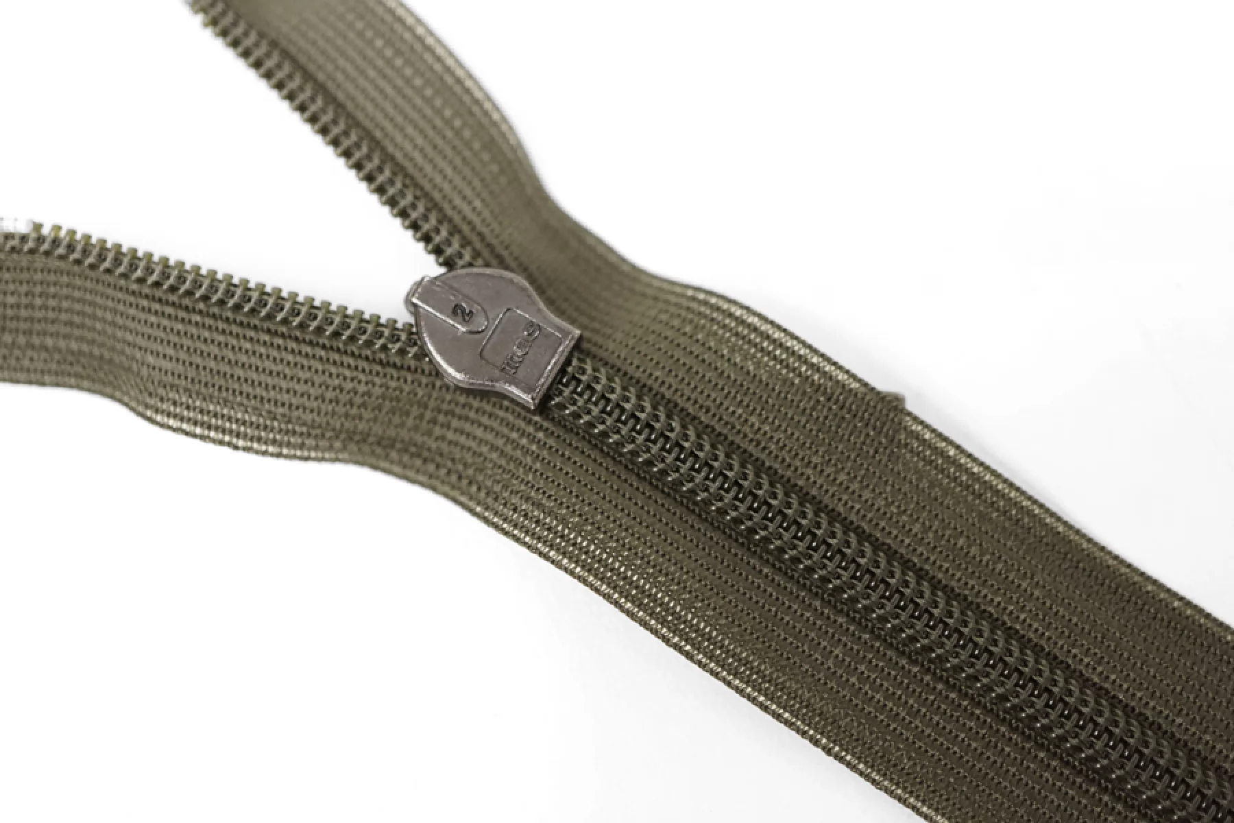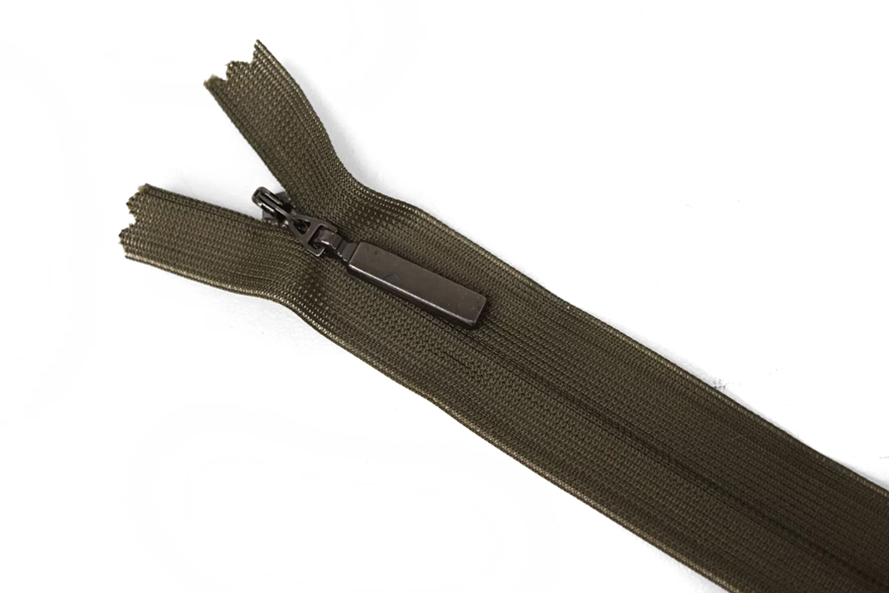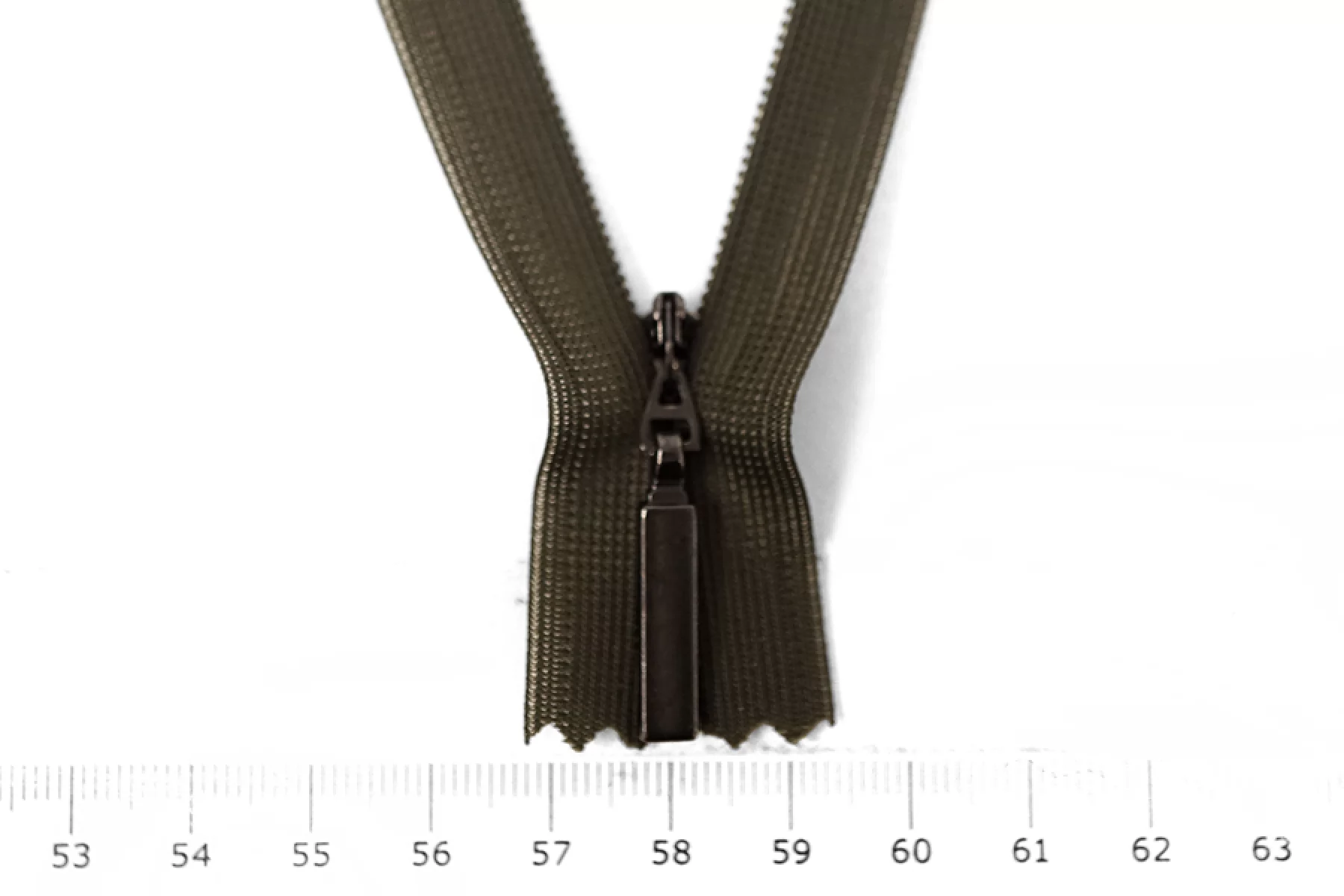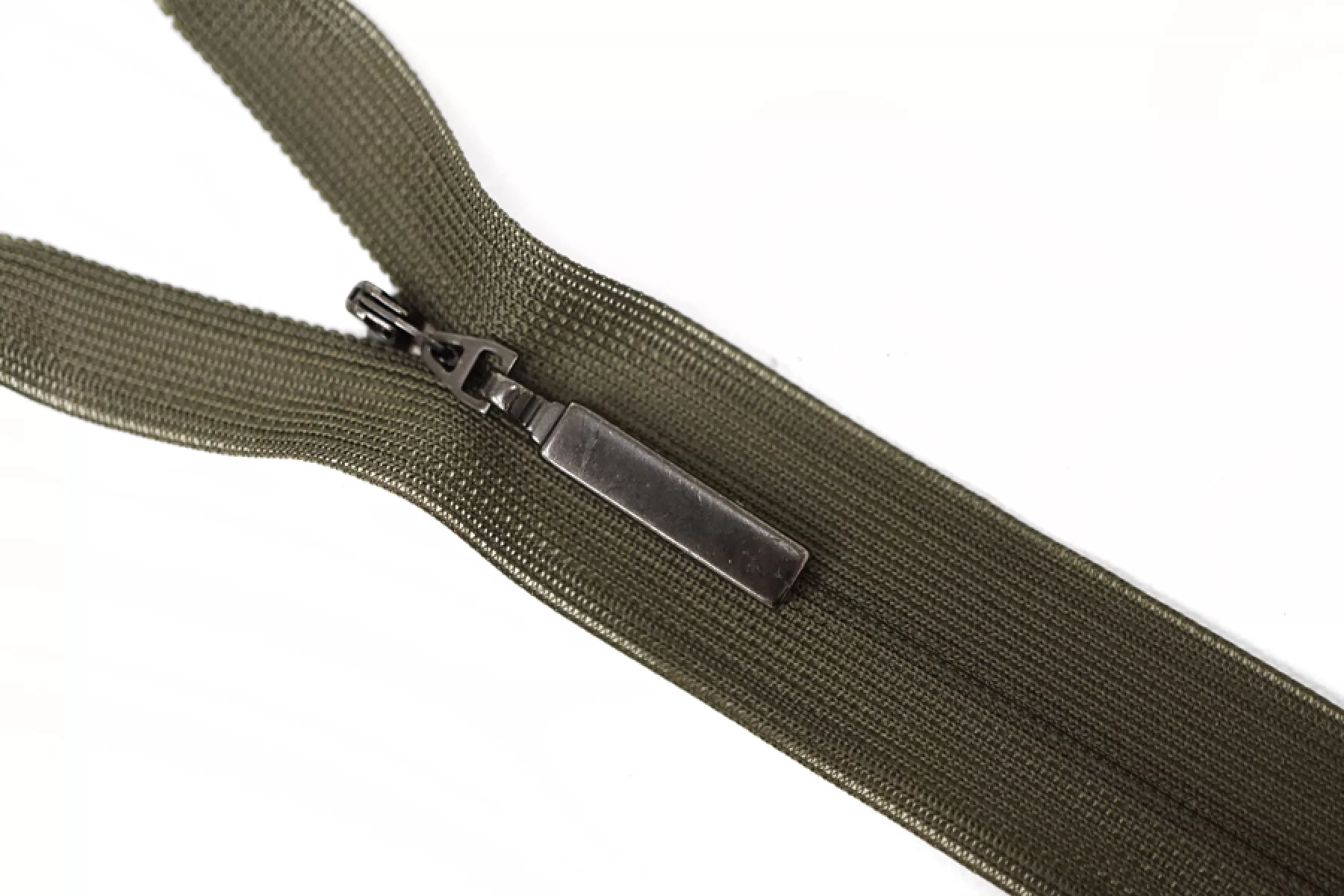Потайная молния в оттенке хаки от бренда MAS , длина 16 см. Неразъемная. Зубцы пластиковые, слайдер и пуллер - металл. в цвет молнии. Ширина молнии 2 см. Ширина зубцов 4 мм.