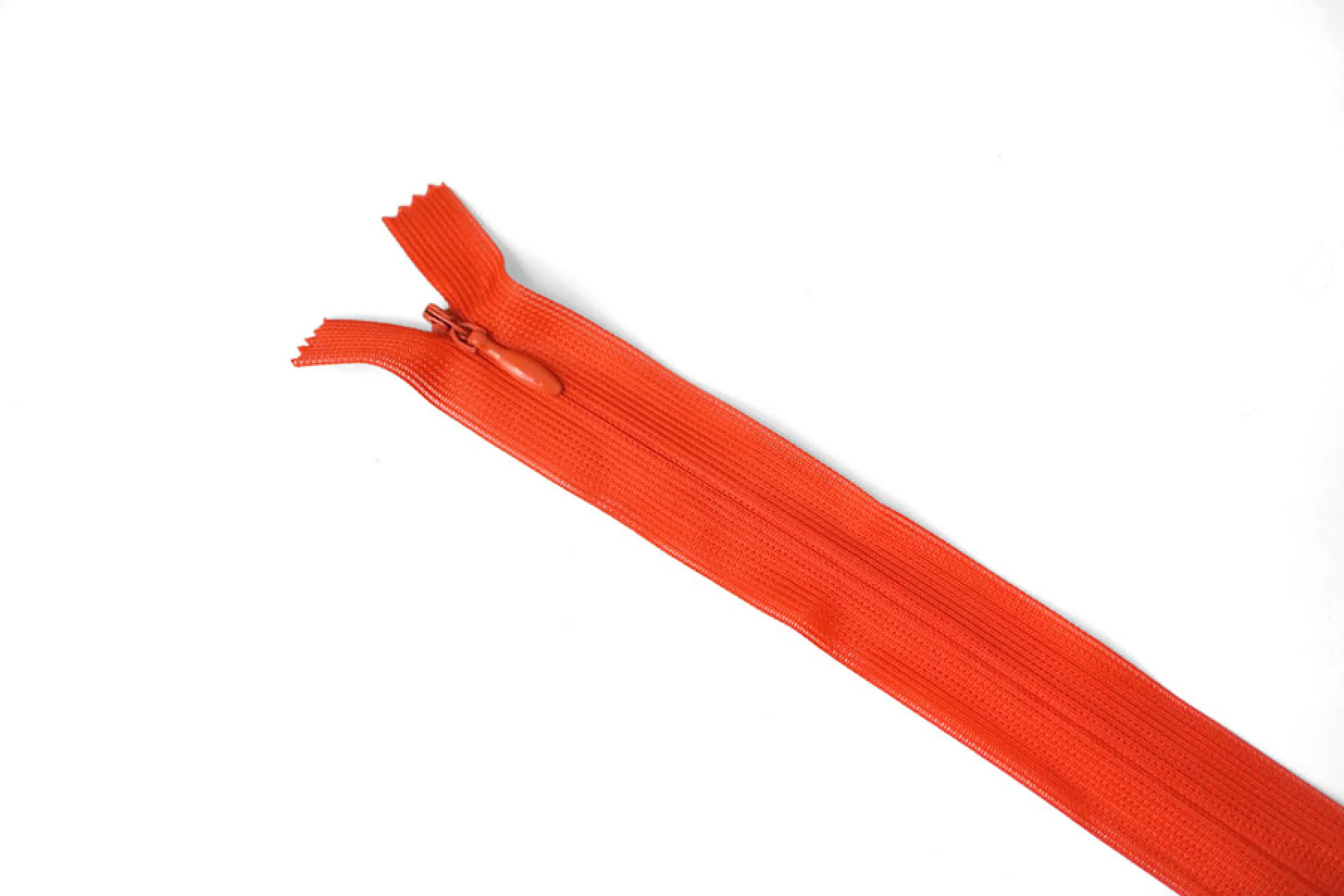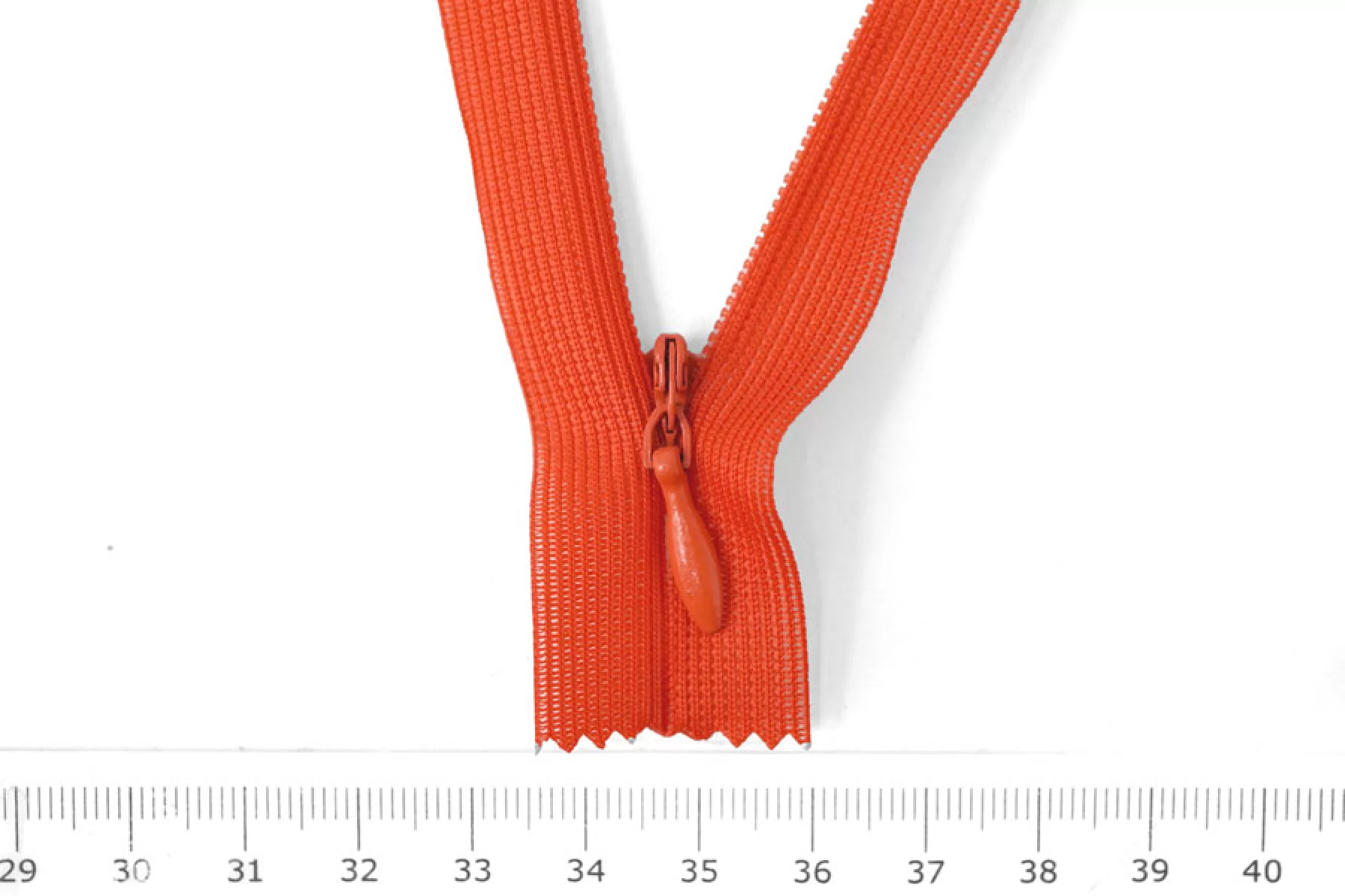 Потайная молния в алом оттенке, длина 34 см. Неразъемная. Зубцы пластиковые, слайдер и пуллер - металл. Ширина молнии 2,3 см. Ширина зубцов 4 мм.