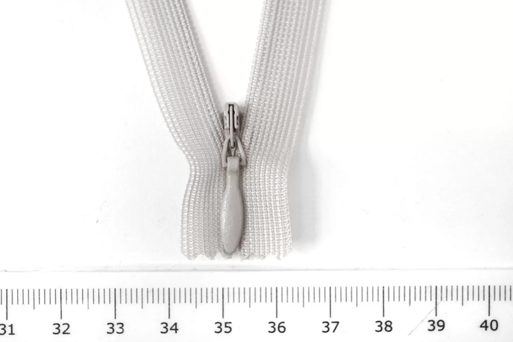 Потайная молния неразъемная, светло-серого оттенка, от YKK , длина 34,5 см. Неразъемная. Зубцы пластиковые, слайдер и пуллер - металл. Ширина молнии 2 см. Ширина зубцов 4 мм.