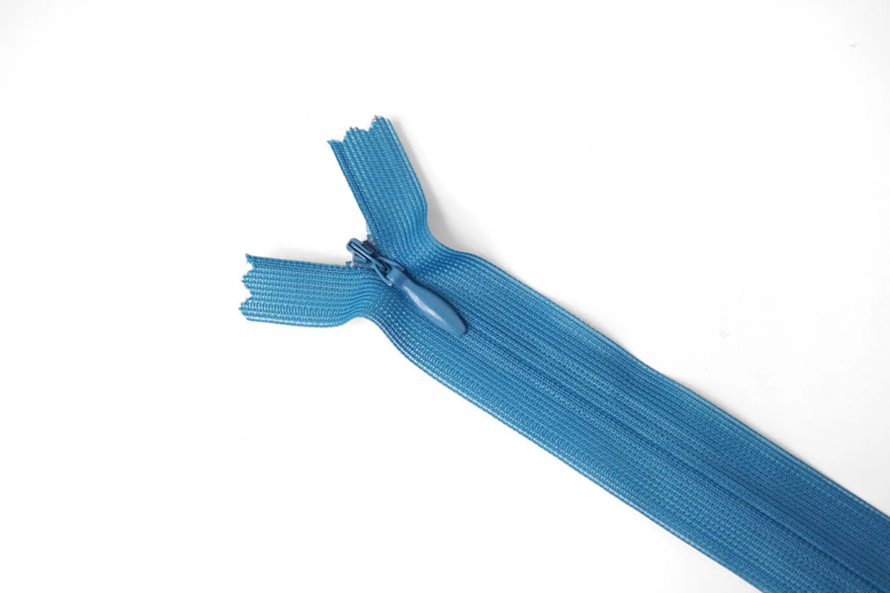Потайная молния неразъемная, насыщенного голубого оттенка, длина 25 см. Неразъемная. Зубцы пластиковые, слайдер и пуллер - металл. Ширина молнии 2,2 см. Ширина зубцов 4 мм.
