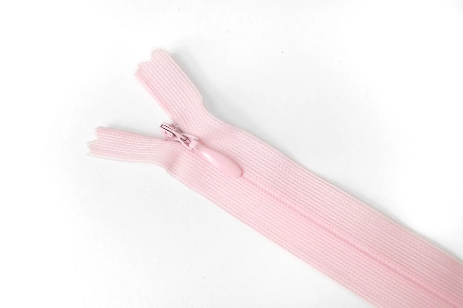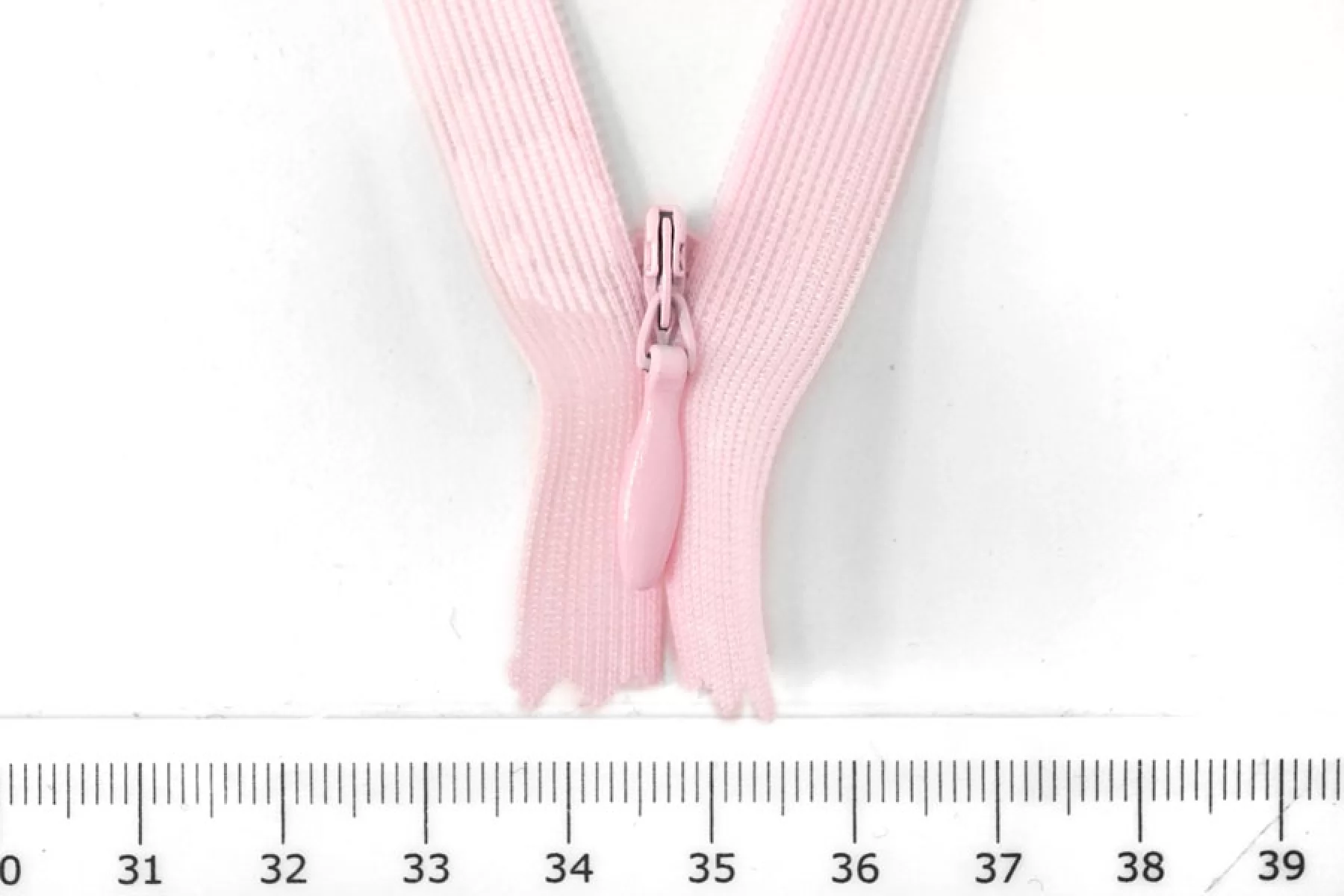 Потайная молния неразъемная, нежно-розового оттенка, длина 20 см. Неразъемная. Зубцы пластиковые, слайдер и пуллер - металл. Ширина молнии 2,2 см. Ширина зубцов 4 мм.