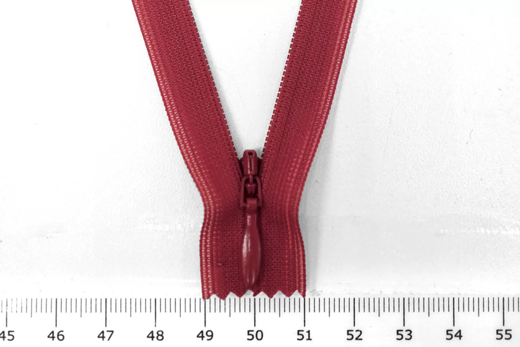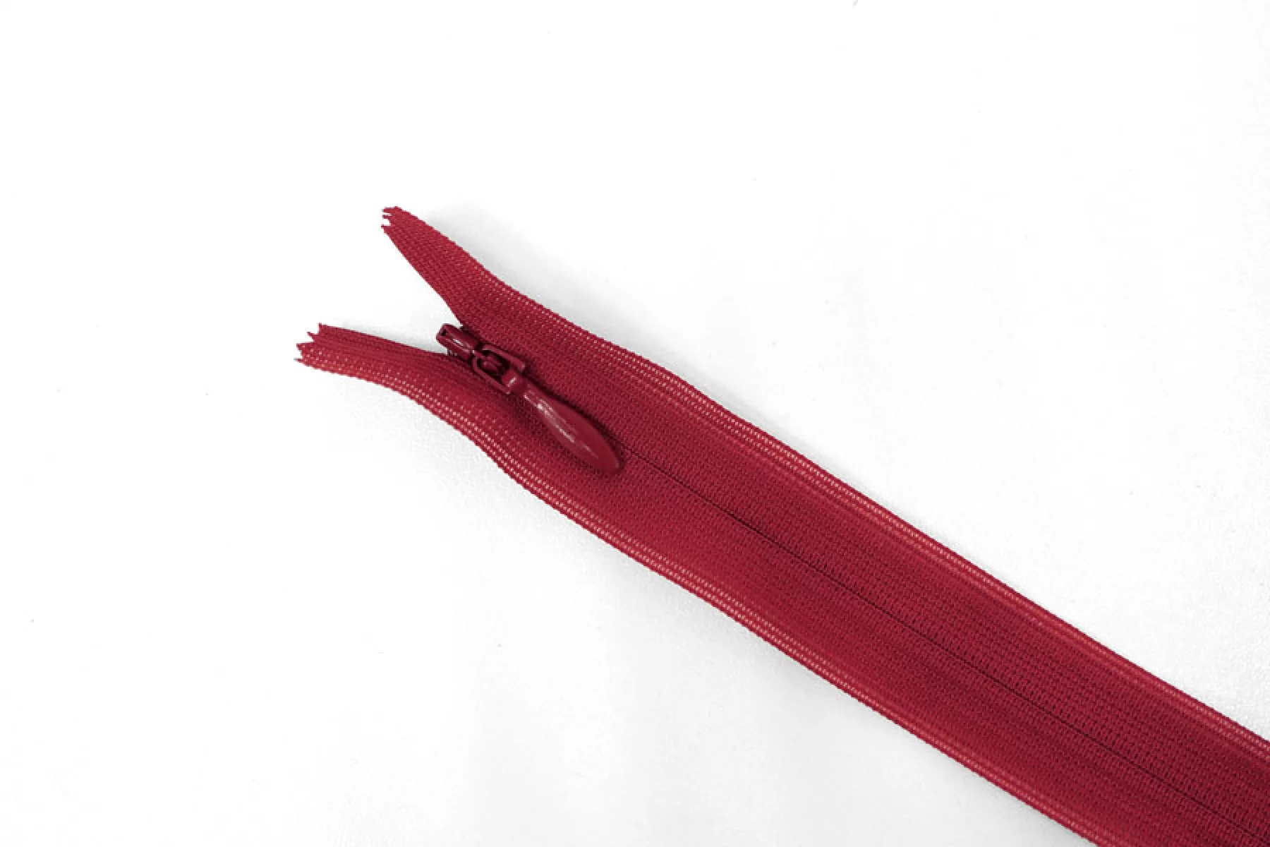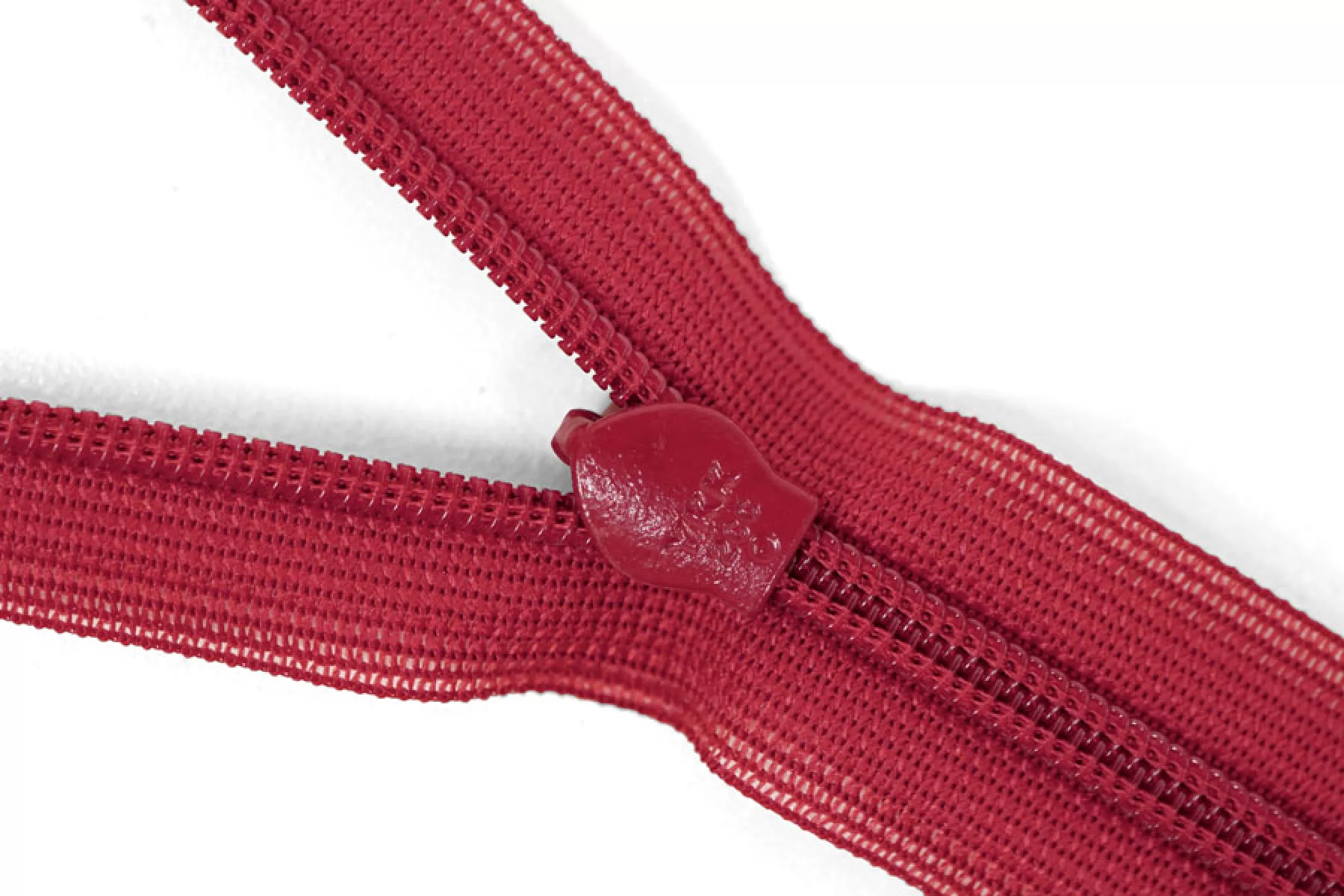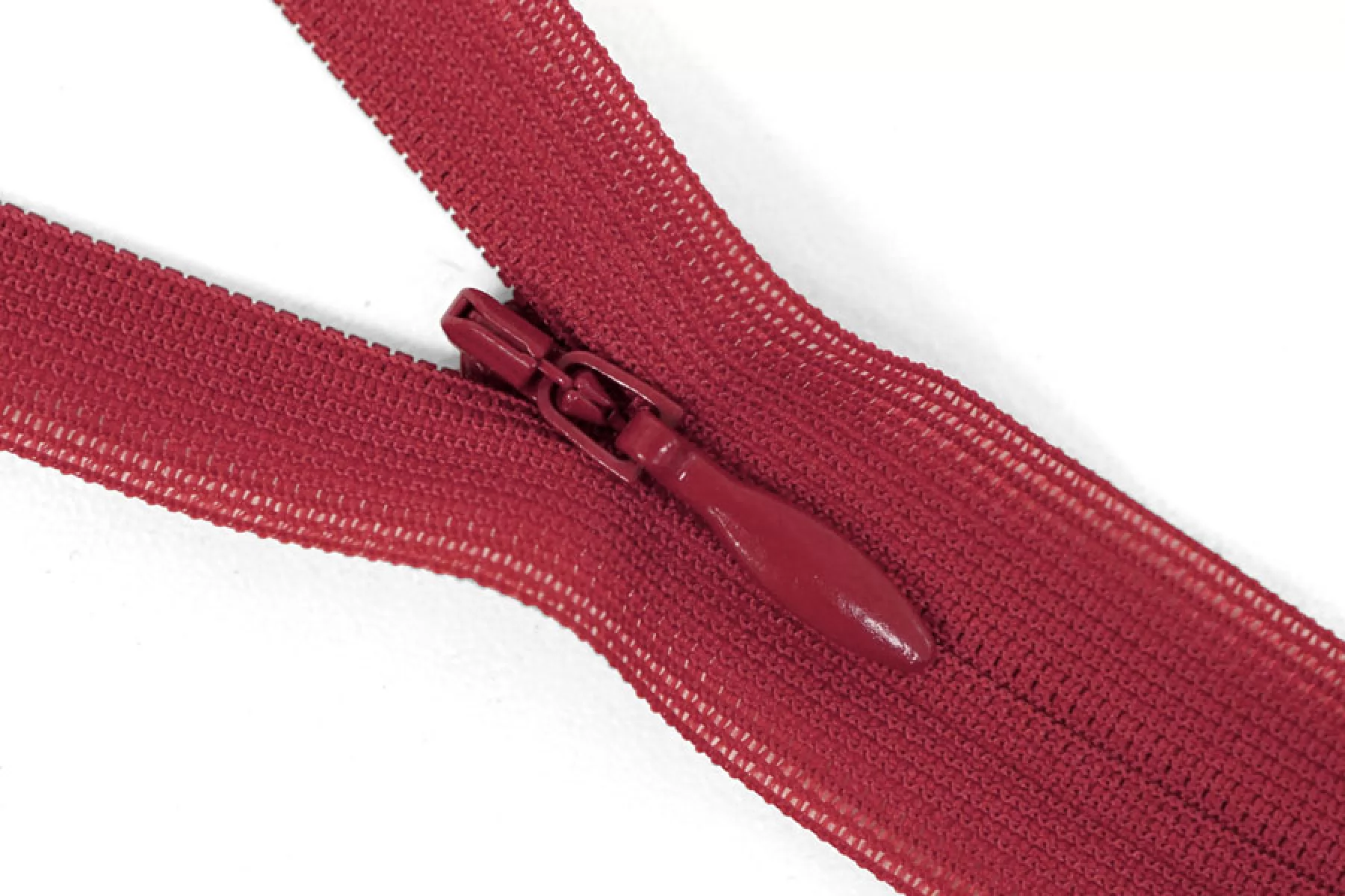 Молния потайная неразъёмная красного оттенка, однозамковая, от YKK. Зубцы из пластика, слайдер, пуллер - металл. Длина 84 см. Ширина молнии 2,3 см. Ширина зубцов - 4 мм.