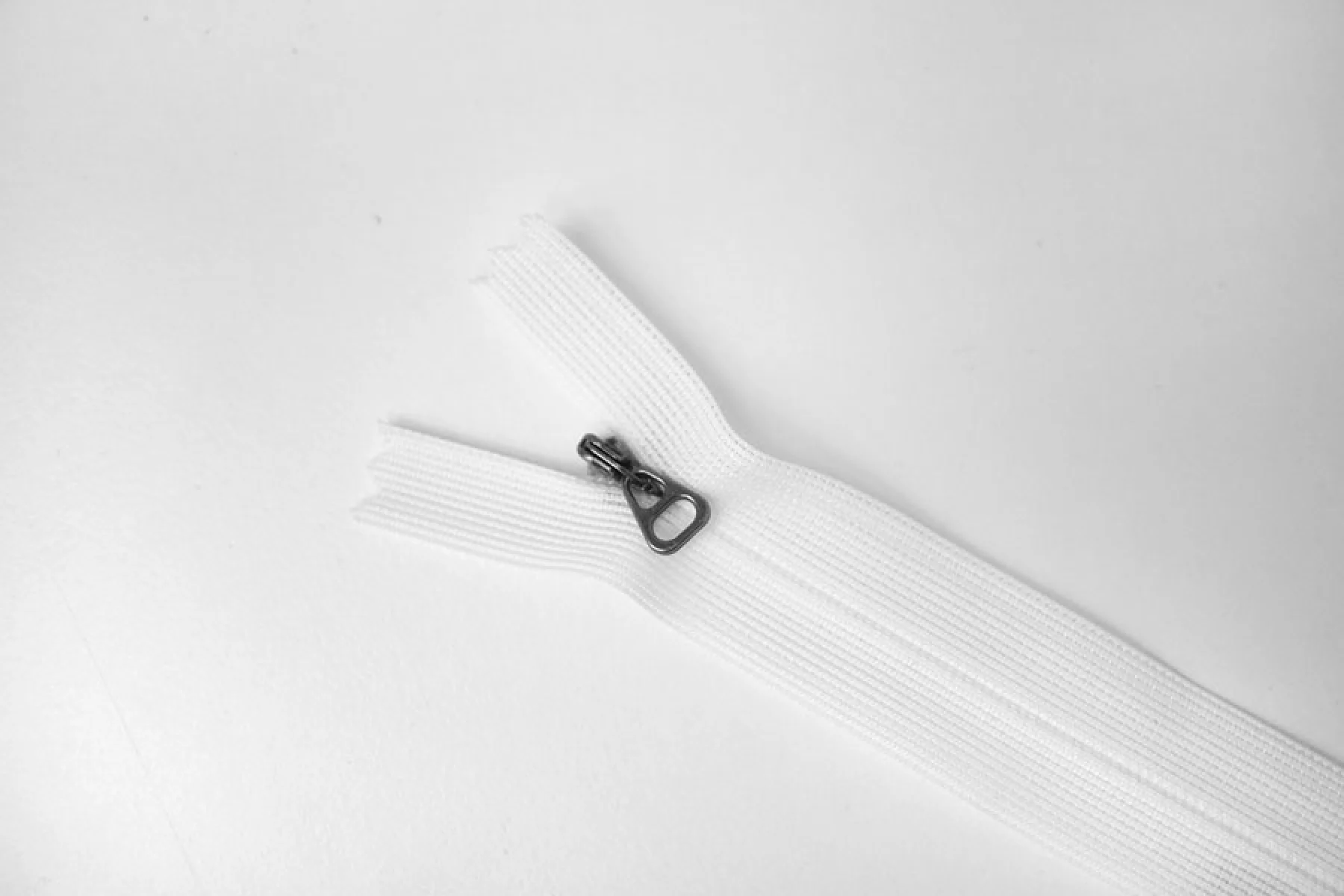 Потайная молния неразъемная, молочного оттенка, длина 18 см. Неразъемная. Зубцы пластиковые, слайдер и пуллер - металл оттенка никеля. Ширина молнии 2,2 см. Ширина зубцов 4 мм.