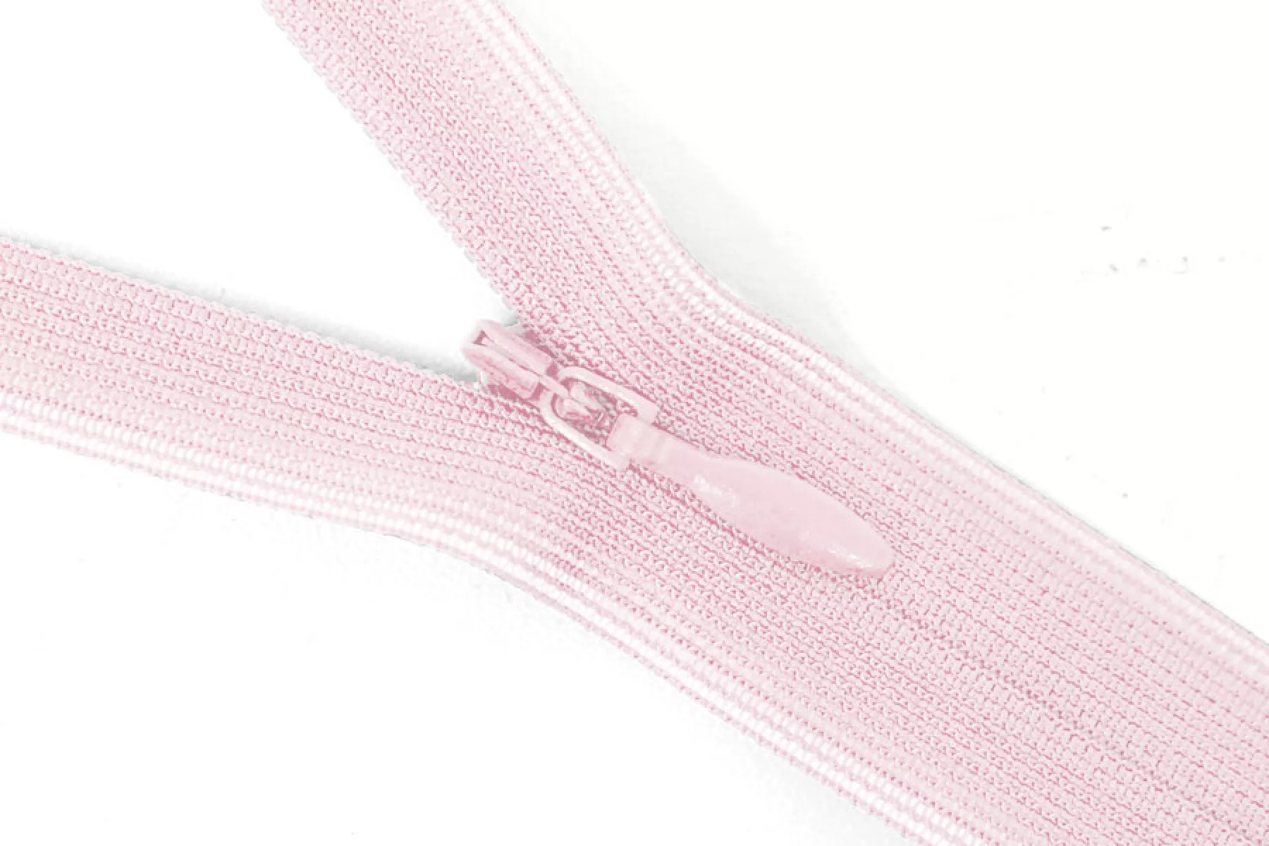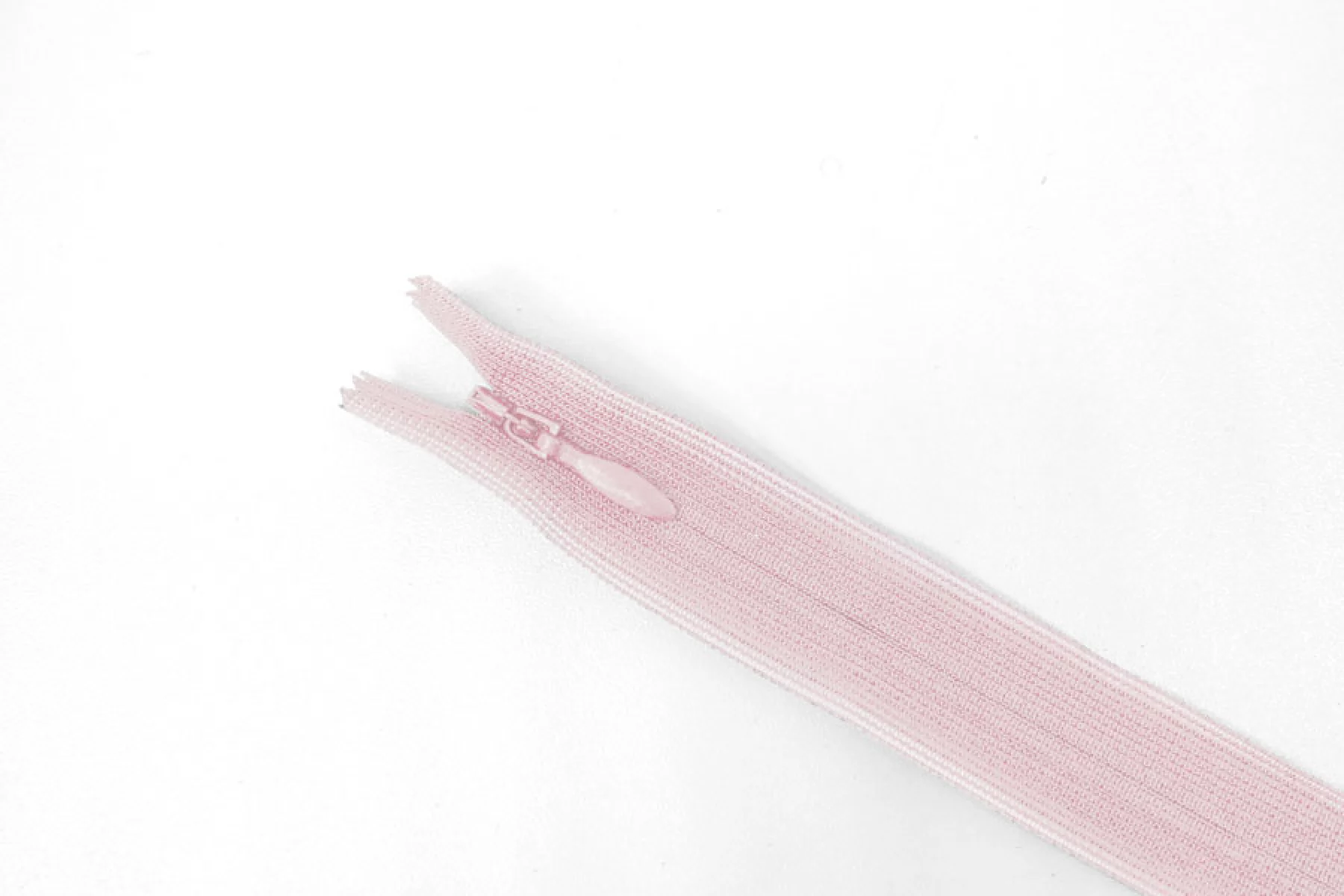 Потайная молния неразъемная, нежно-розового оттенка, длина 64 см. Неразъемная. Зубцы пластиковые, слайдер и пуллер - металл.в тон молнии. Ширина молнии 2,2 см. Ширина зубцов 4 мм.