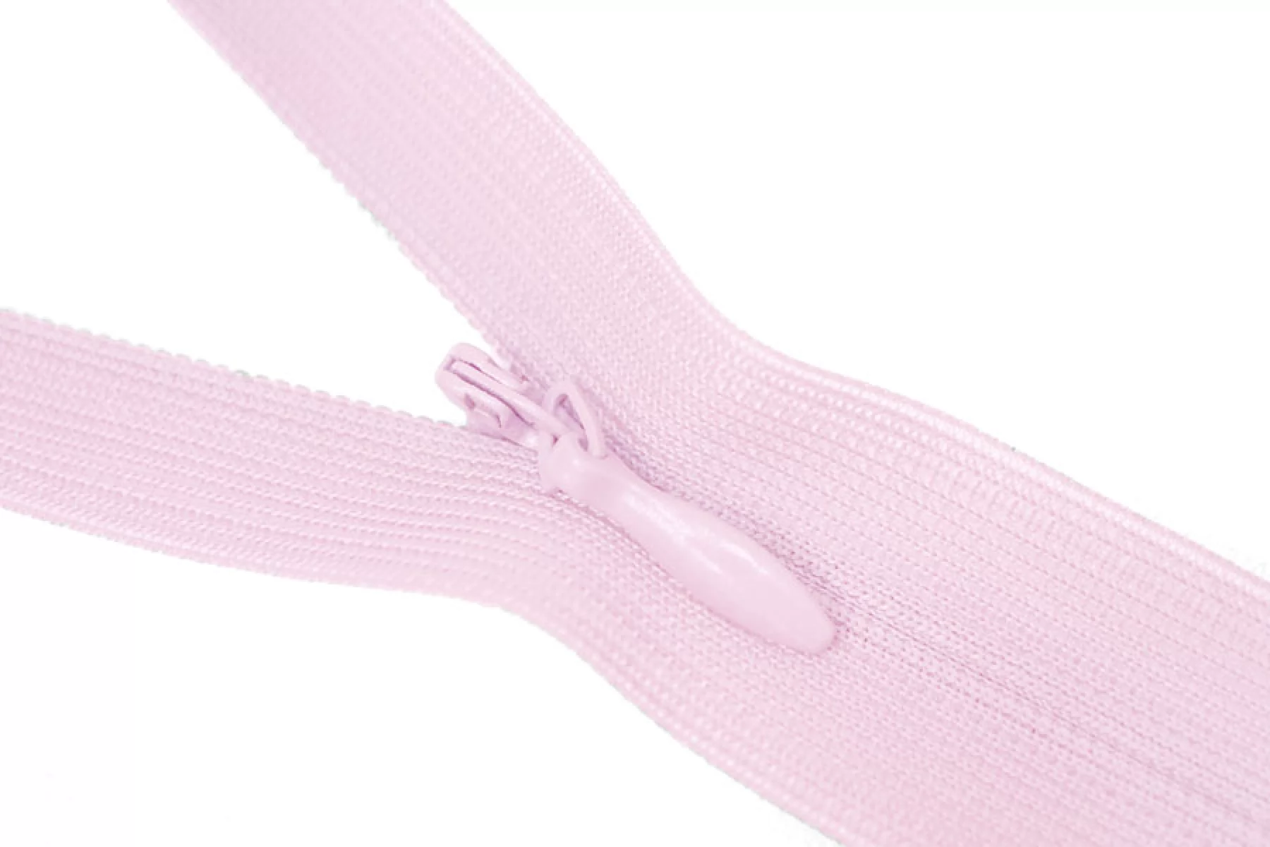 Потайная молния в нежно-сиреневом оттенке, длина 24 см. Неразъемная. Зубцы пластиковые, слайдер и пуллер - металл. Ширина молнии 2,3 см. Ширина зубцов 4 мм.