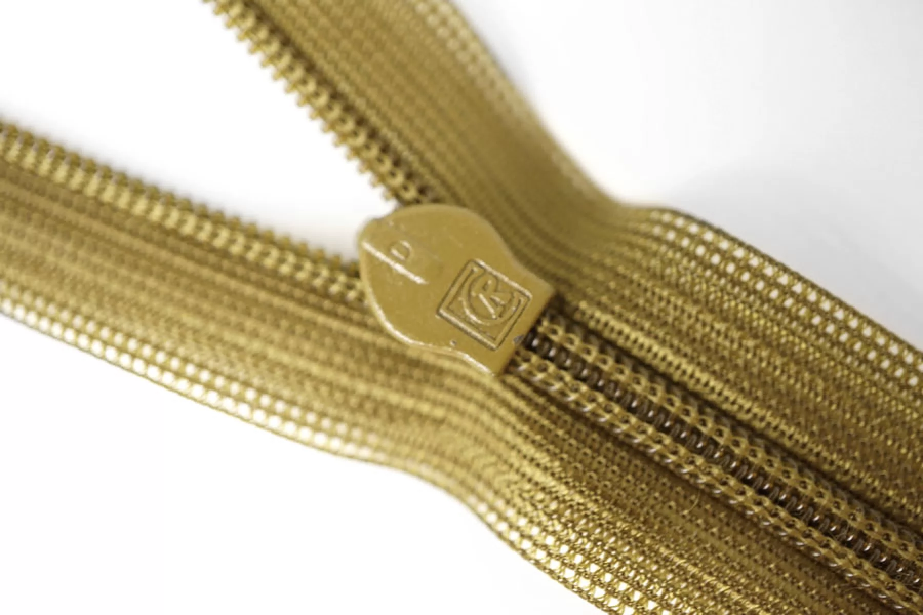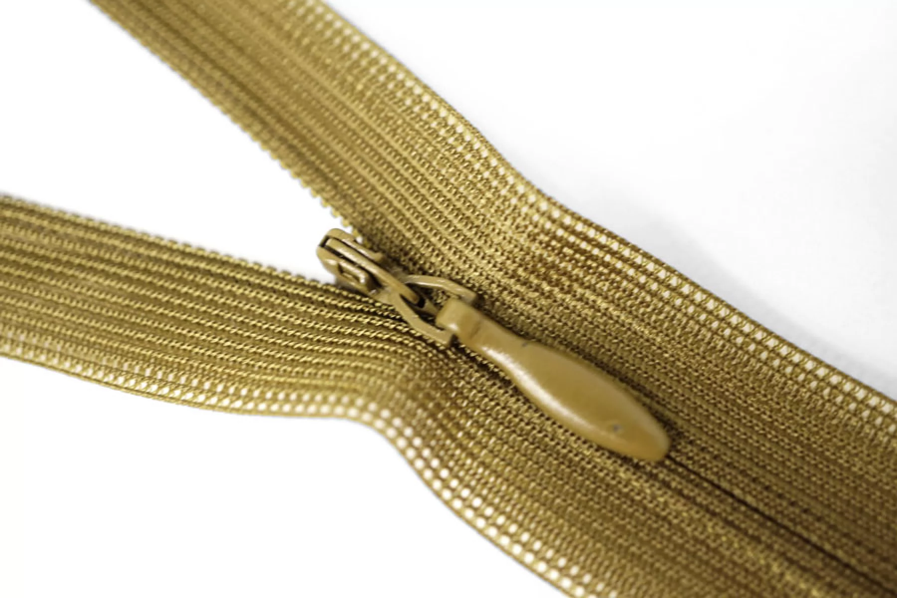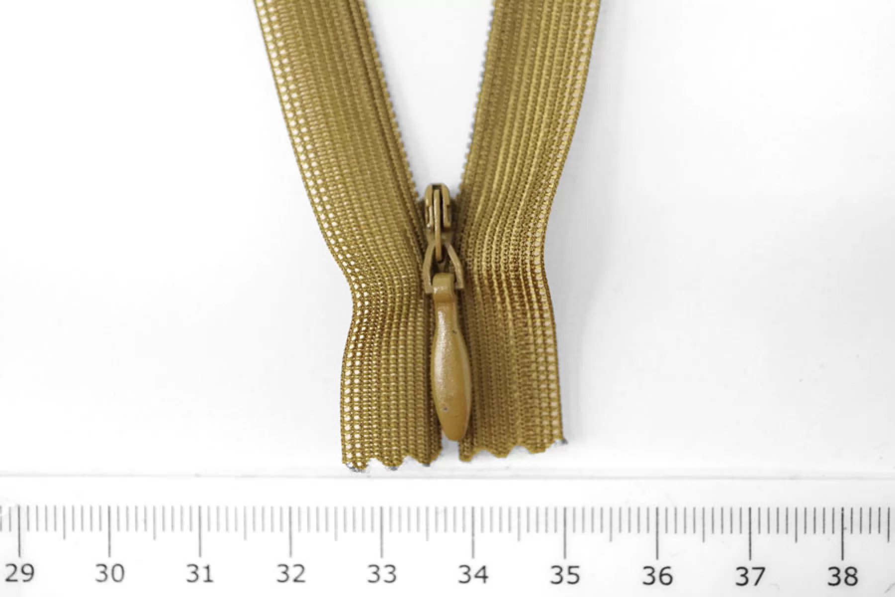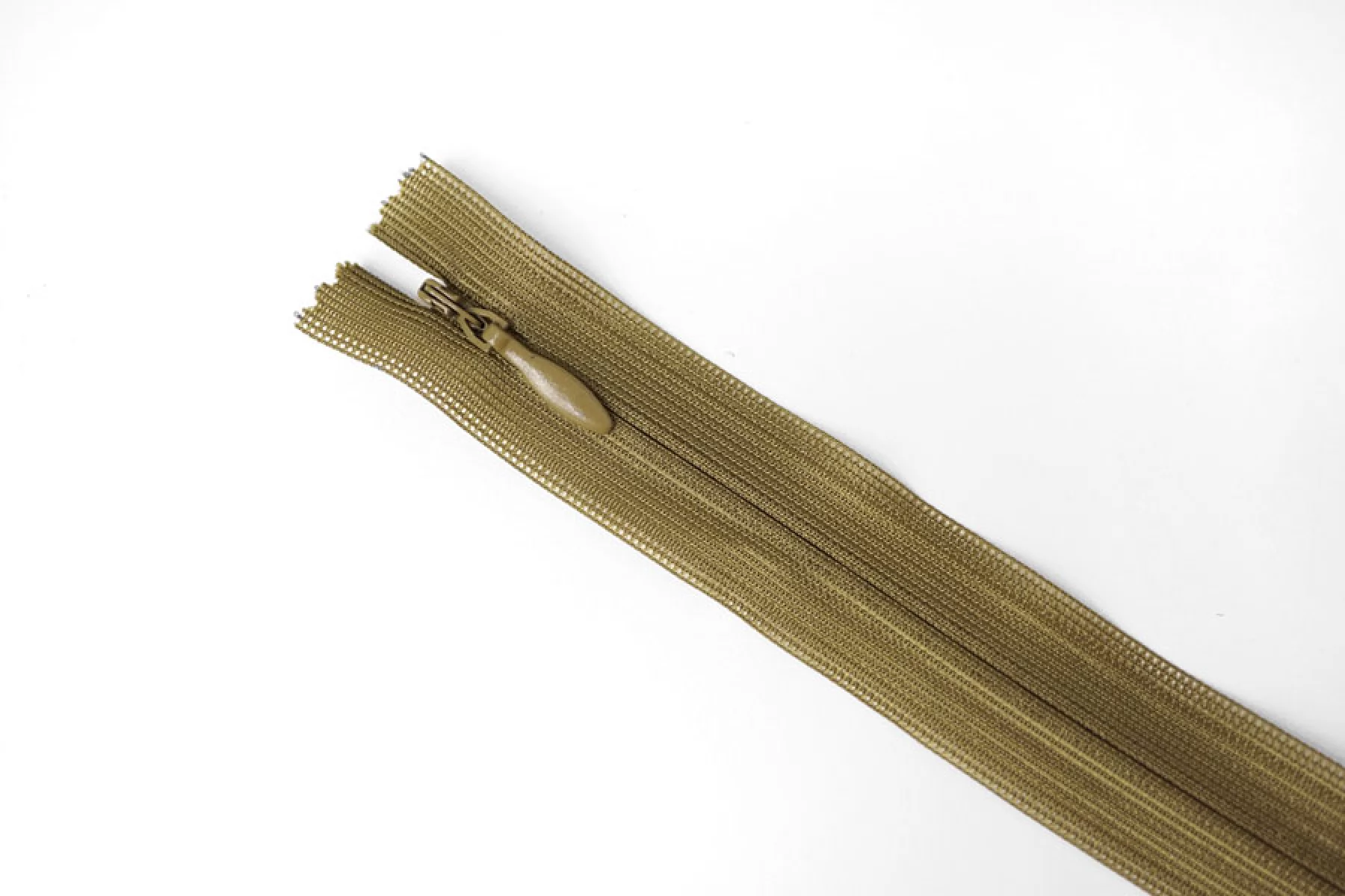 Потайная молния оттенка оливкового хаки, длина 52,5 см. Неразъемная. Зубцы пластиковые, слайдер и пуллер - металл. Ширина молнии 2,4 см. Ширина зубцов 4 мм.