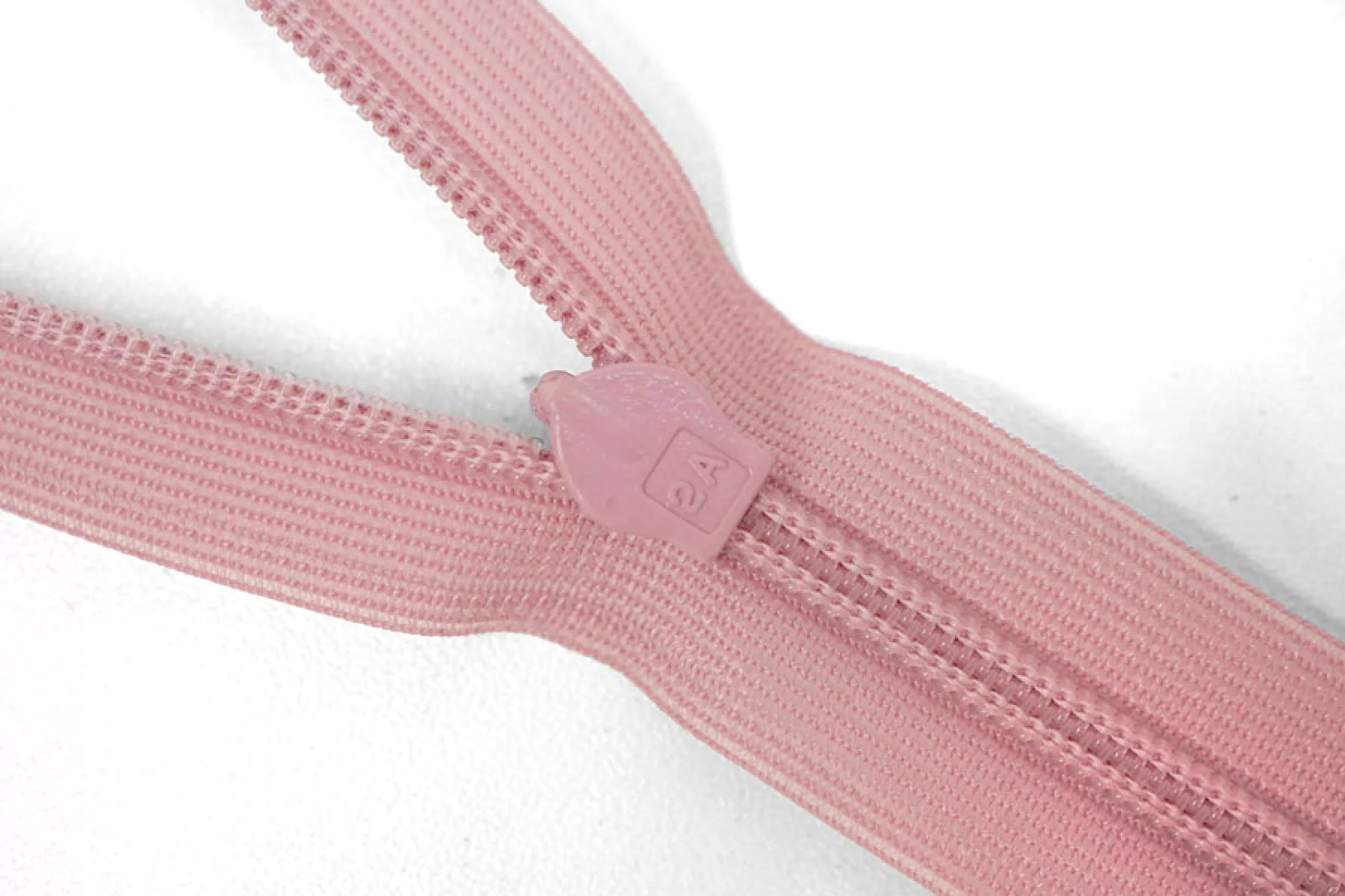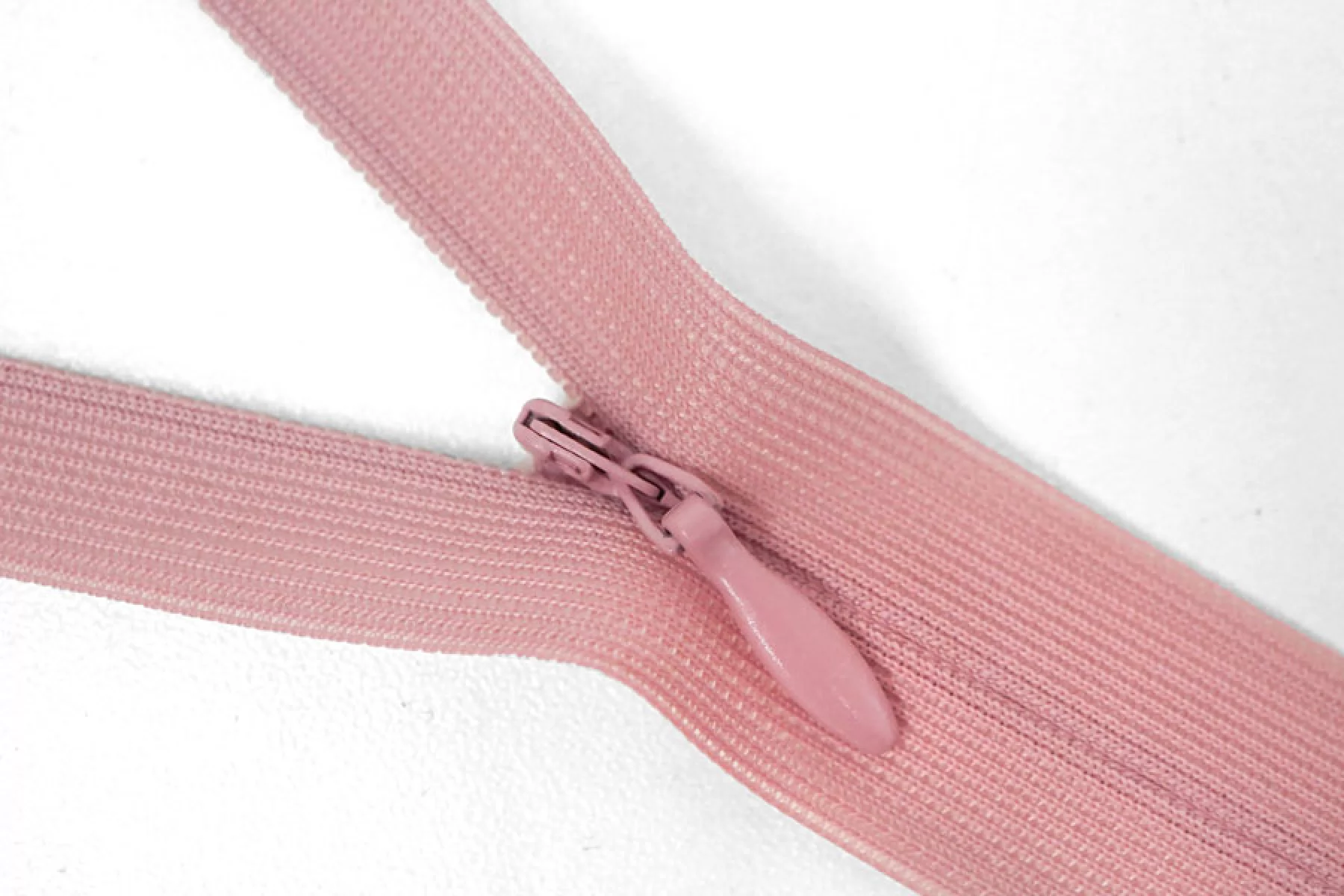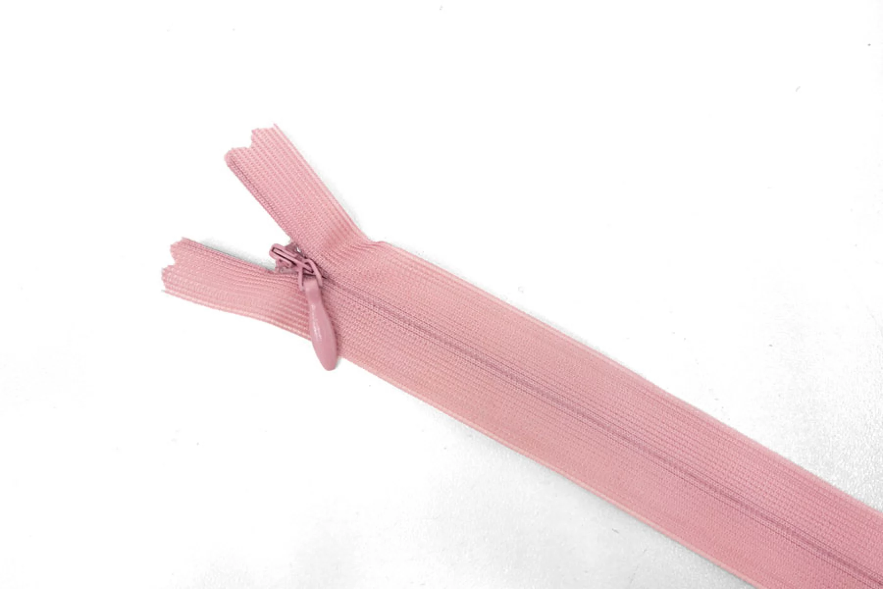 Потайная молния пыльно-розового оттенка, длина 20 см. Неразъемная. Зубцы пластиковые, слайдер и пуллер - металл. Ширина молнии 2,3 см. Ширина зубцов 5 мм.