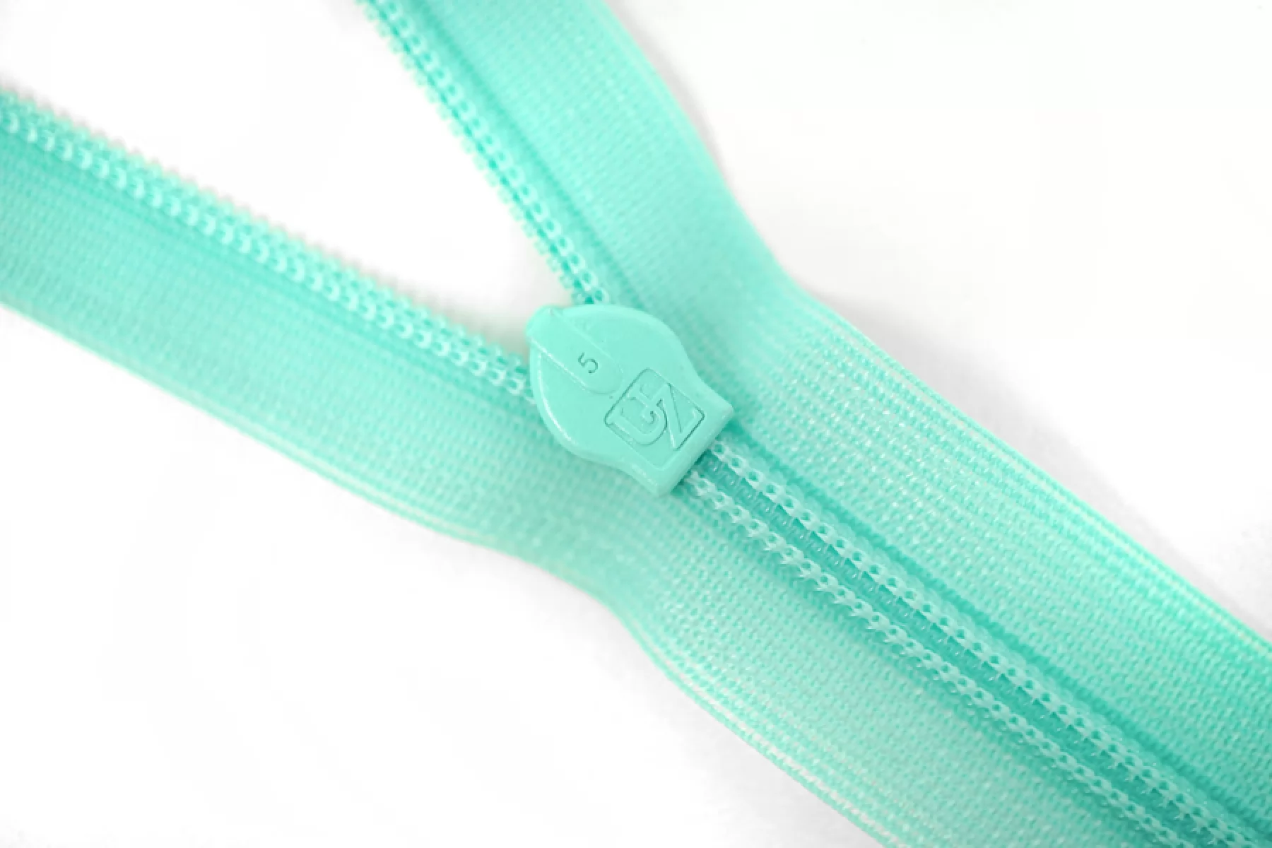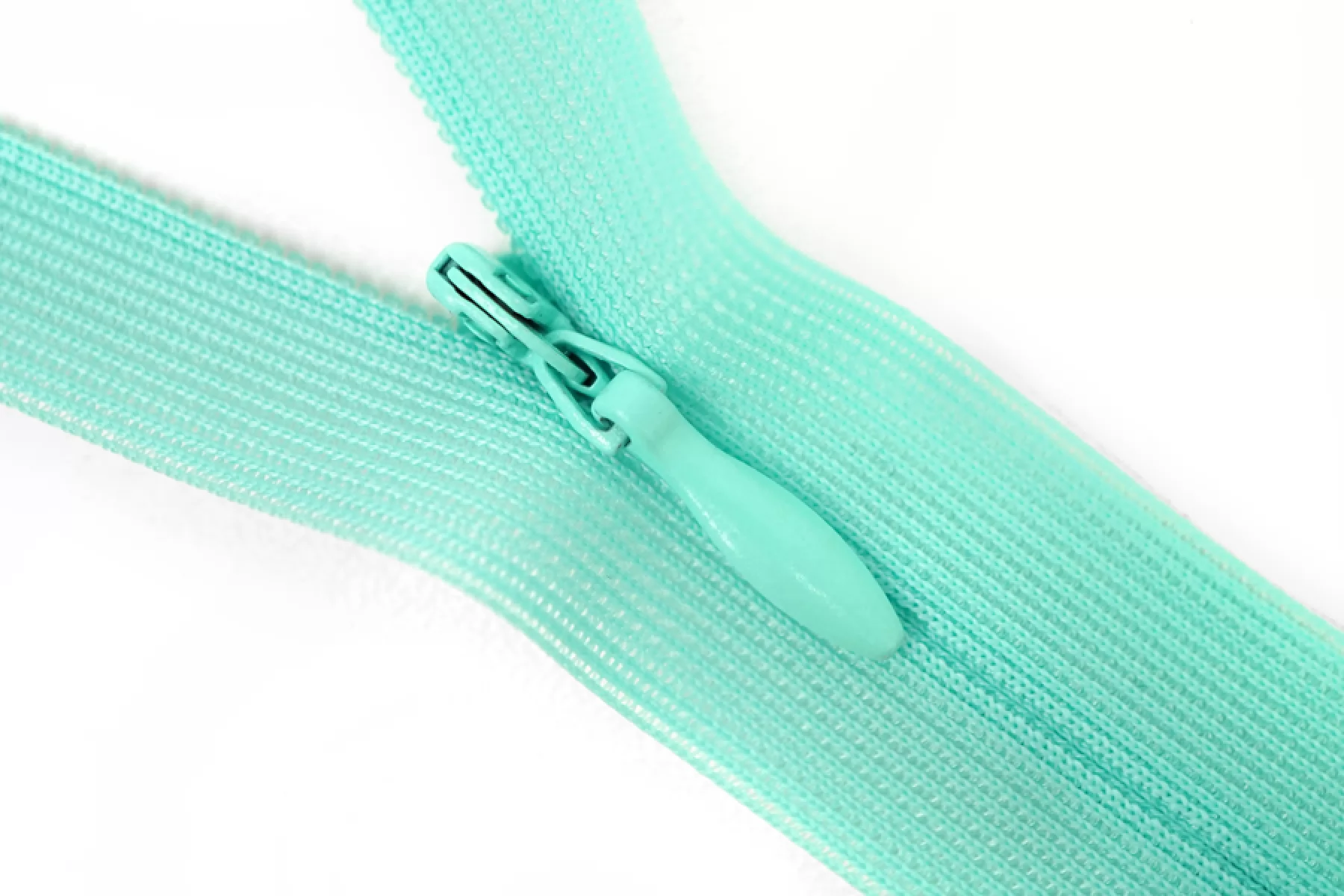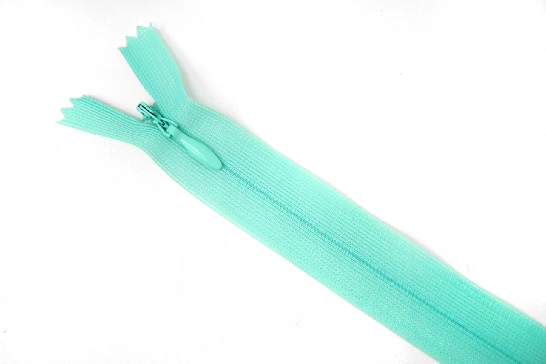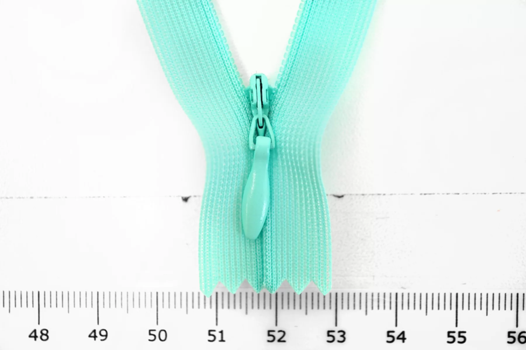 Потайная молния красивого оттенка тиффани от UZ, длина 100 см. Неразъемная. Зубцы пластиковые, слайдер и пуллер - металл. Ширина молнии 2 см. Ширина зубцов 4 мм.