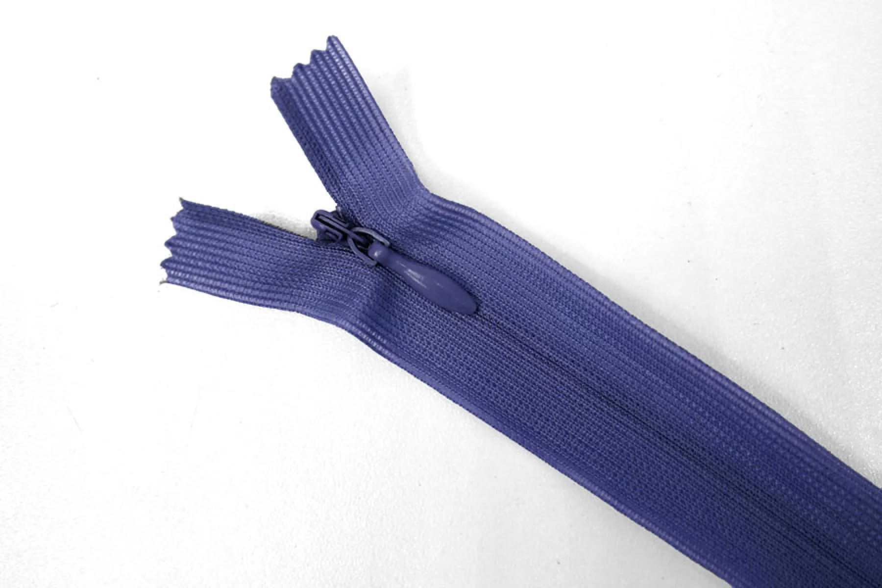 Потайная молния ярко-синего оттенка , длина 20 см. Неразъемная. Зубцы пластиковые, слайдер и пуллер - металл в цвет молнии. Ширина молнии 2,2 см. Ширина зубцов 4 мм.