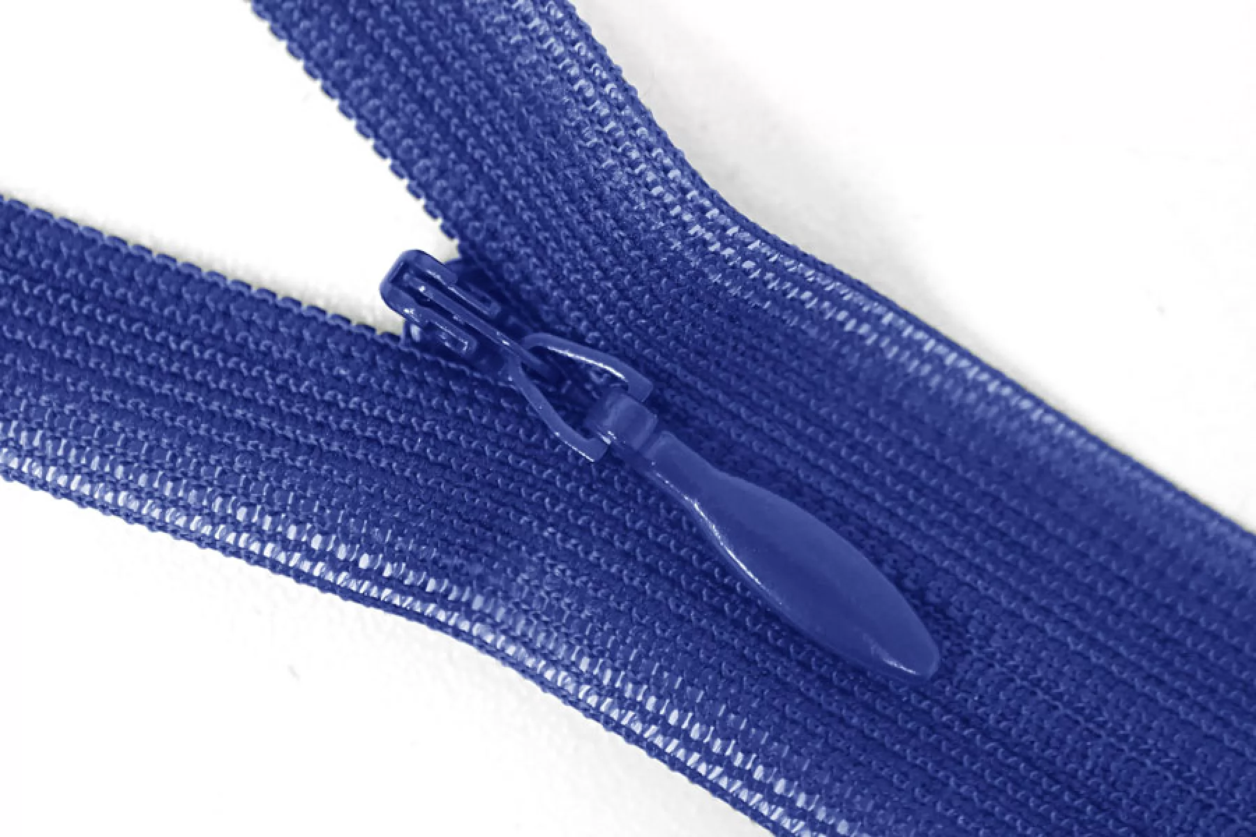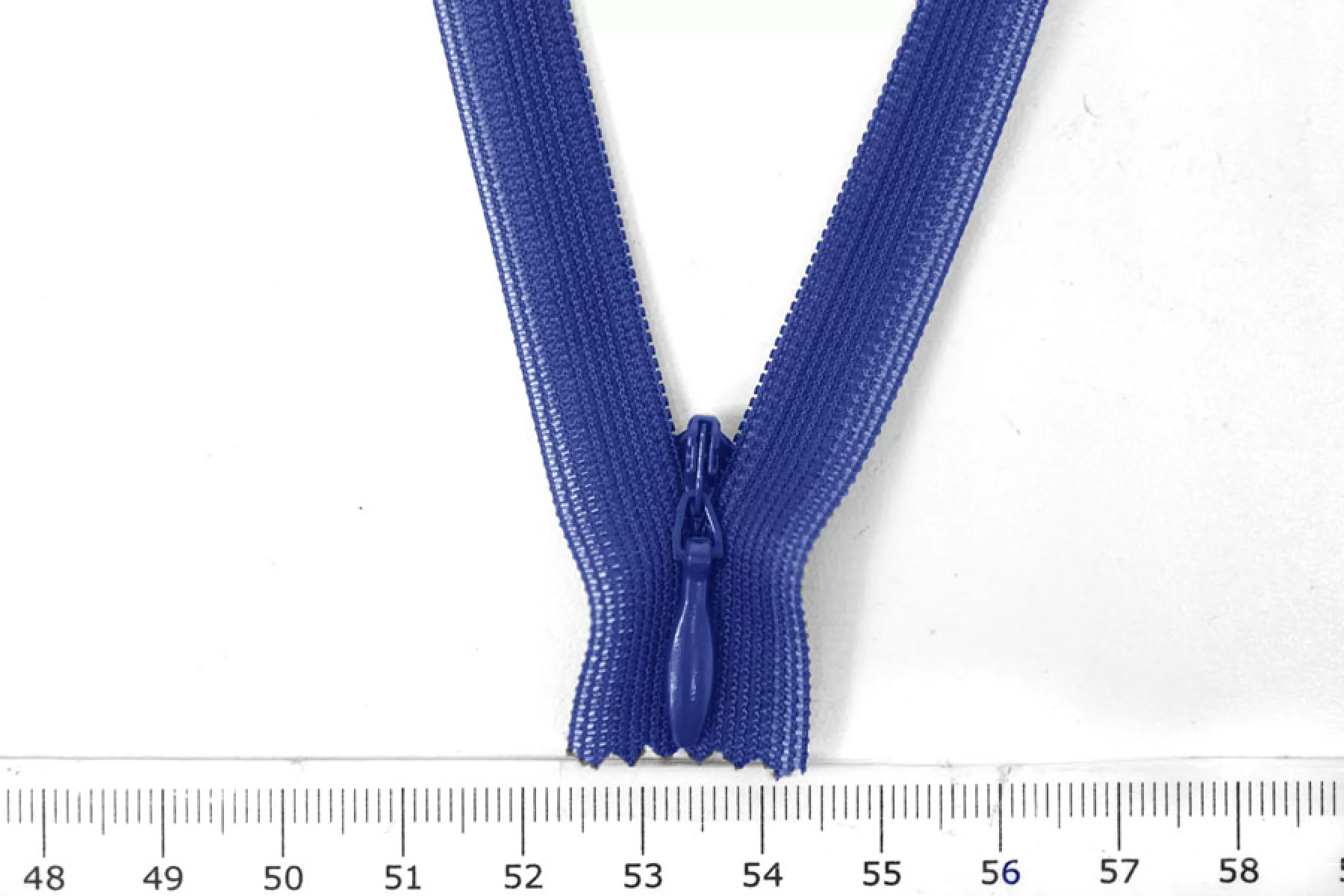 Потайная молния ярко-синего оттенка , длина 25 см. Неразъемная. Зубцы пластиковые, слайдер и пуллер - металл в цвет молнии. Ширина молнии 2,2 см. Ширина зубцов 4 мм.