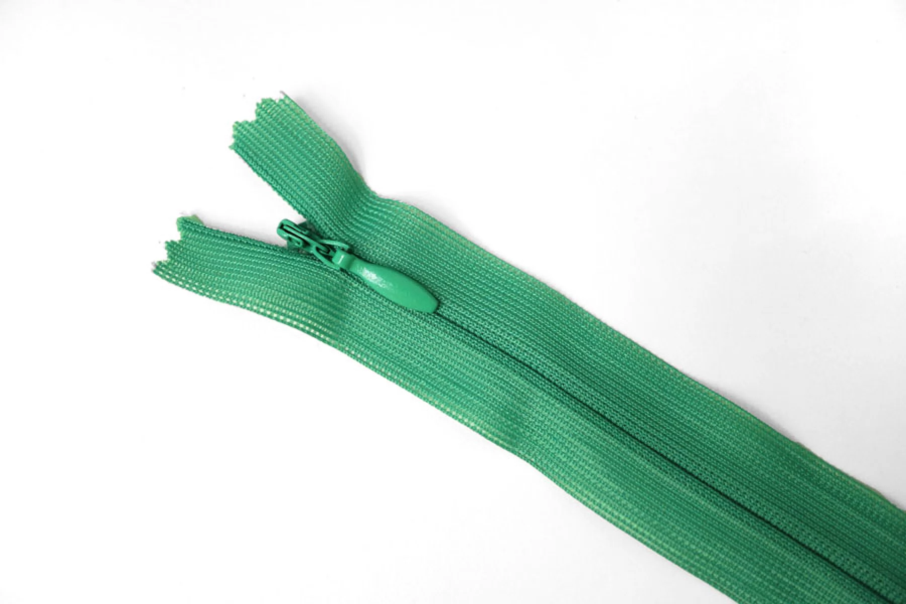 Потайная молния неразъемная, изумрудно-зеленого оттенка, от YKK , длина 21,5 см. Неразъемная. Зубцы пластиковые, слайдер и пуллер - металл. Ширина молнии 2 см. Ширина зубцов 4 мм.