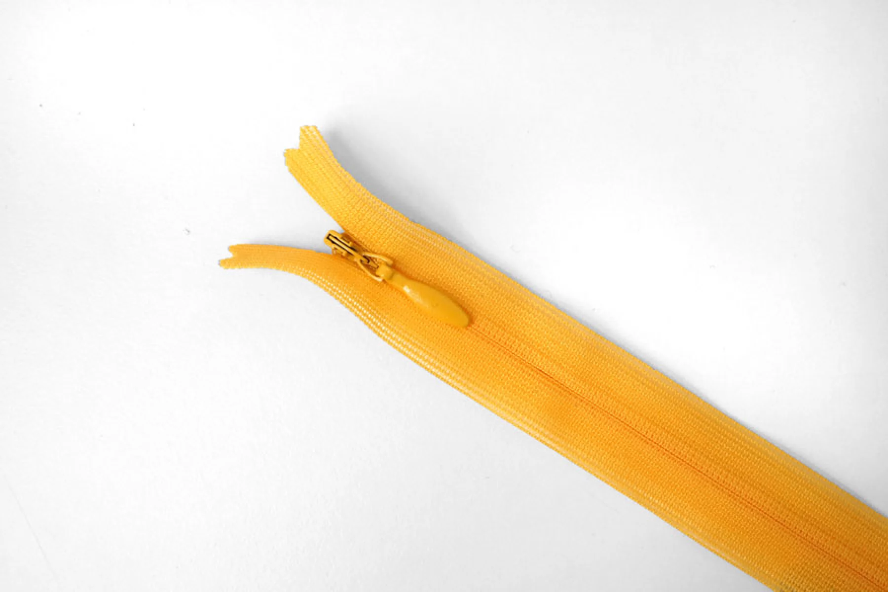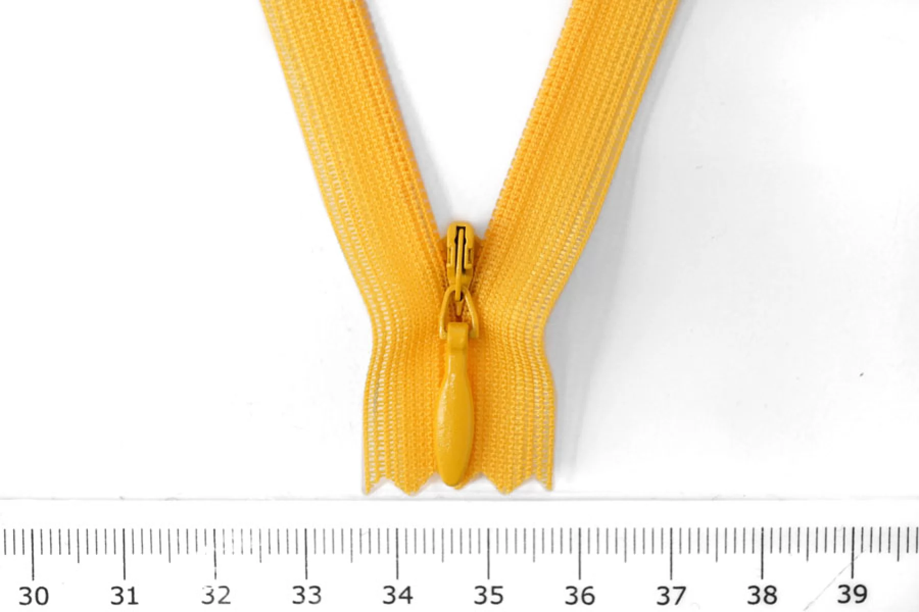 Потайная молния неразъемная, насыщенно-желтого теплого оттенка, от ZipLon длина 24,5 см. Неразъемная. Зубцы пластиковые, слайдер и пуллер - металл. Ширина молнии 2 см. Ширина зубцов 4 мм.