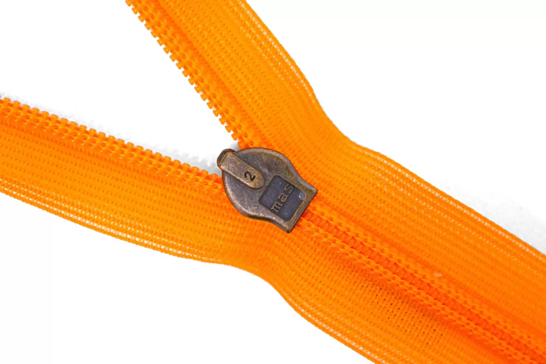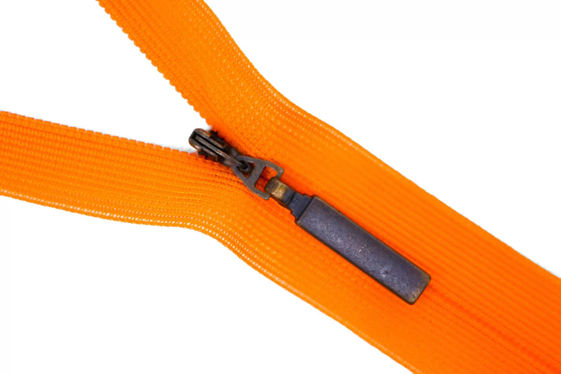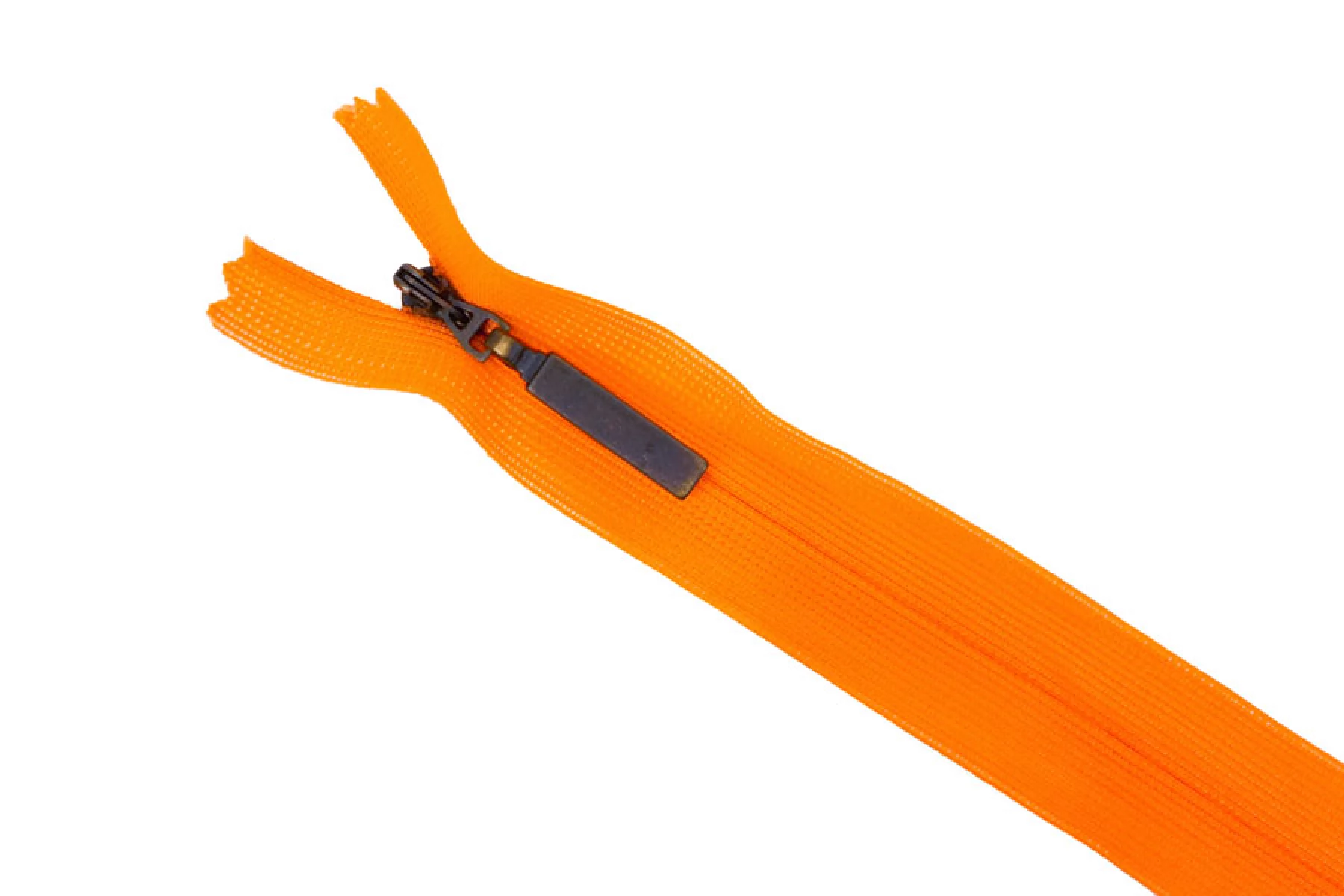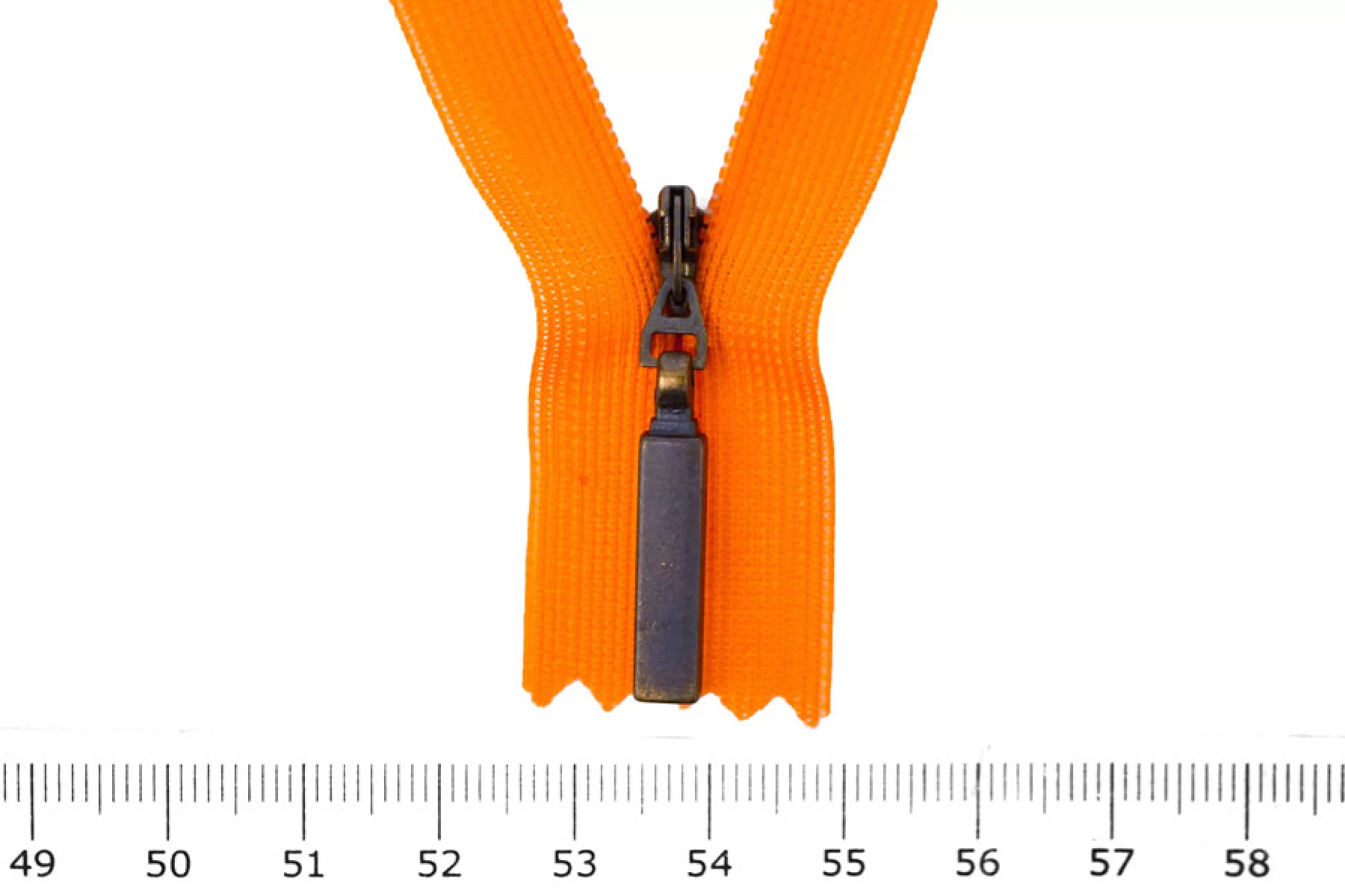 Потайная молния оранжевого оттенка , длина 16 см. Неразъемная. Зубцы пластиковые, слайдер и пуллер - металл бронза. Ширина молнии 2 см. Ширина зубцов 4 мм.