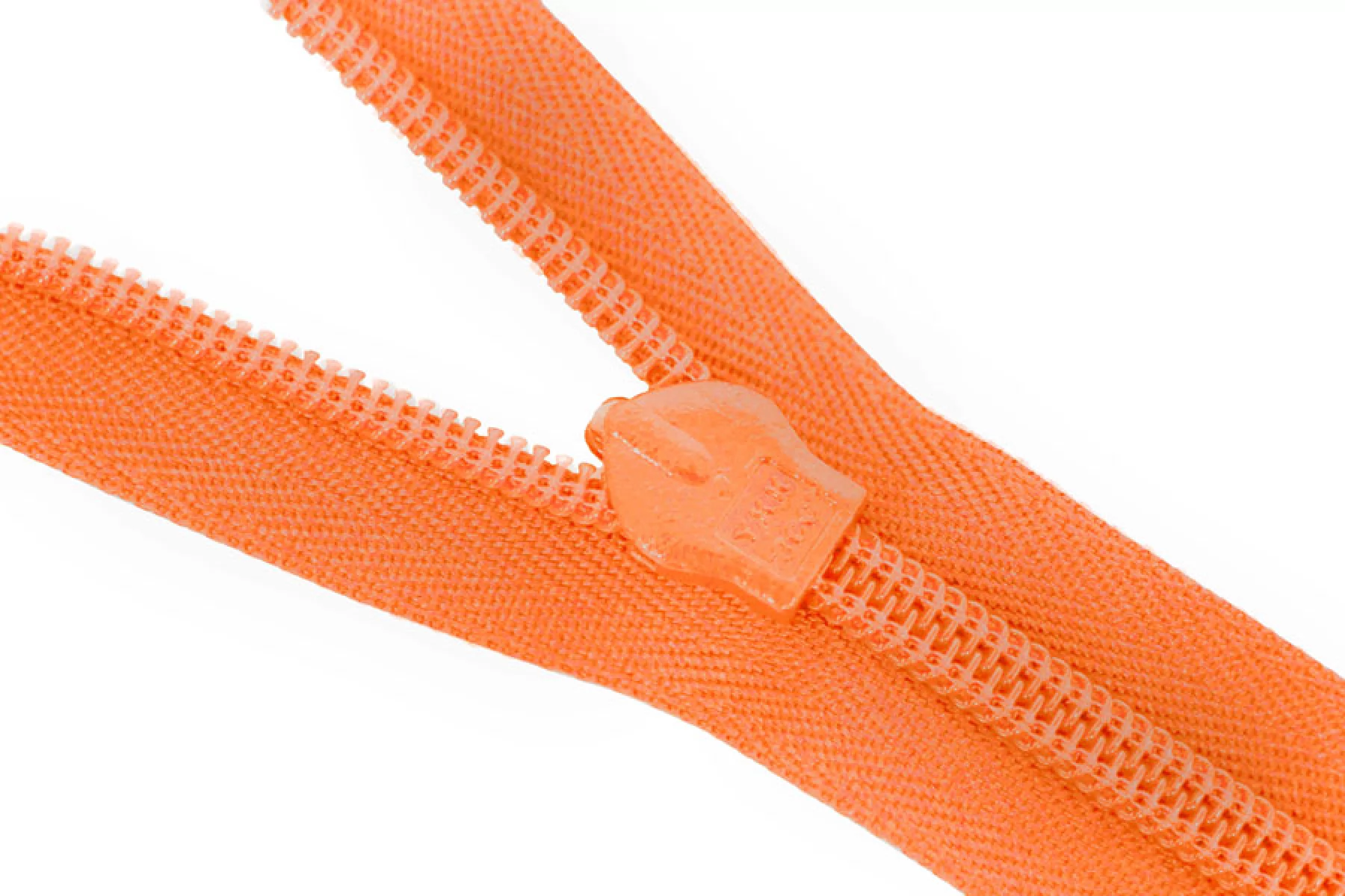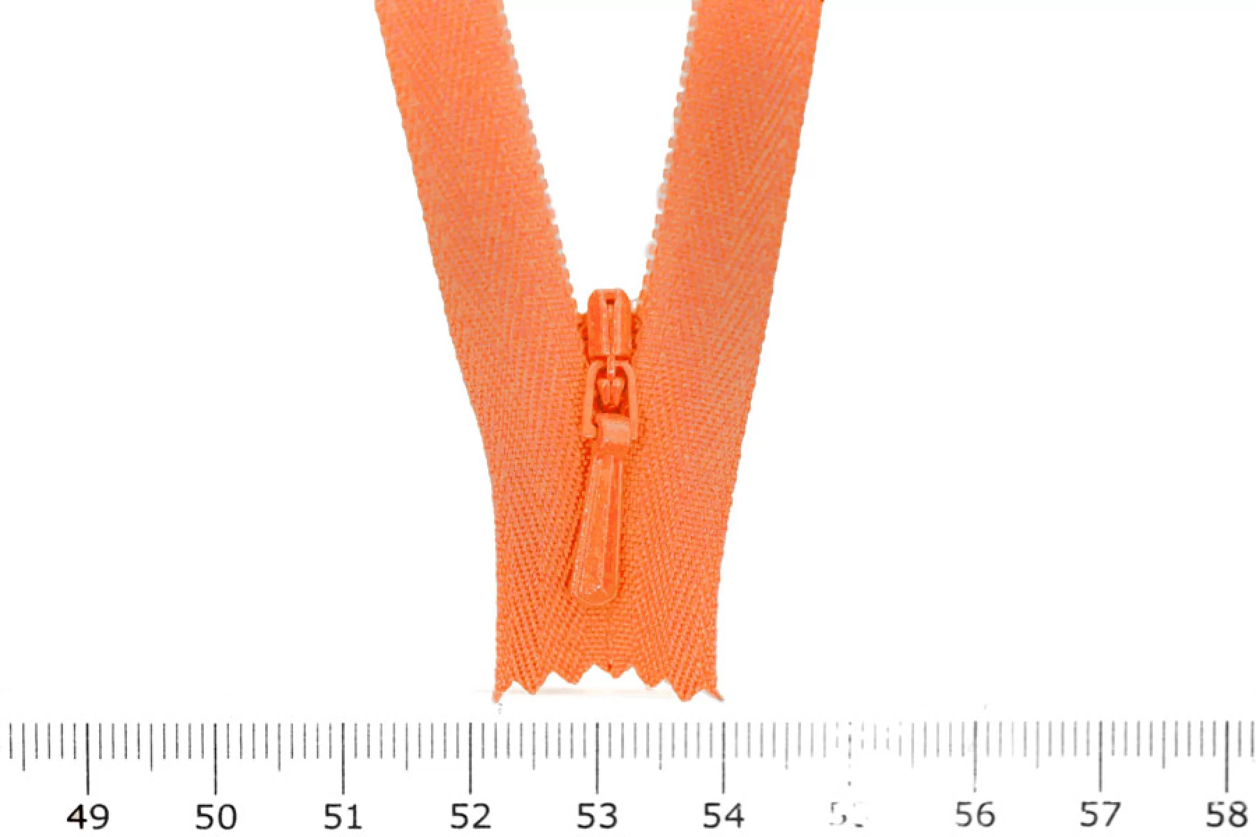 Потайная молния оранжевого оттенка от бренда YKK , длина 22 см. Неразъемная. Зубцы пластиковые, слайдер и пуллер - металл. Ширина молнии 2 см. Ширина зубцов 4 мм.