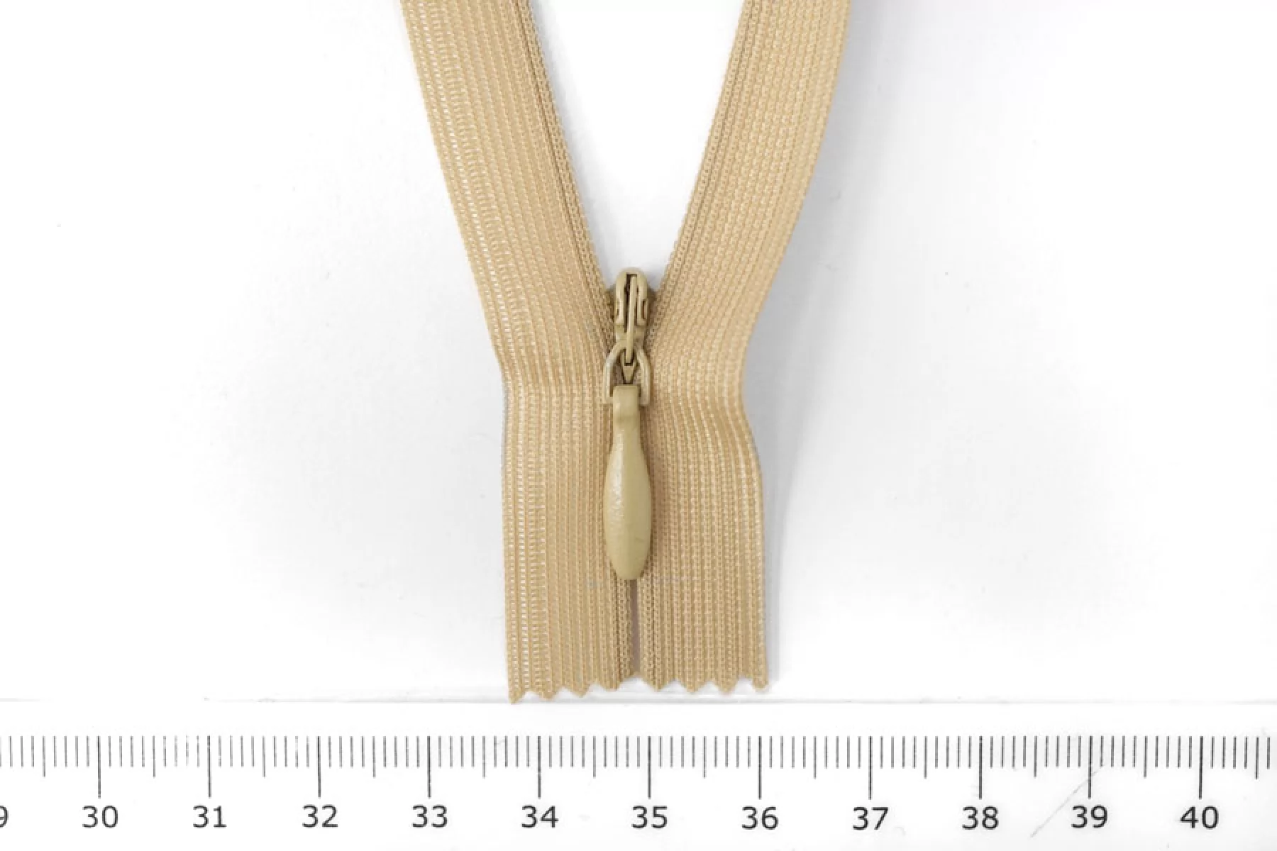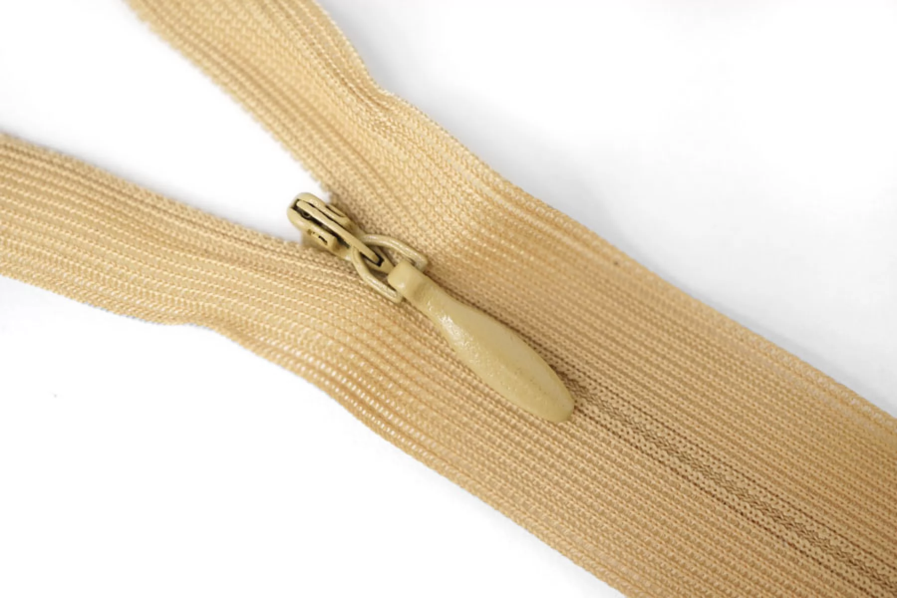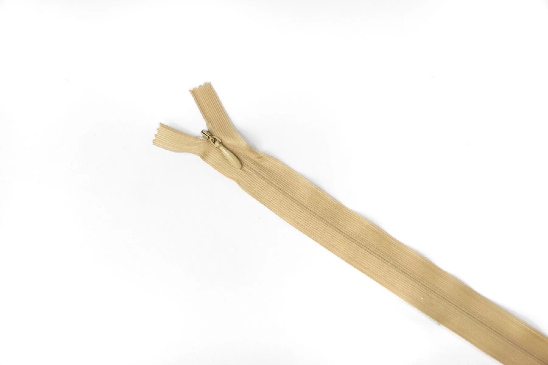 Потайная молния в песочном оттенке, длина 25 см. Неразъемная. Зубцы пластиковые, слайдер и пуллер - металл. Ширина молнии 2,2 см. Ширина зубцов 4 мм.