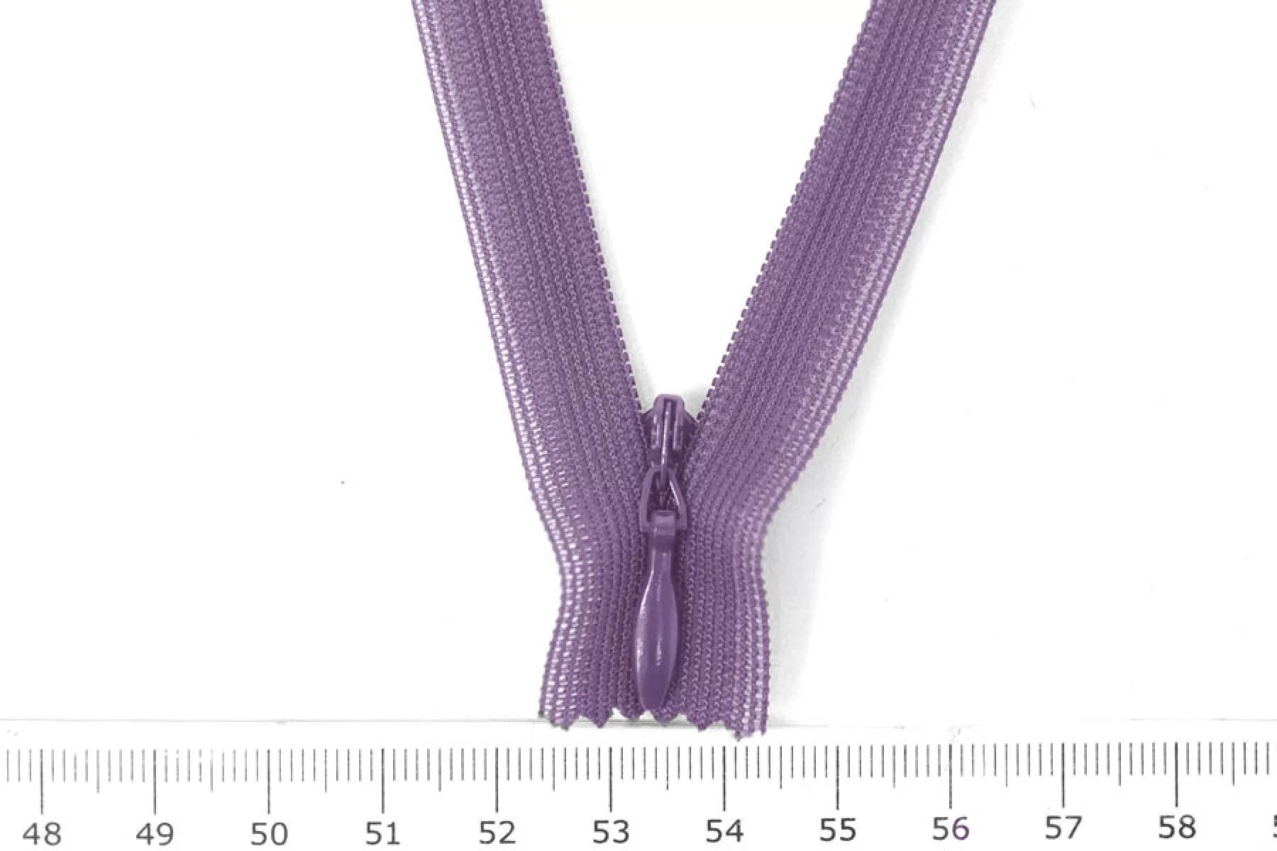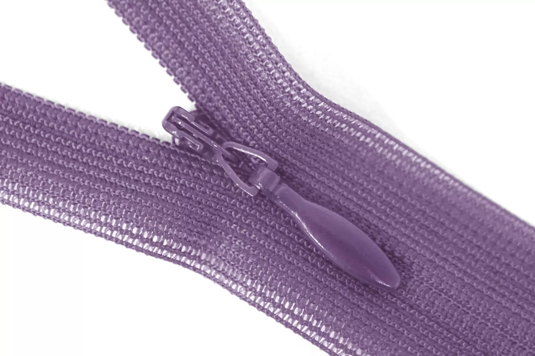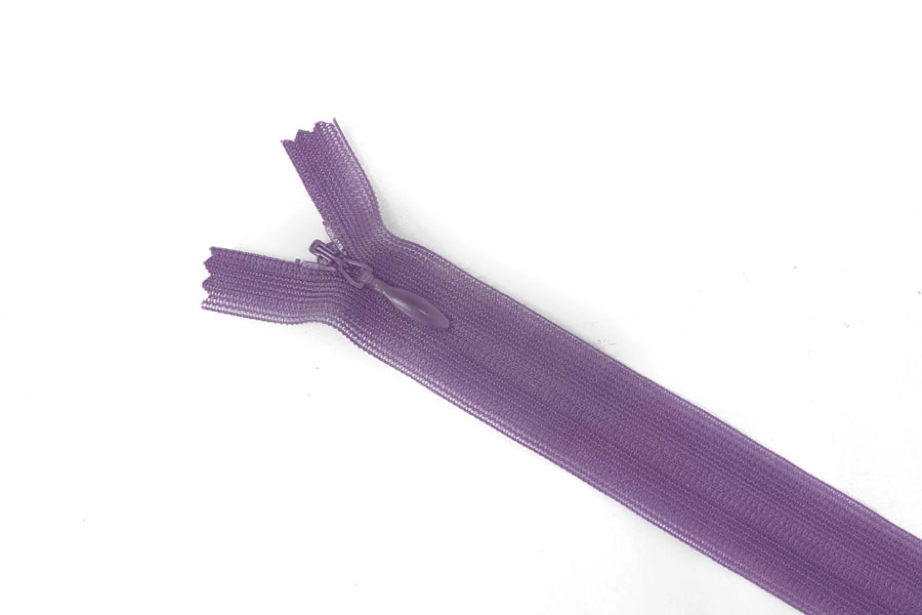 Потайная молния пыльно-фиолетового цвета , длина 25 см. Неразъемная. Зубцы пластиковые, слайдер и пуллер - металл. Ширина молнии 2 см. Ширина зубцов 4 мм.