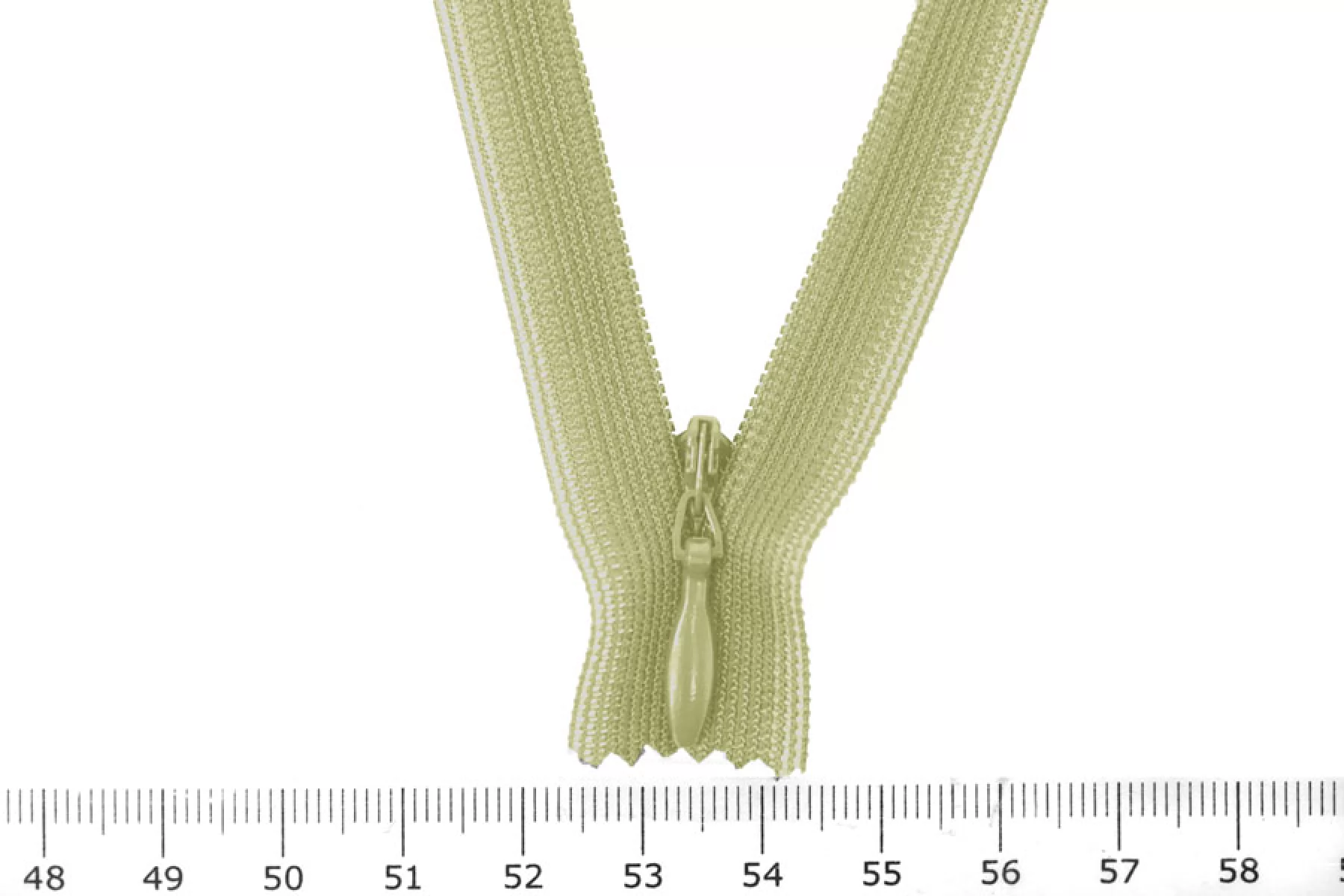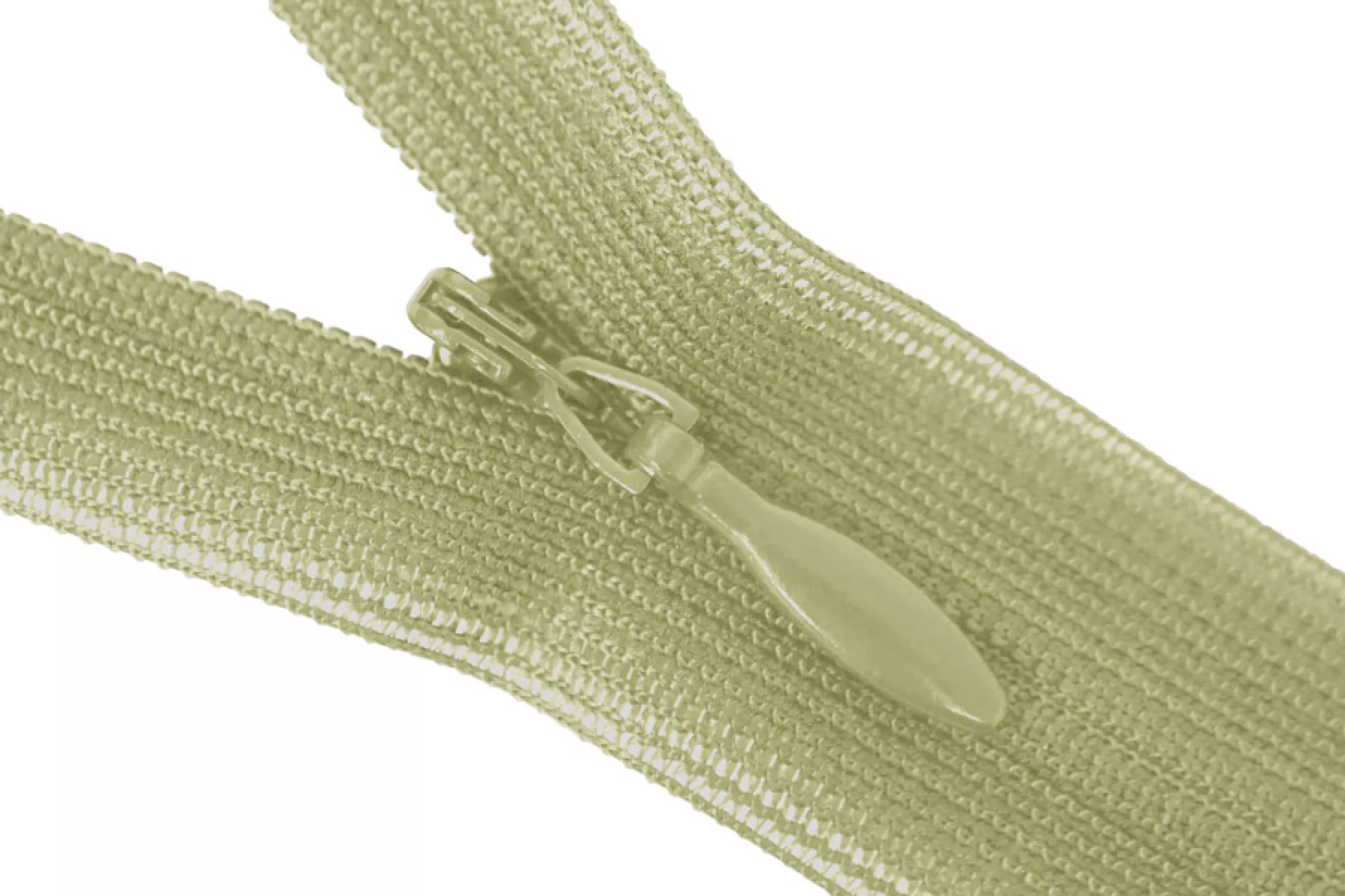 Потайная молния пыльно-оливкового цвета от YKK, длина 22 см. Слайдер и пулер -металл. в цвет молнии. Ширина молнии 2,2 см, ширина зубцов 4мм.