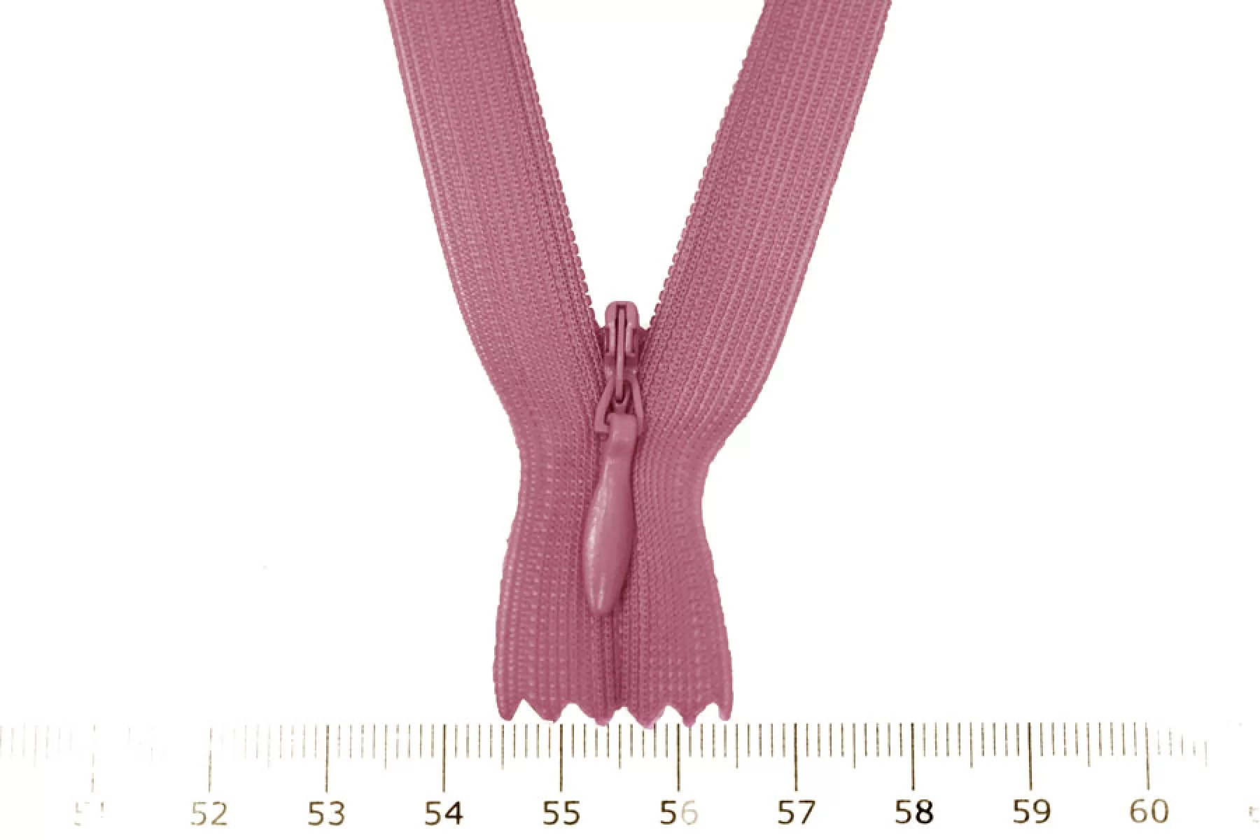 Потайная молния пыльно-розового цвета от YKK, длина 20 см. Слайдер и пулер -металл. в цвет молнии. Ширина молнии 2,2 см, ширина зубцов 4мм.