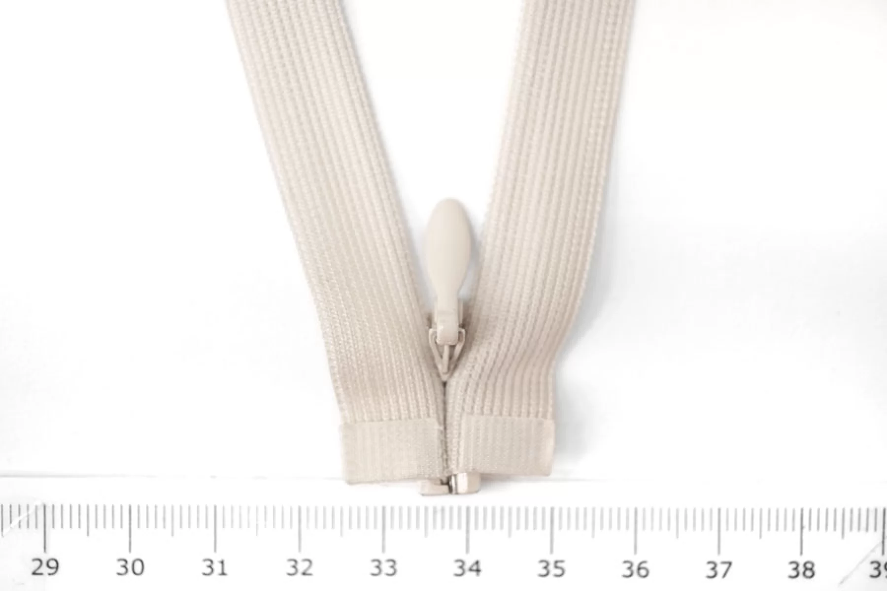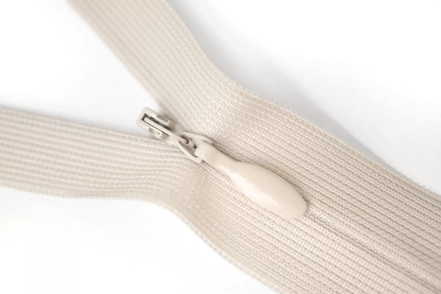 Молния потайная разъёмная серо-бежевого оттенка, однозамковая. Зубцы из пластика, слайдер, пуллер и нижний ограничитель - металл. Длина 80 см. Ширина молнии 2,5 см. Ширина зубцов - 5 мм.