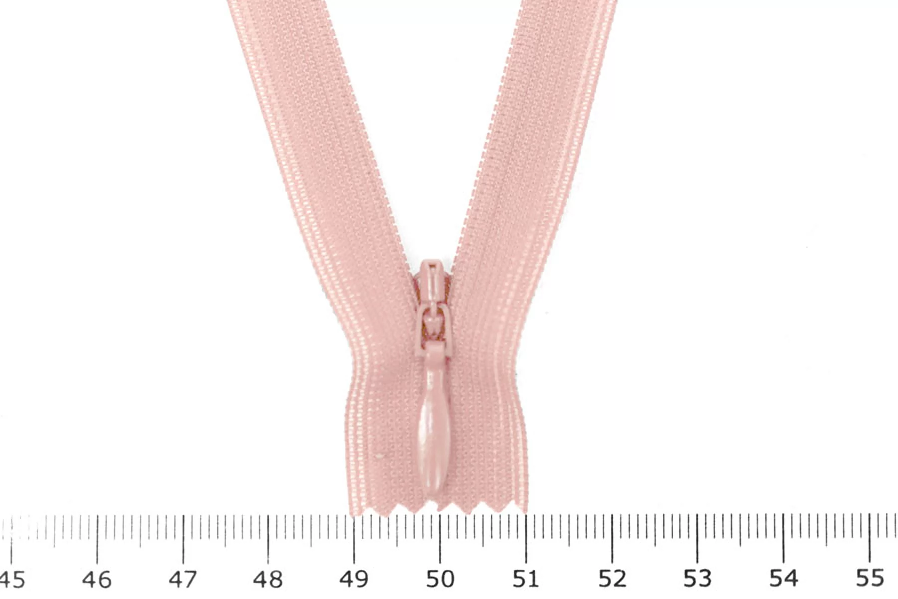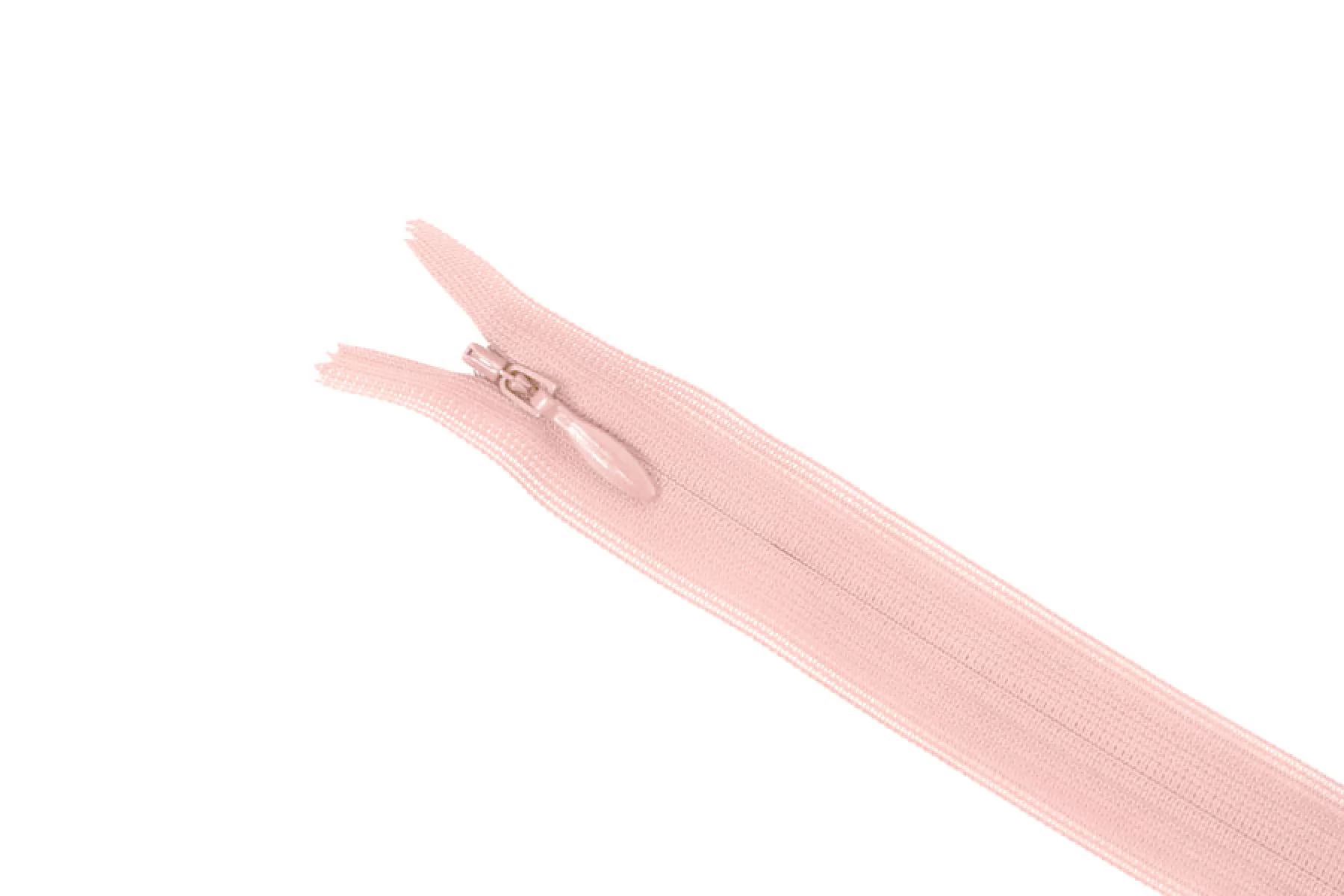 Потайная молния светло-розового цвета , длина 18 см. Неразъемная. Зубцы пластиковые, слайдер и пуллер - металл. Ширина молнии 2 см. Ширина зубцов 4 мм.
