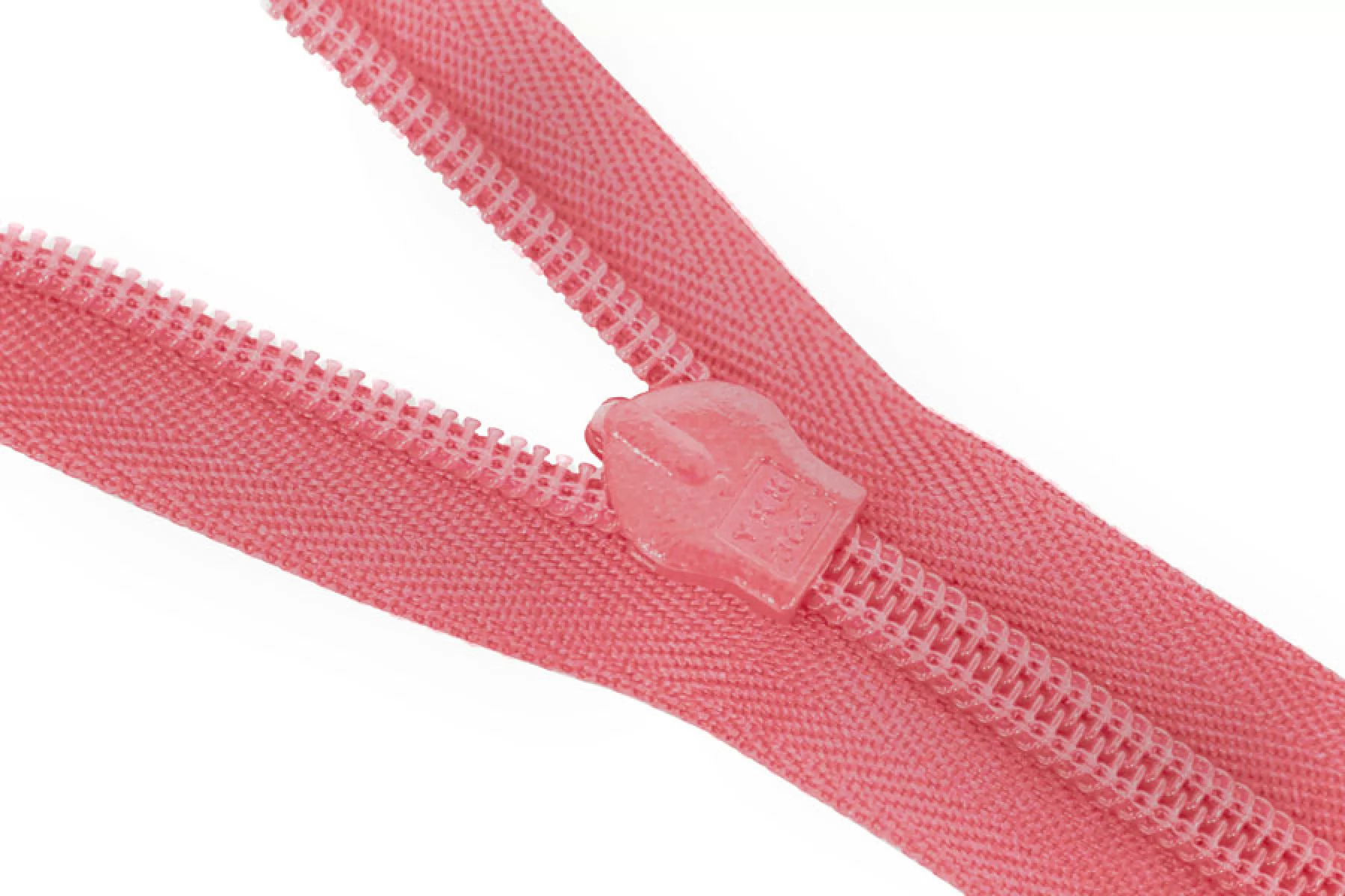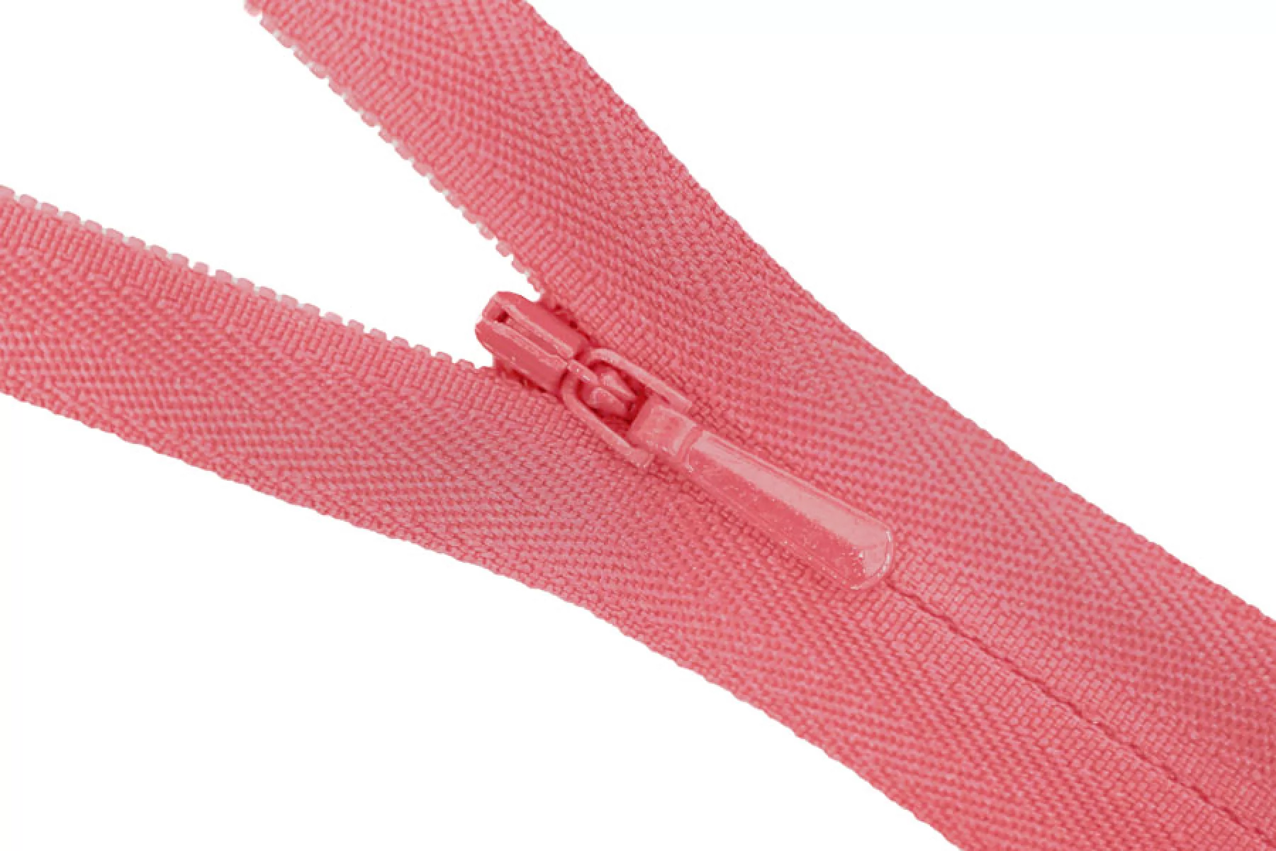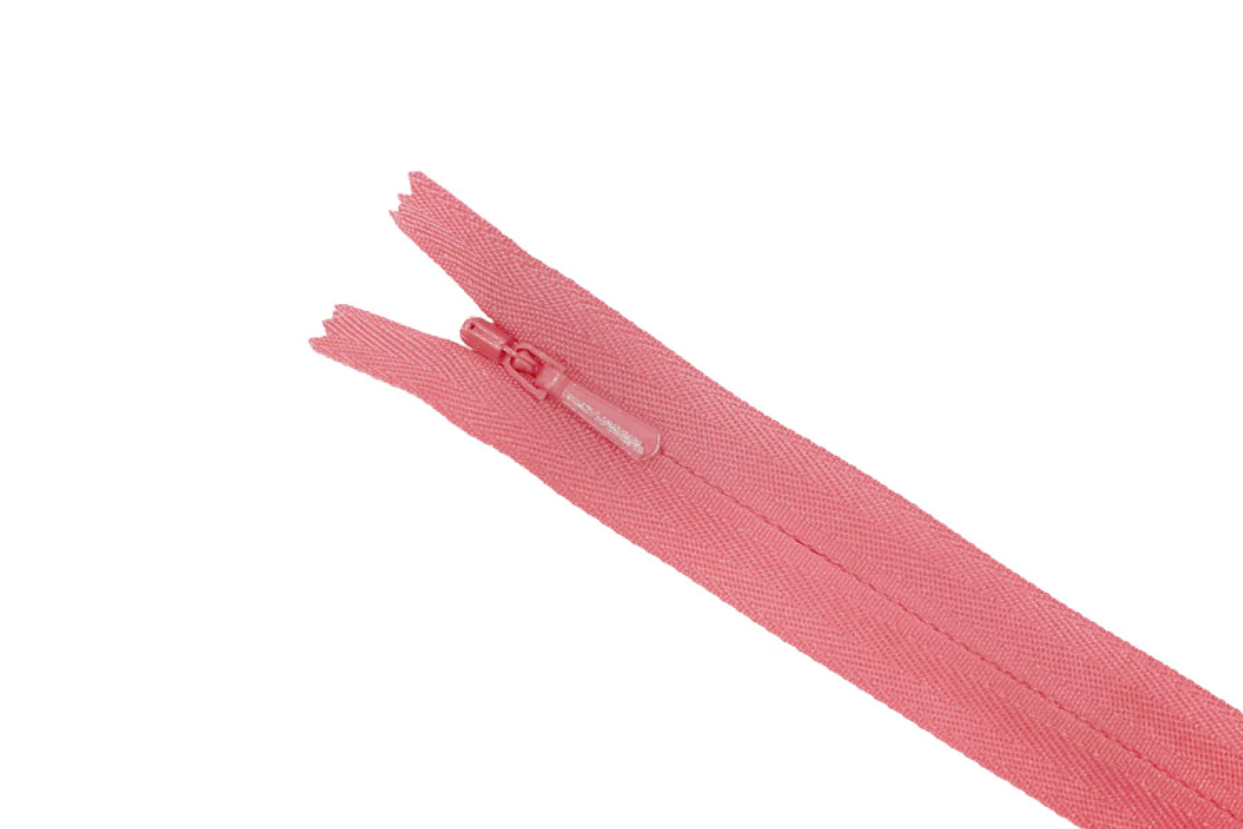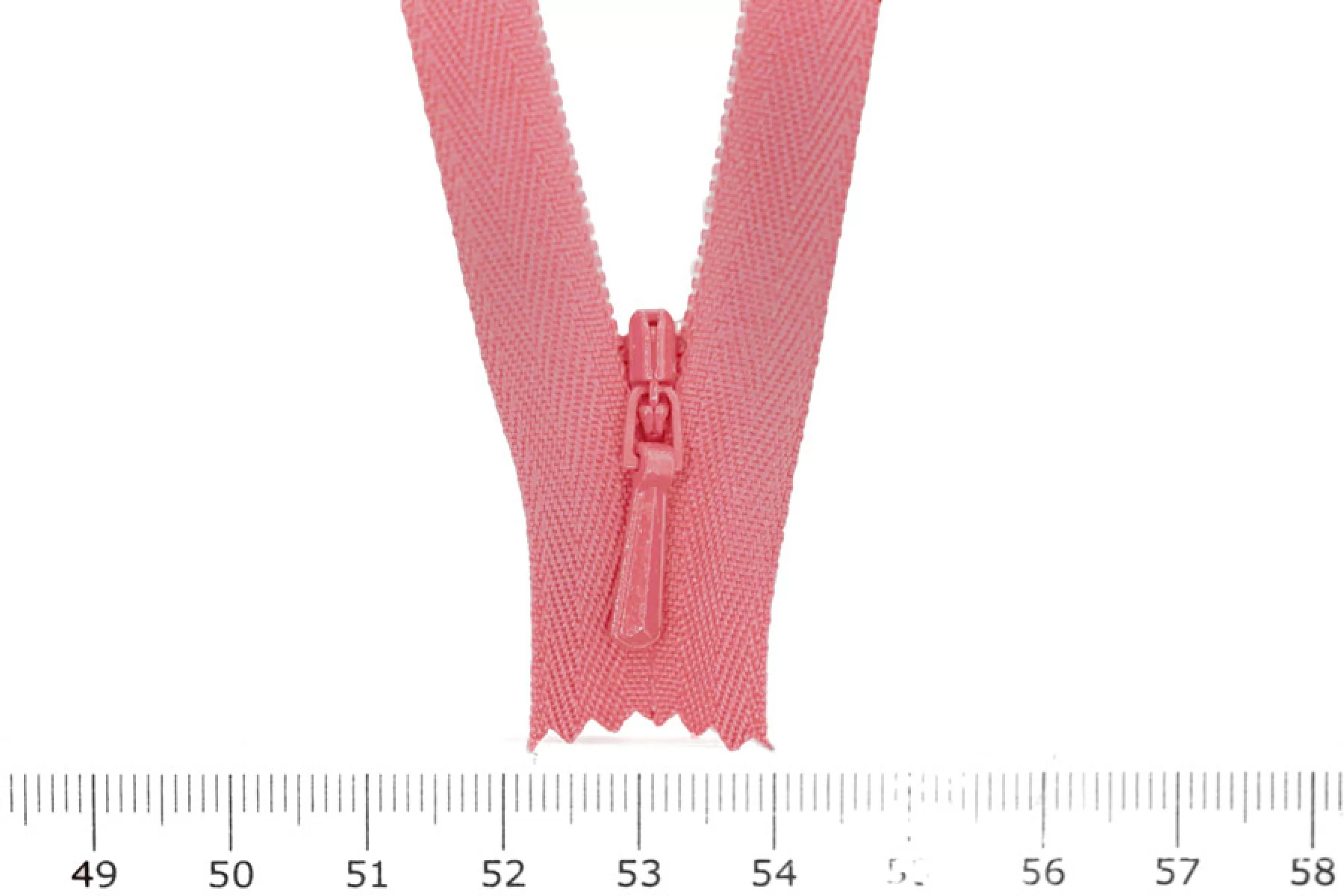 Потайная молния розового цвета , длина 20 см. Неразъемная. Зубцы пластиковые, слайдер и пуллер - металл. Ширина молнии 2 см. Ширина зубцов 4 мм.