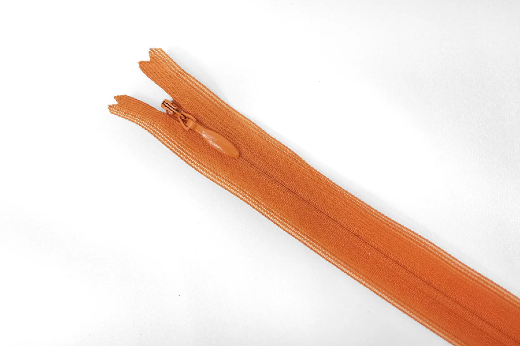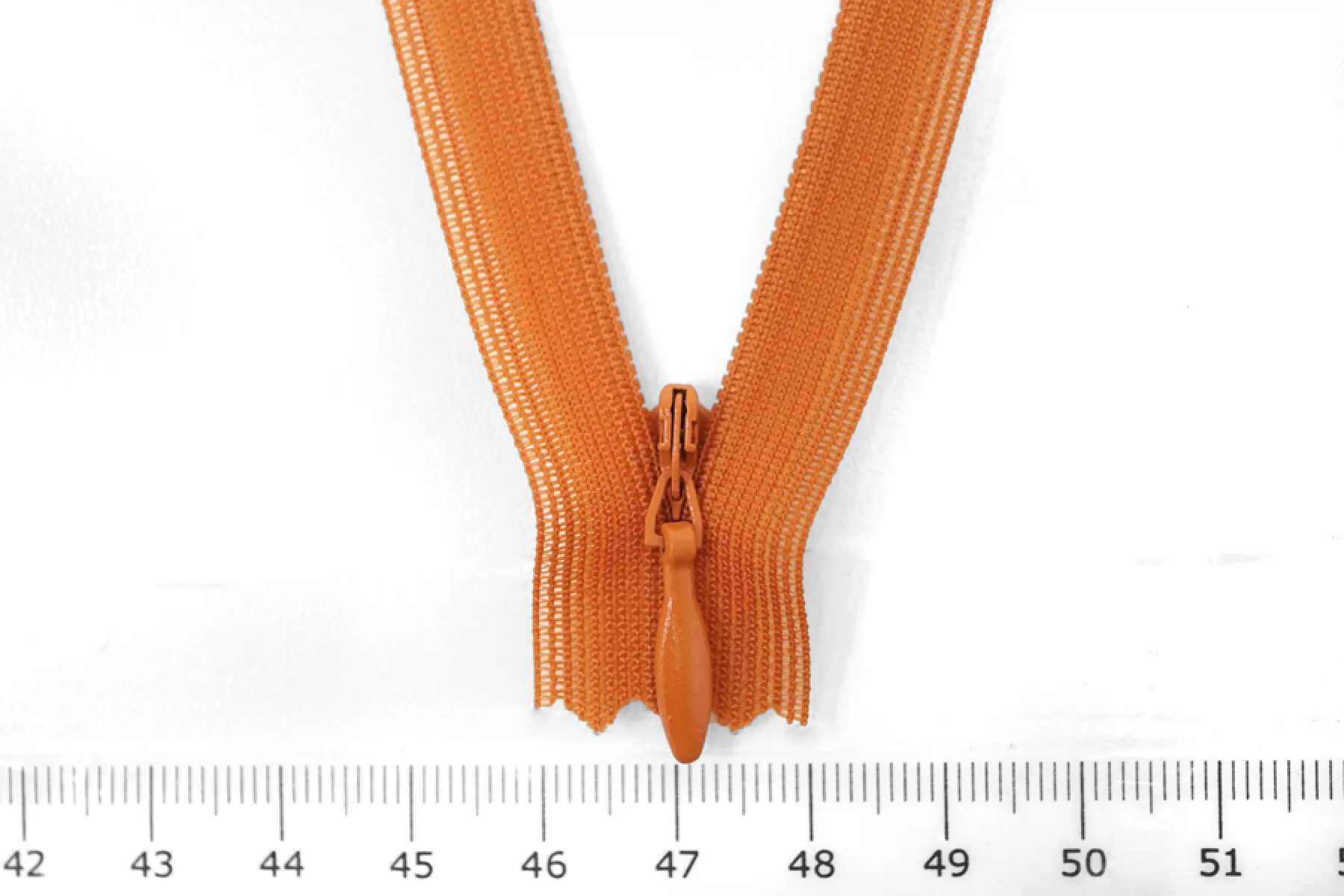 Потайная молния рыжего оттенка от бренда YKK , длина 26 см. Неразъемная. Зубцы пластиковые, слайдер и пуллер - металл. Ширина молнии 2 см. Ширина зубцов 4 мм.