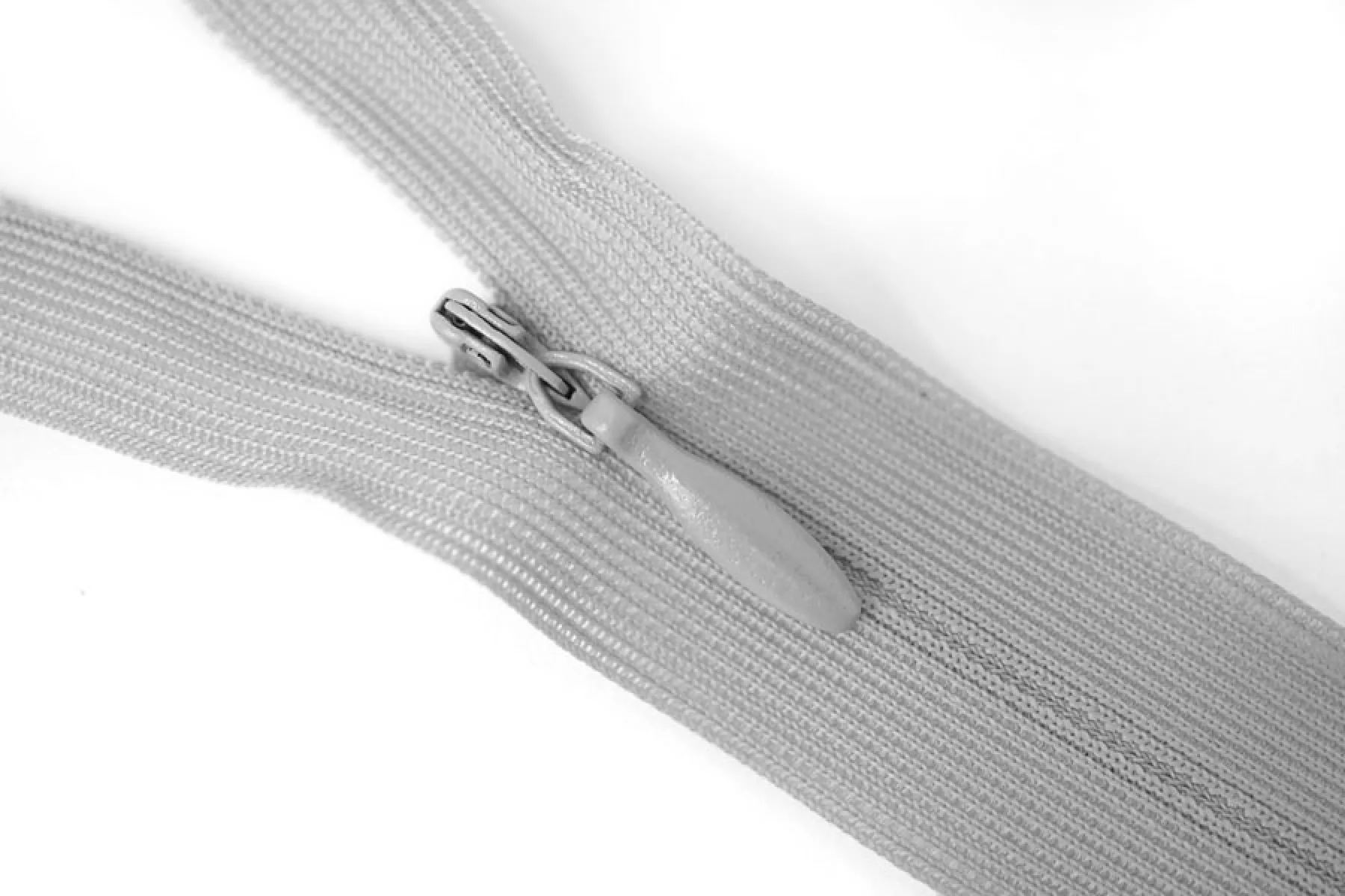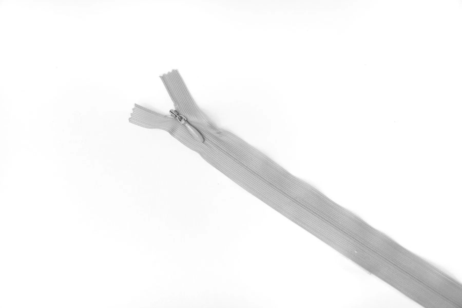 Потайная молния в сером цвете, длина 50 см. Неразъемная. Зубцы пластиковые, слайдер и пуллер - металл. Ширина молнии 2,5 см. Ширина зубцов 5 мм.