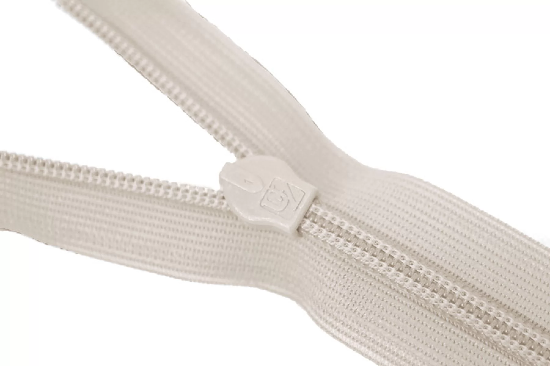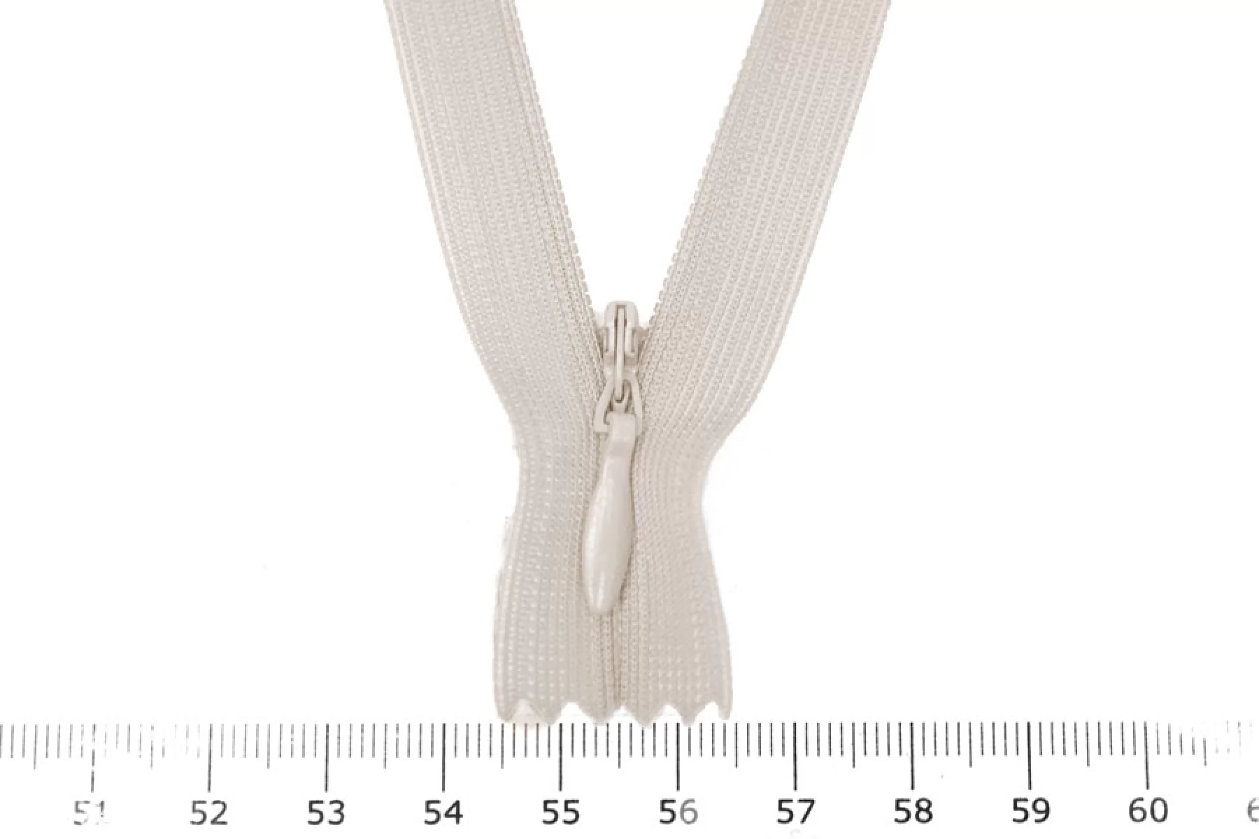 Потайная молния серо-бежевого цвета, длина 20 см. Неразъемная. Зубцы пластиковые, слайдер и пуллер - металл в тон молнии. Ширина молнии 2,2 см. Ширина зубцов 4 мм.