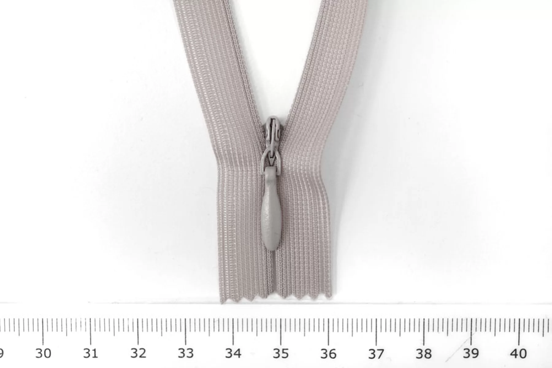 Потайная молния в оттенке серого камня, длина 44,5 см. Неразъемная. Зубцы пластиковые, слайдер и пуллер - металл. Ширина молнии 2,3 см. Ширина зубцов 4 мм.