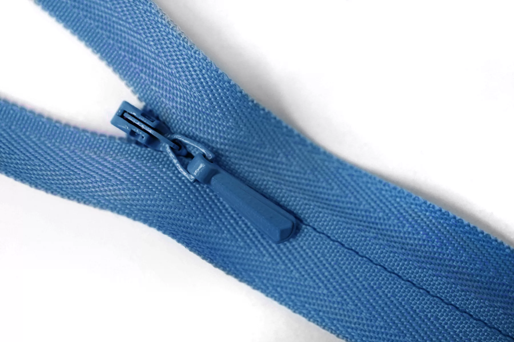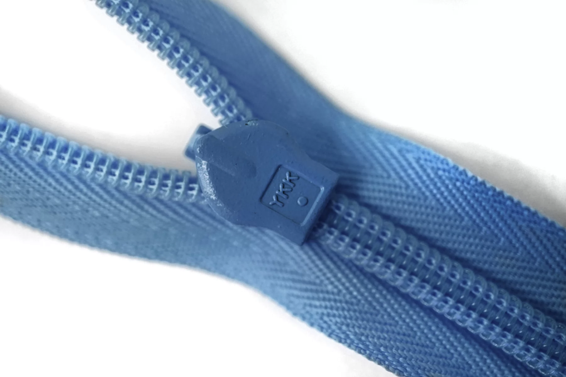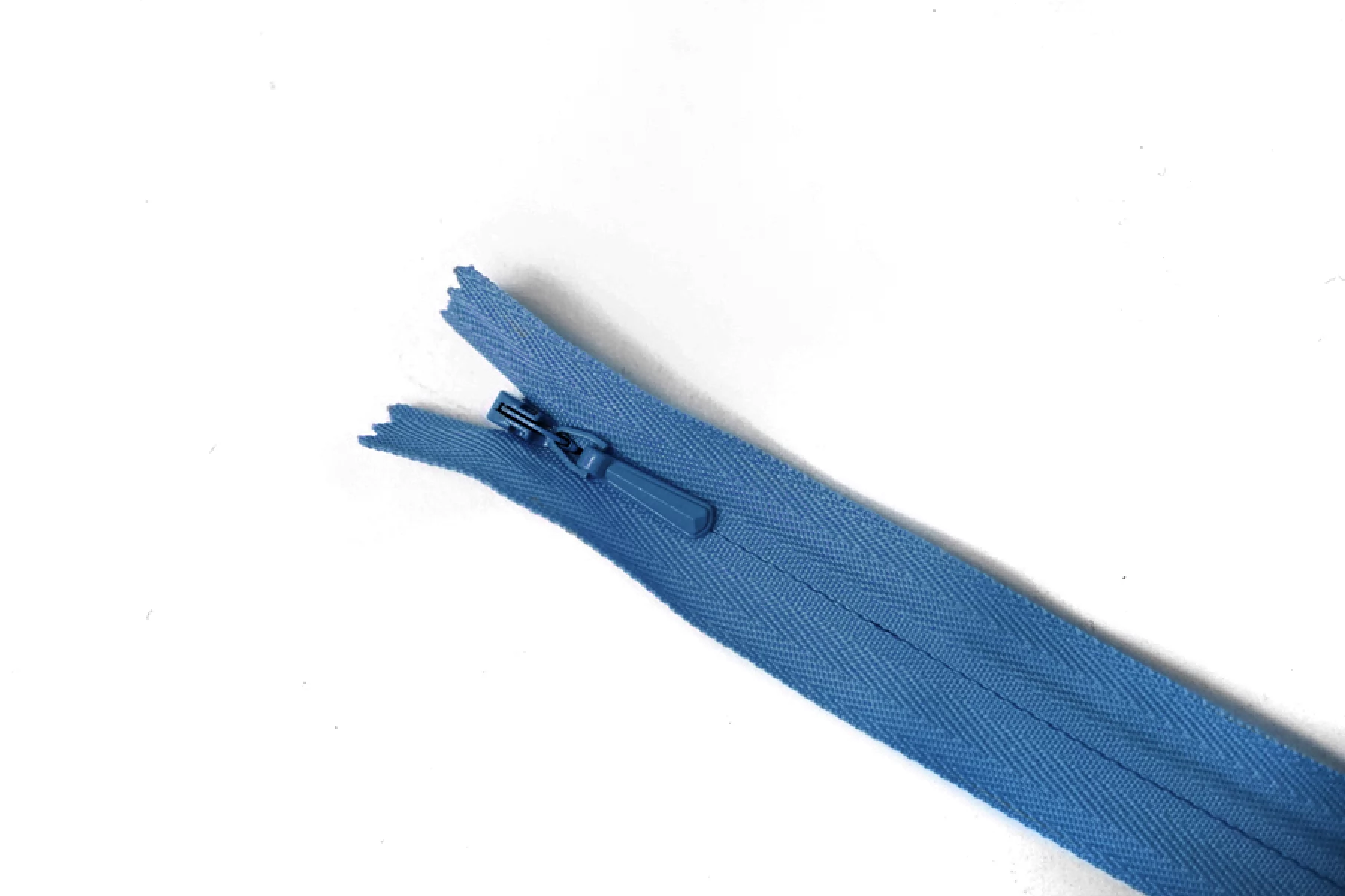 Потайная молния сине-голубого цвета от YKK, длина 20 см. Неразъемная. Зубцы пластиковвые, слайдер и пуллер металл сине-голубого цвета. Ширина молнии 1,8 см. Ширина зубцов 5 мм.