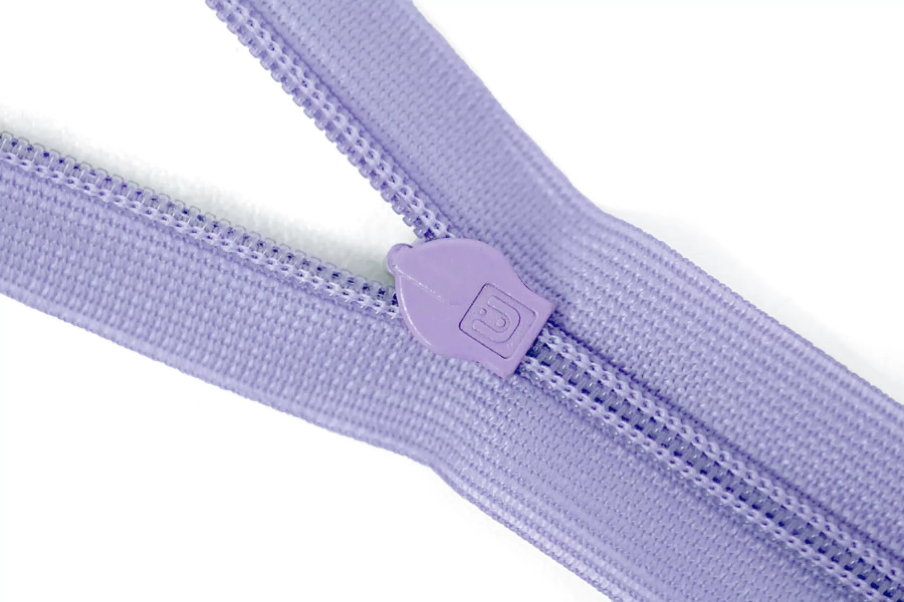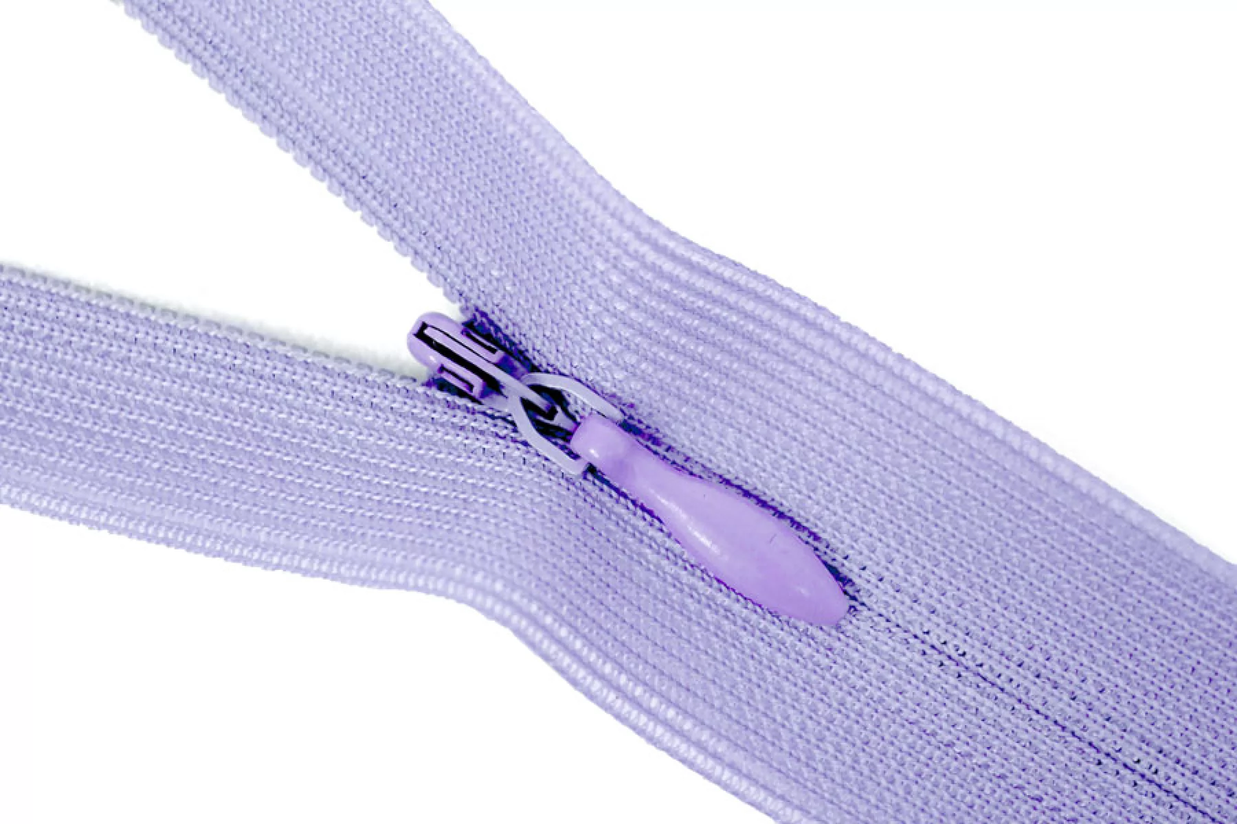 Потайная молния сиреневого цвета , длина 24 см. Неразъемная. Зубцы пластиковые, слайдер и пуллер - металл. Ширина молнии 2 см. Ширина зубцов 4 мм.