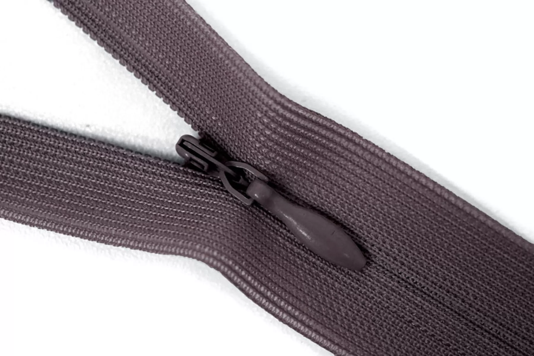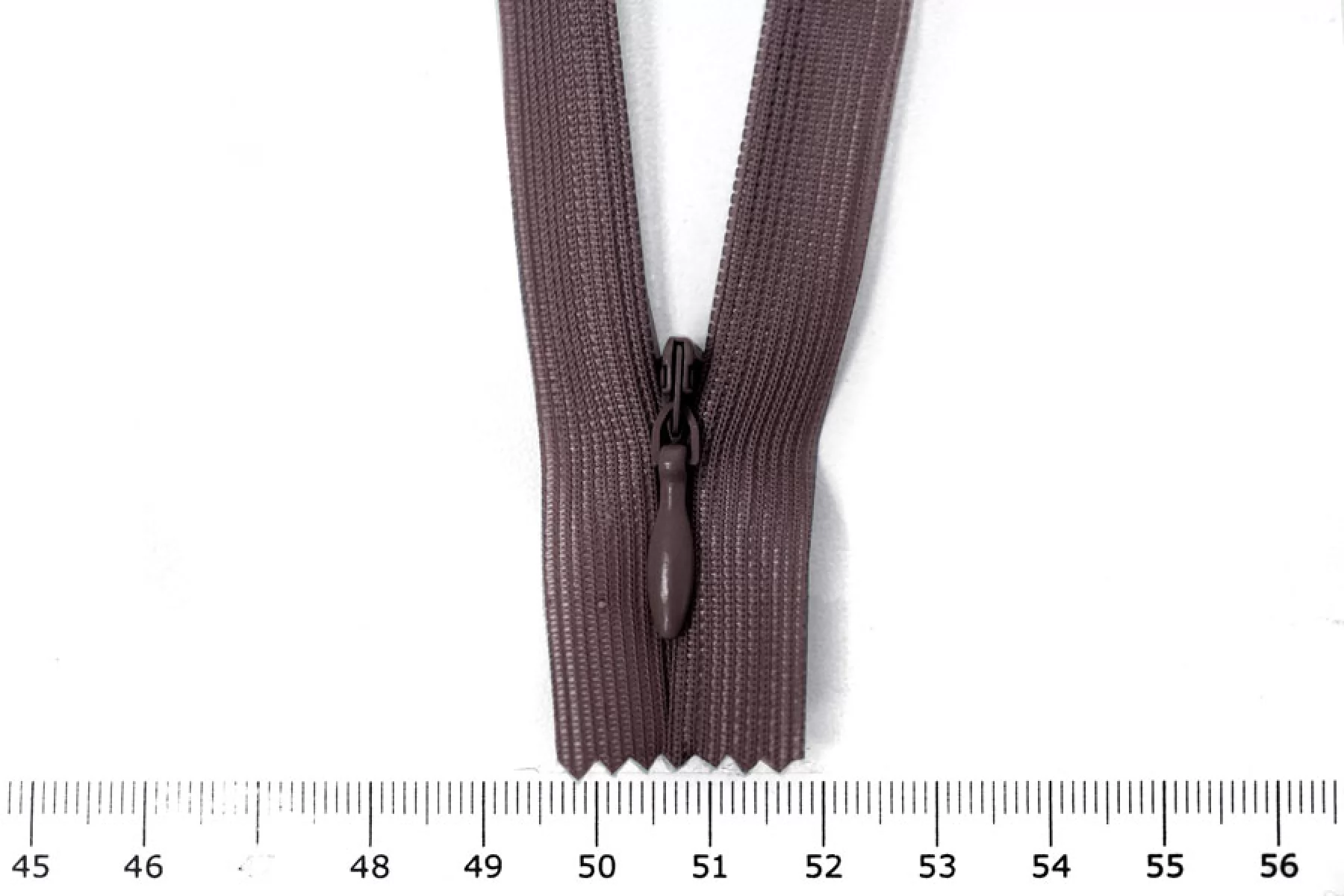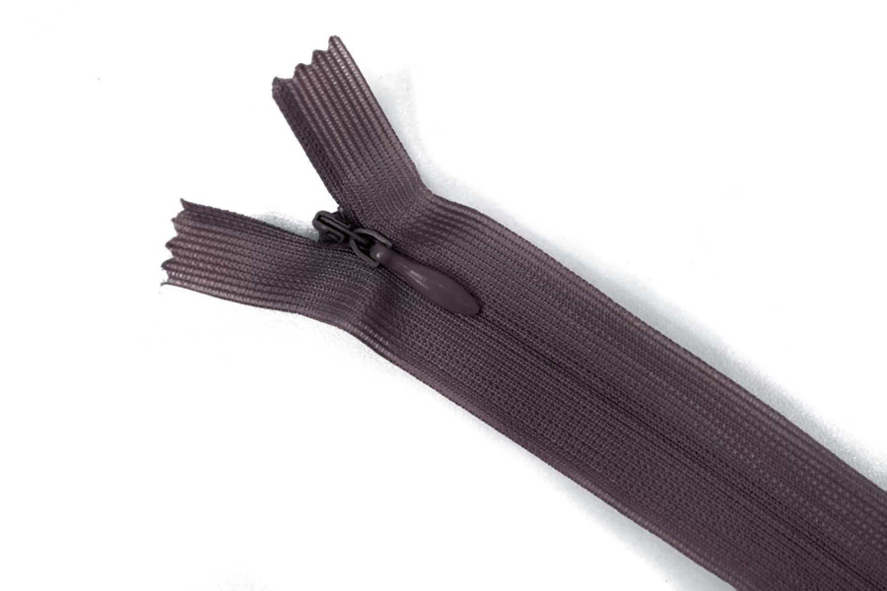 Потайная молния сливового цвета , длина 20 см. Неразъемная. Зубцы пластиковые, слайдер и пуллер - металл. Ширина молнии 2 см. Ширина зубцов 4 мм.