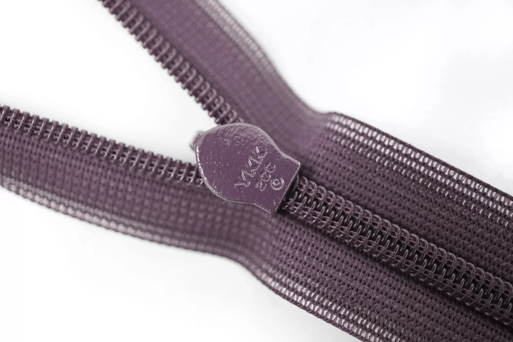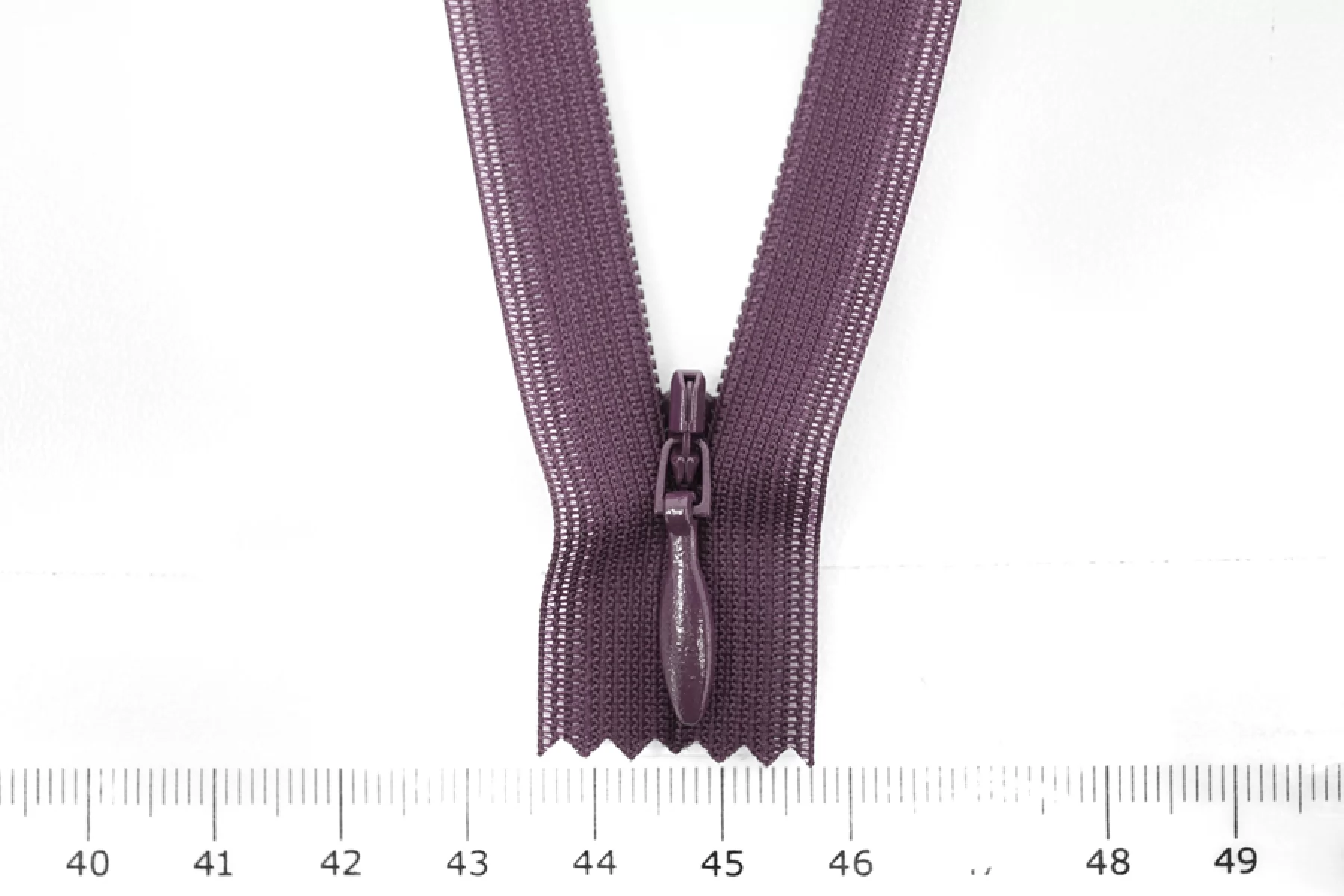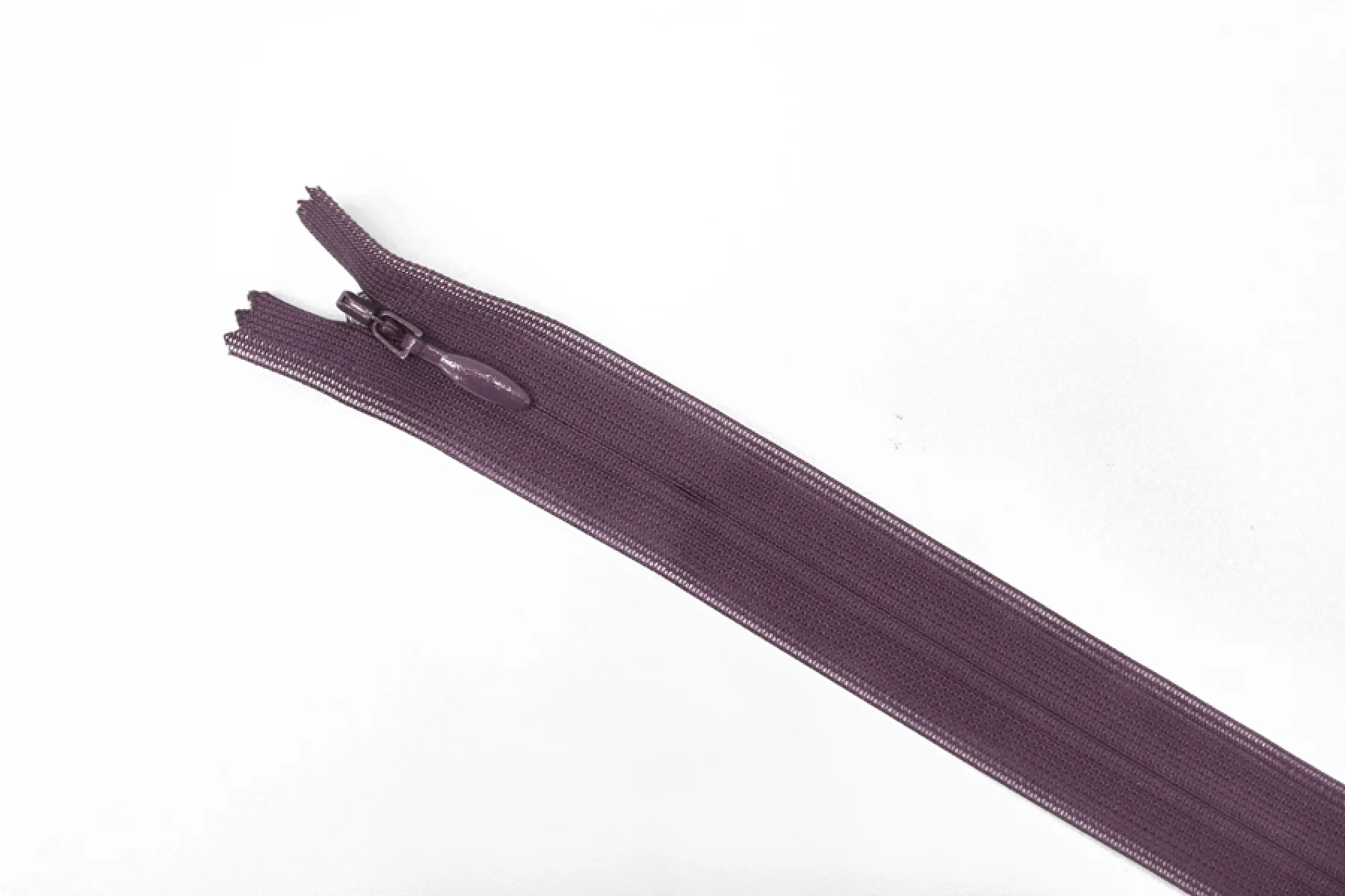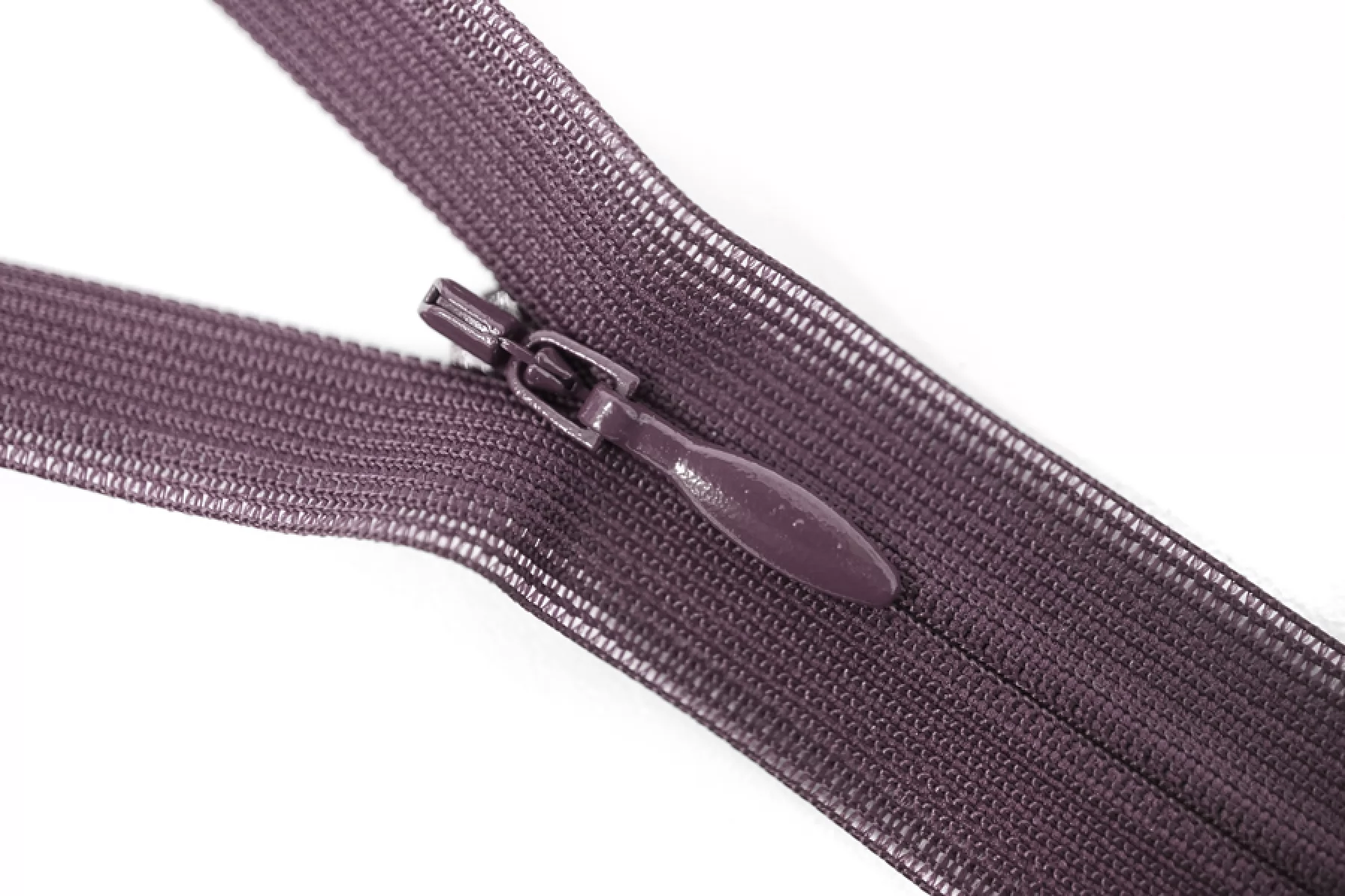 Потайная молния сливового цвета от бренда YKK, длина 54 см. Неразъемная. Зубцы пластиковые, слайдер и пуллер металл сливового цвета. Ширина молнии 2,1 см. Ширина зубцов 5 мм.