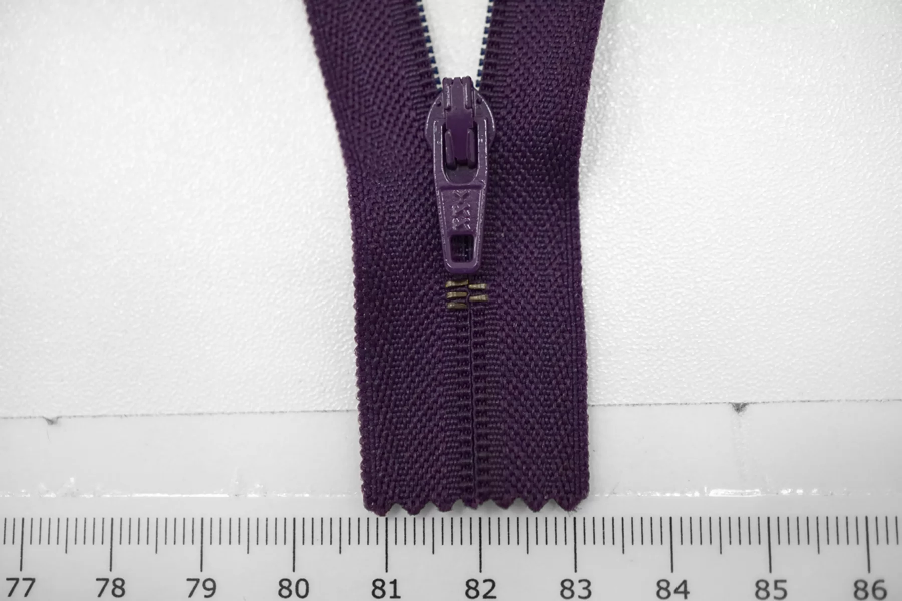 Молния неразъёмная, по сути-потайная, однозамковая, фиолетового цвета от YKK. Длина 55 см.